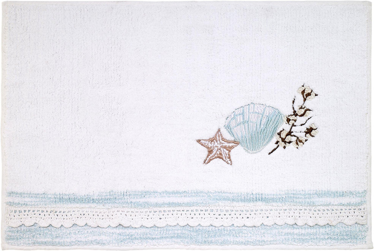 The Avanti Farmhouse Shell Rug features a beautifully embroidered fan shell with starfish and cotton on the vine on a 100% cotton white tufted ground. The rug is bordered with a light blue bottom edge with an attached lace trim. 20 x 30.