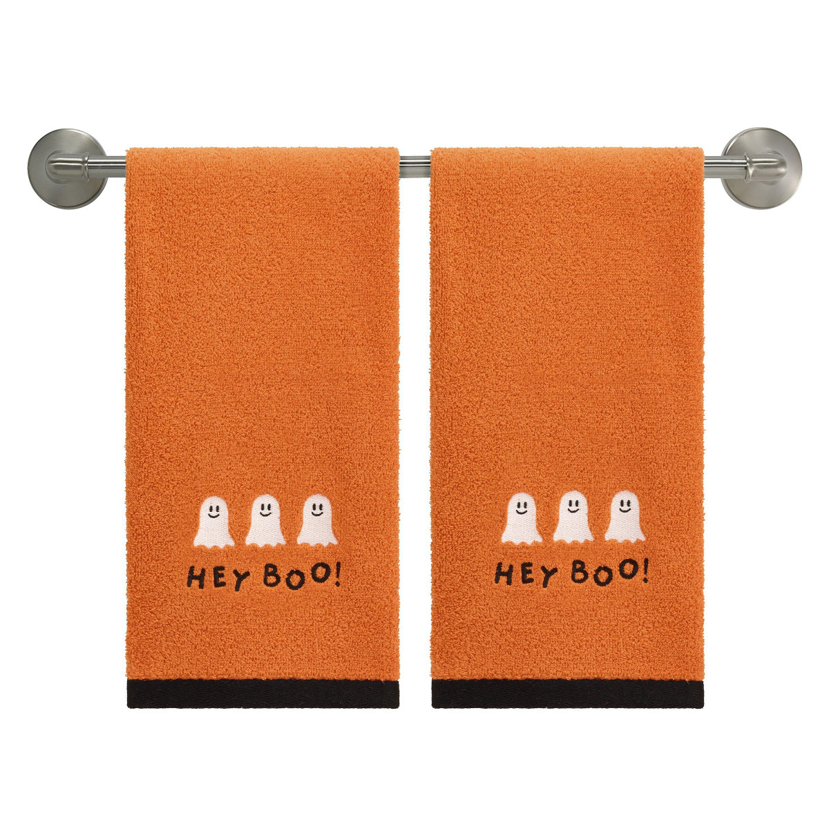 Say Hey Boo! to Halloween charm with this Avanti Hand Towel Set! Featuring three playful white ghosts and the phrase Hey Boo! on vibrant orange cotton terry, each towel is finished with a bold black border. Perfect for adding spooky-cute vibes to your bathroom. Machine washable and full of fun! Each hand towel measures 16 in. x 26 in.