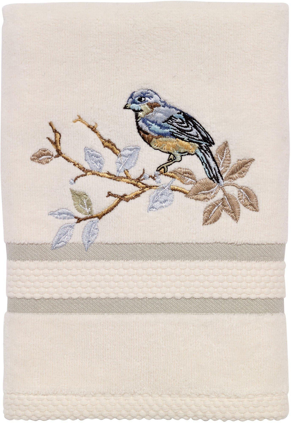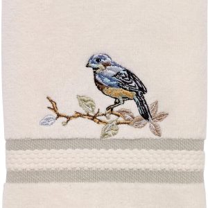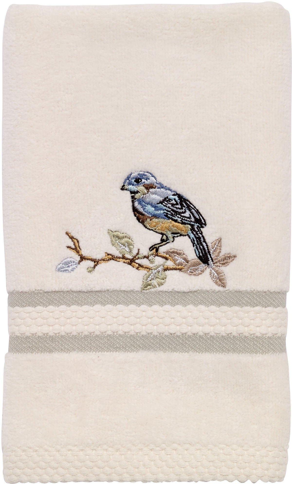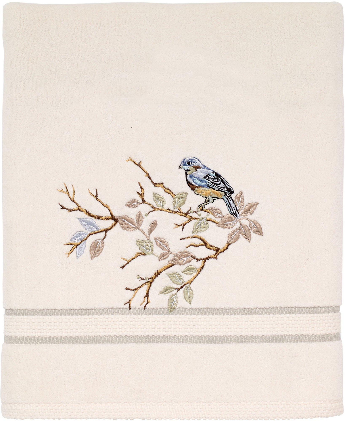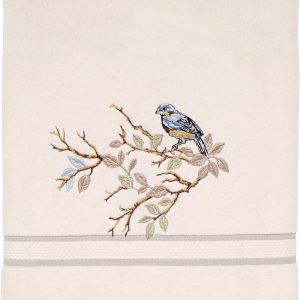Avanti Love Nest Bath Towel features a beautifully embroidered bird sitting on a branch along with textured border with coordinating grey stripe above and below on 100% cotton ivory terry towel. Bath: 27” x 50”, Hand: 16” x 30”, and Fingertip: 11” x 18”.
