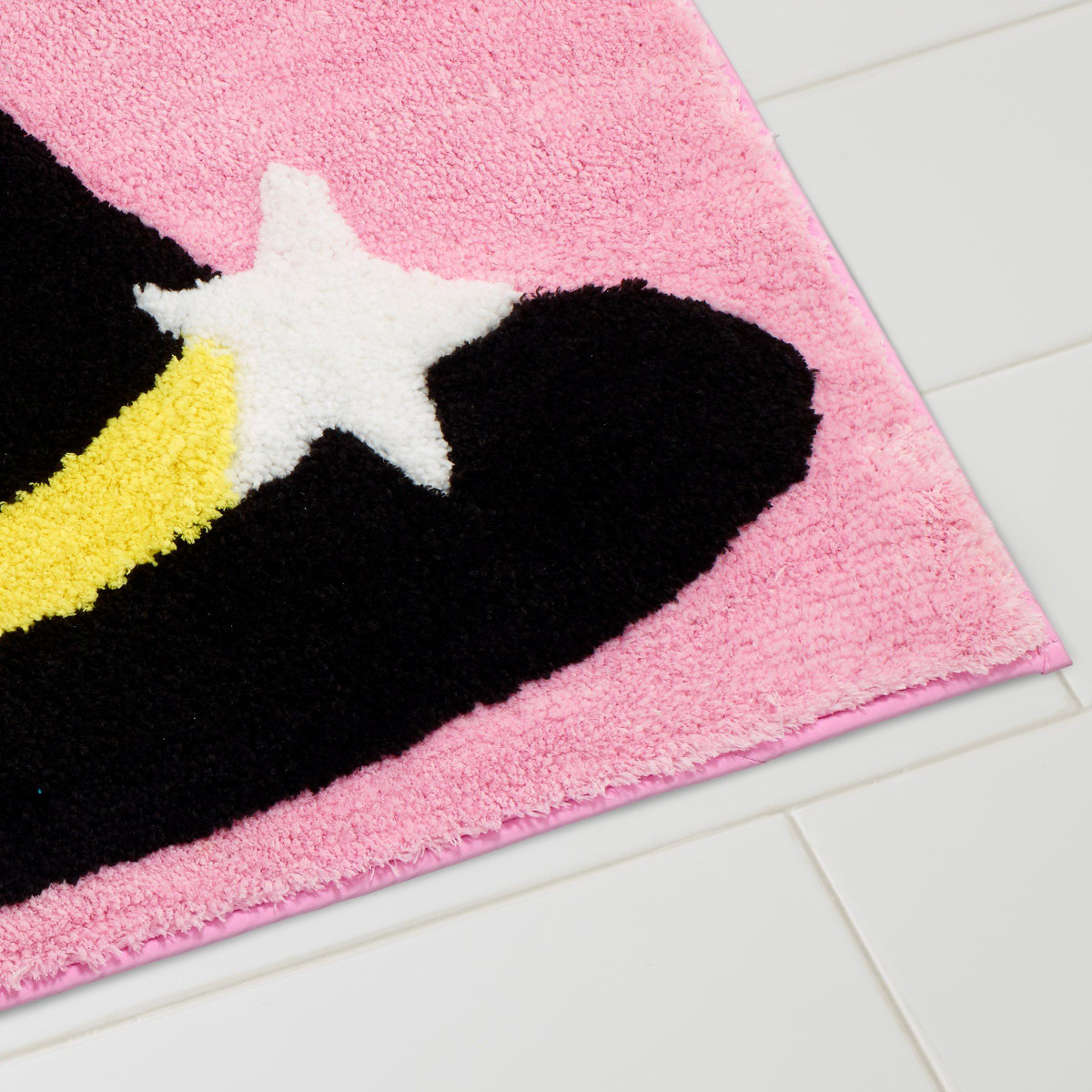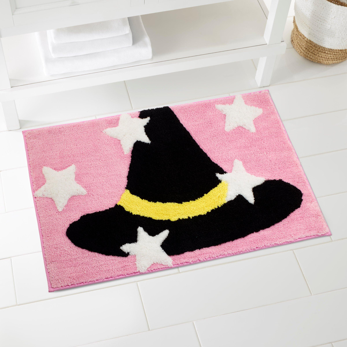 The Avanti Spooky Hat Decorative Halloween Bath Rug features a black witches hat with a yellow band surrounded by white stars on a pastel pink ground. Made of 100% polyester for easy care and brilliant color. The rug measures 20 in. x 32 in. with a latex, non-skid back.