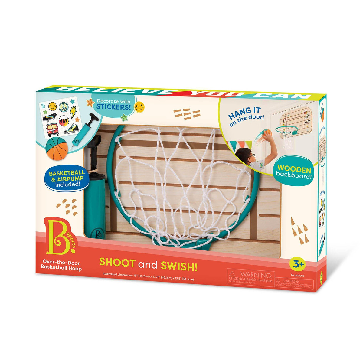 Hang it up and let lil athletes make it their own, then hit that three-pointer! With a wooden backboard and folding hoop, the B. sports basketball net is ready to play air pump and ball included. Ages 3+.