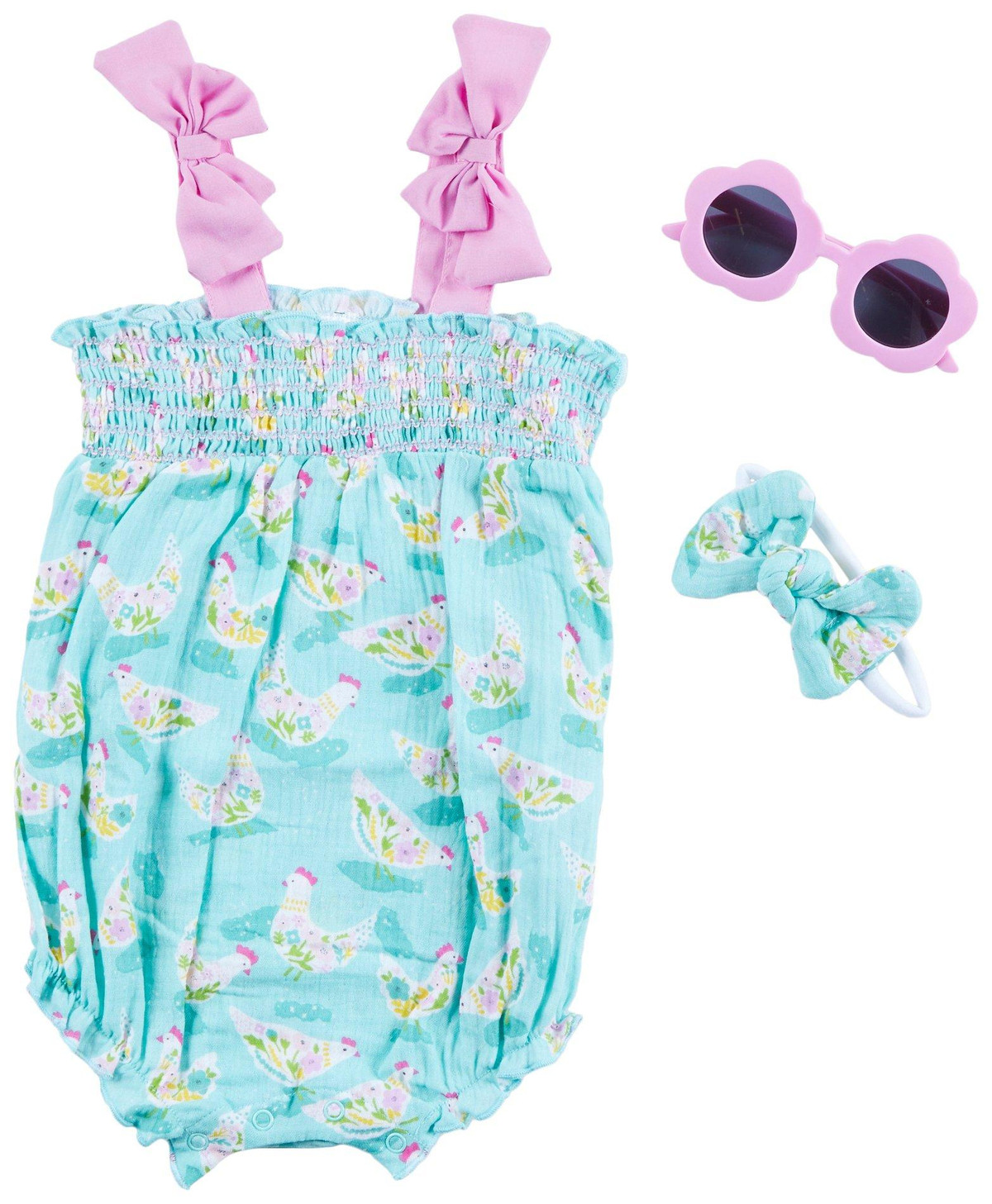 Dress your little one in adorable style with our Baby Girls 3 Pc Gauze Romper Set. Made from soft cotton, this set includes a sleeveless gauze romper featuring a cute chicken print, floral-shaped sunglasses, and a matching chicken print bow. Perfect for a charming and comfortable outfit.