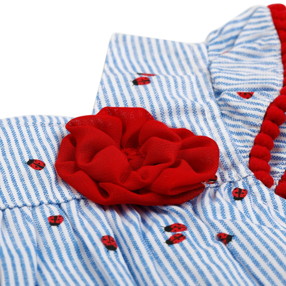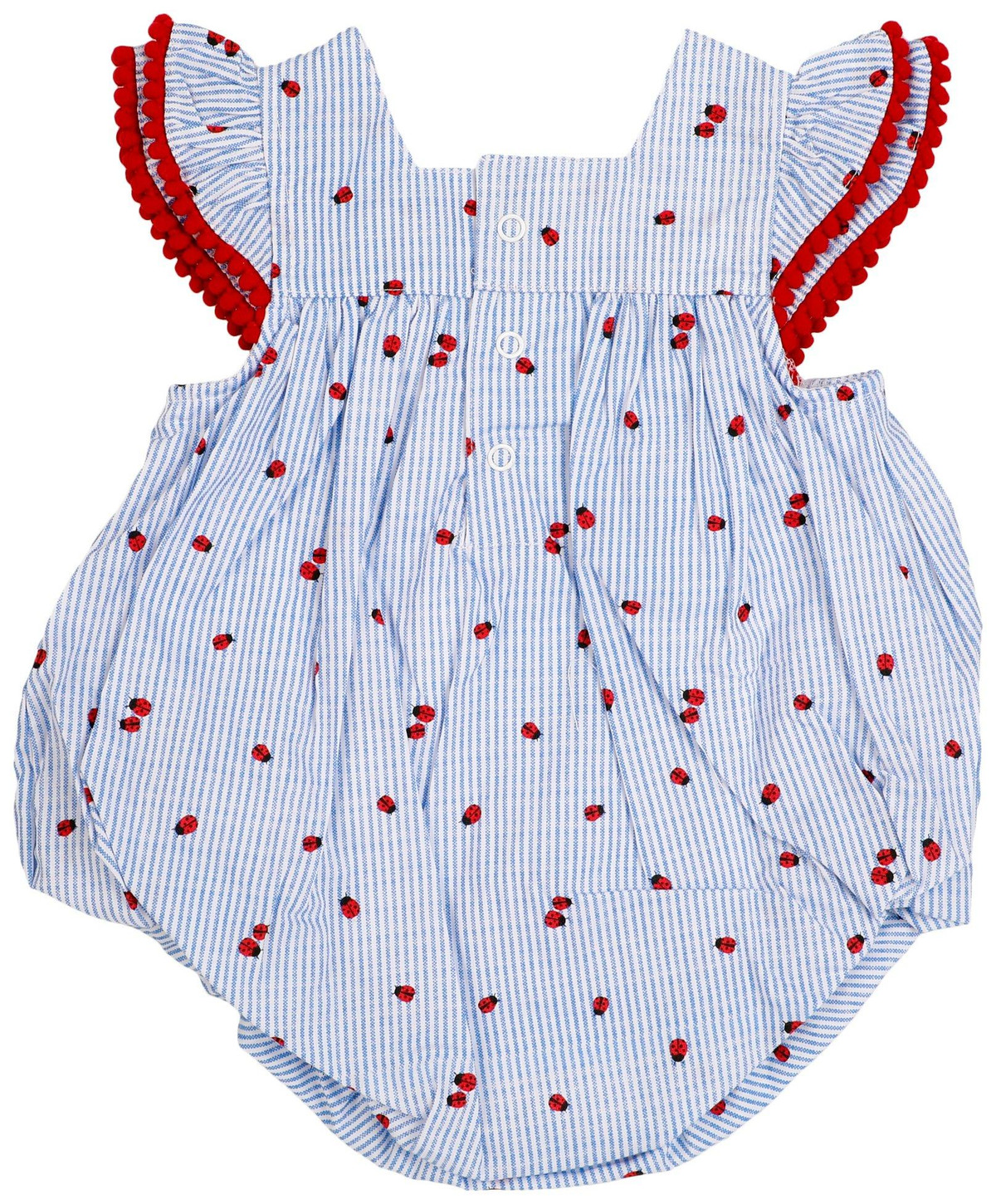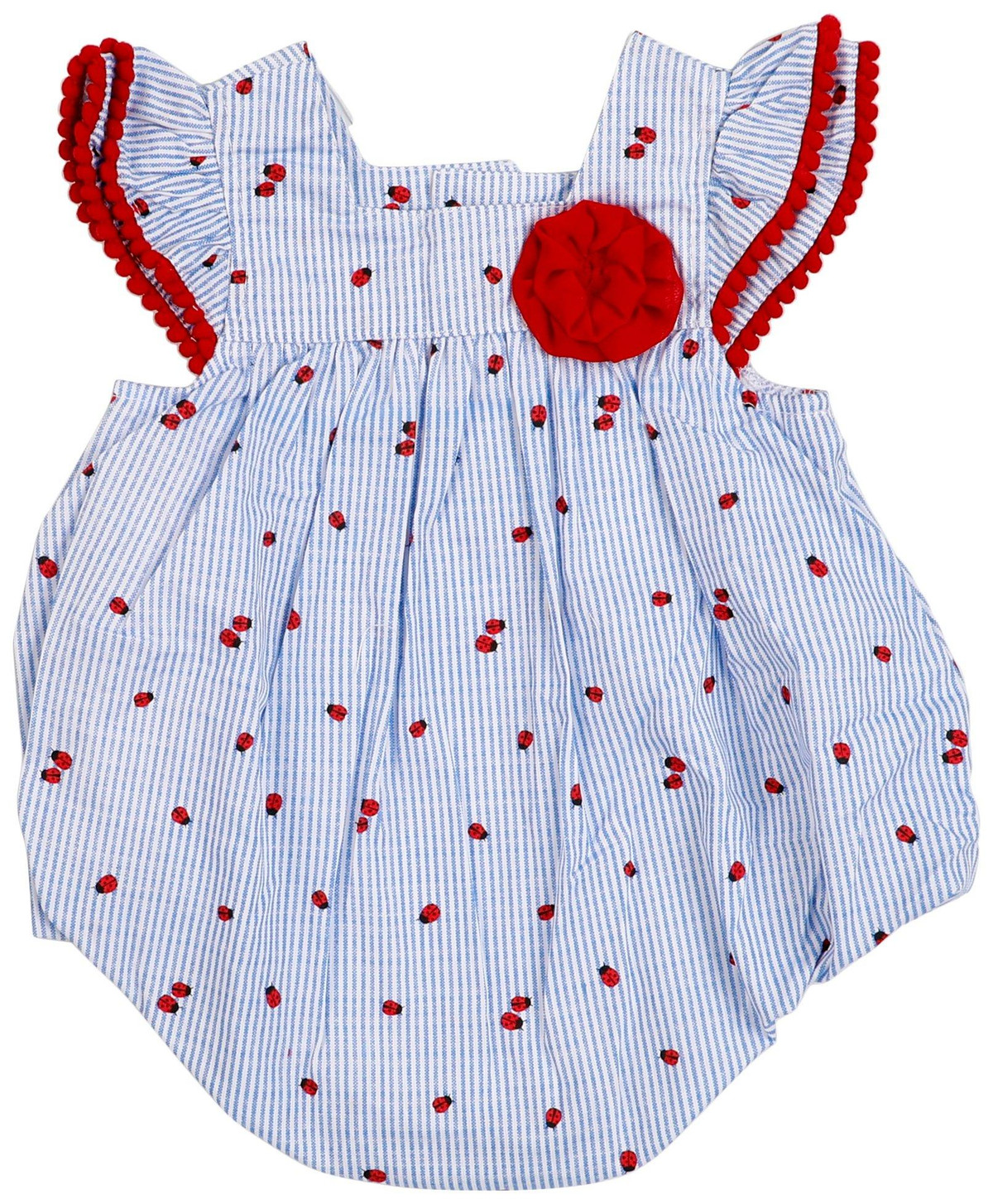 Sweet and ready for play, this short sleeve striped romper is bursting with charm! Made from soft, breathable fabric and featuring shoulder ruffles, a matching flower detail, a snap button back and bottom for easy changes, it’s perfect for sunny days and sweet adventures. Fabrication is Shell: 100% cotton, Lining: 100% polyester. Length measures approximately 15 in.