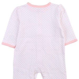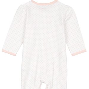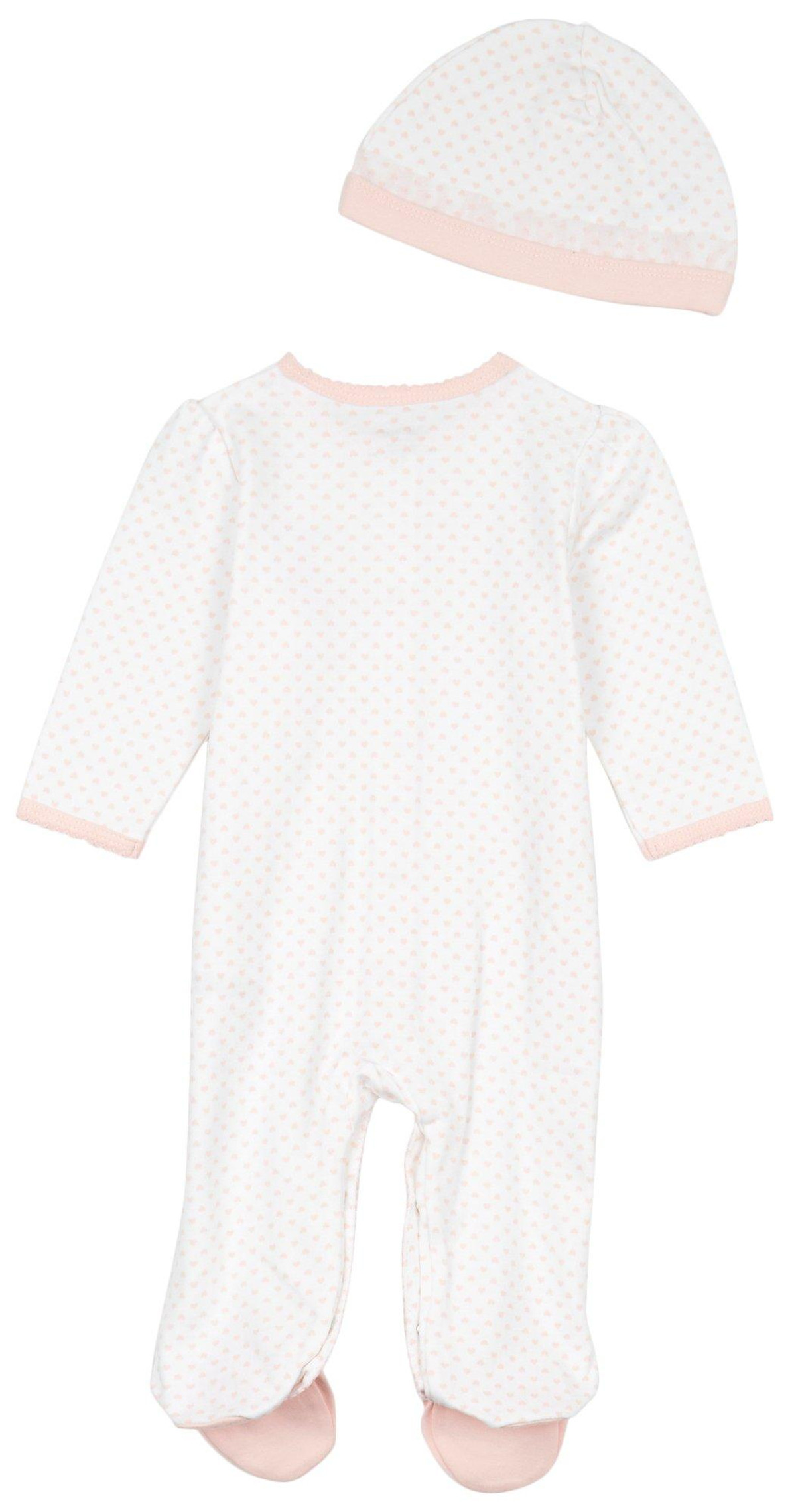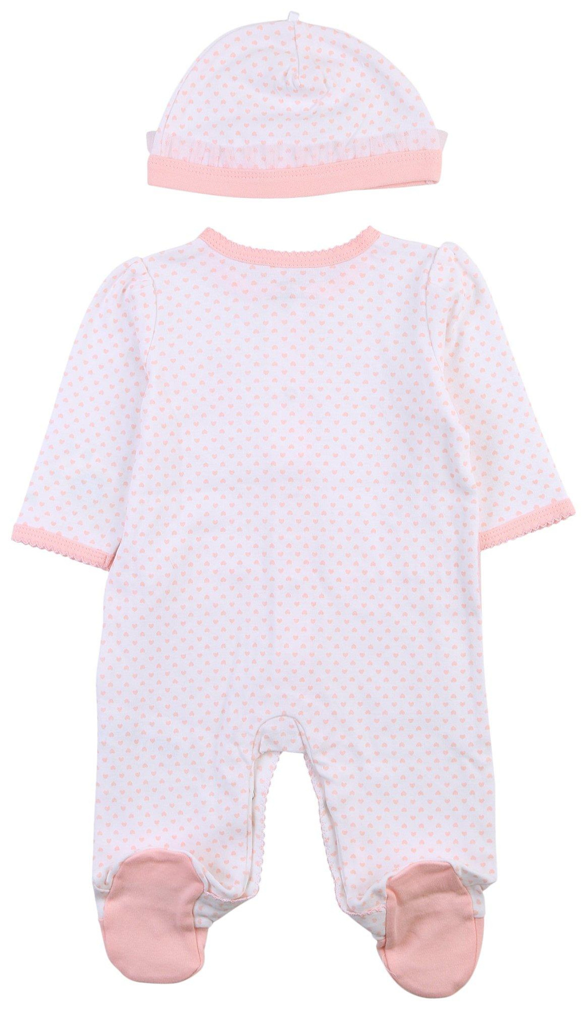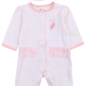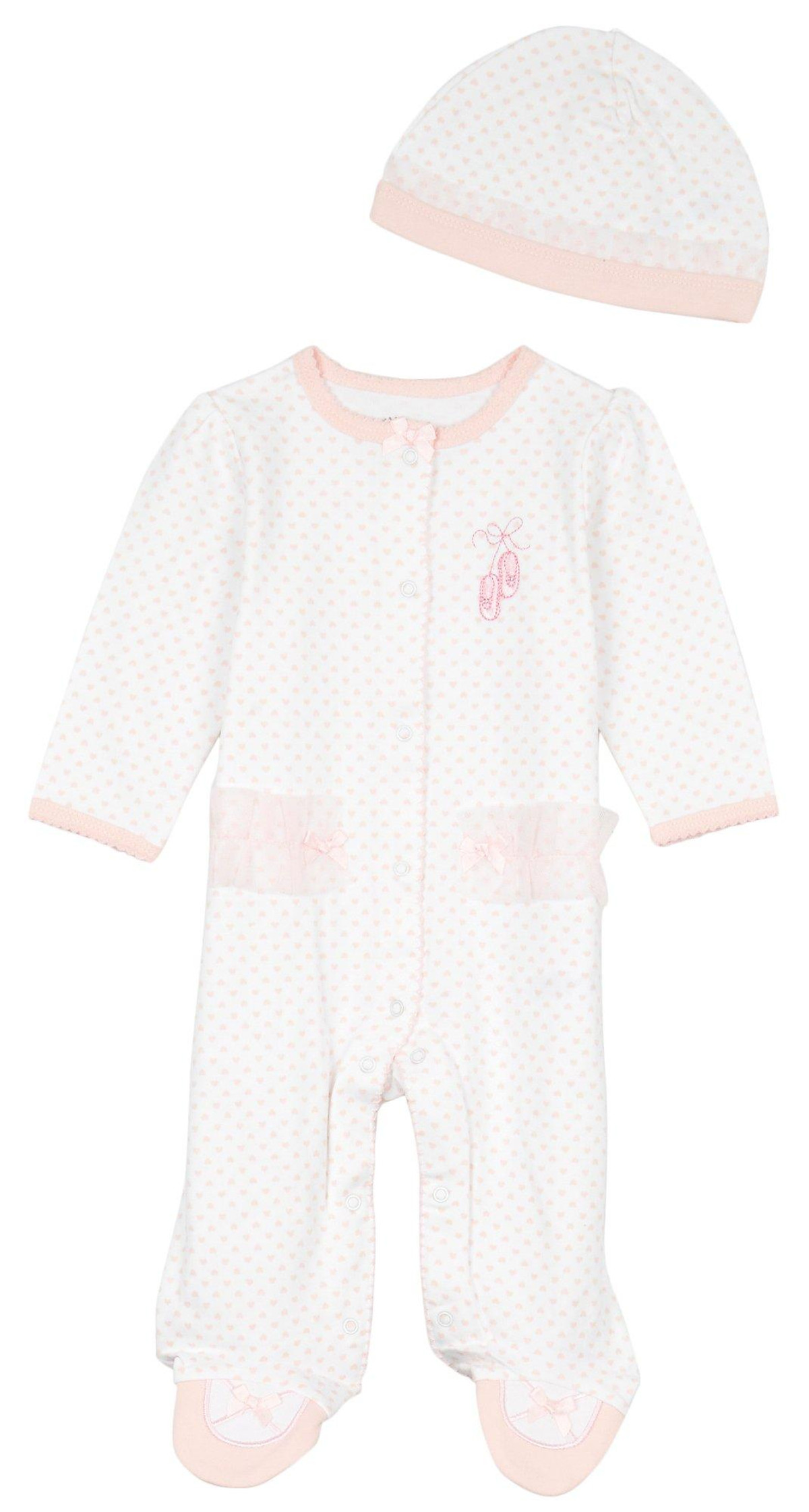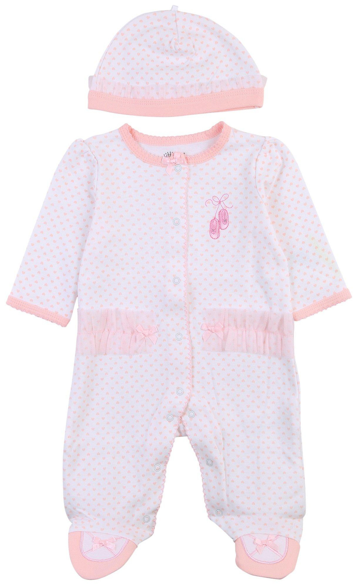 This footed sleeper from Little Me is a cute and cozy piece for your baby girl! It features a stylish polka dot print, a full front snap button closure, an embroidered ballerina slipper design and a matching hat. Fabrication is 100% cotton.