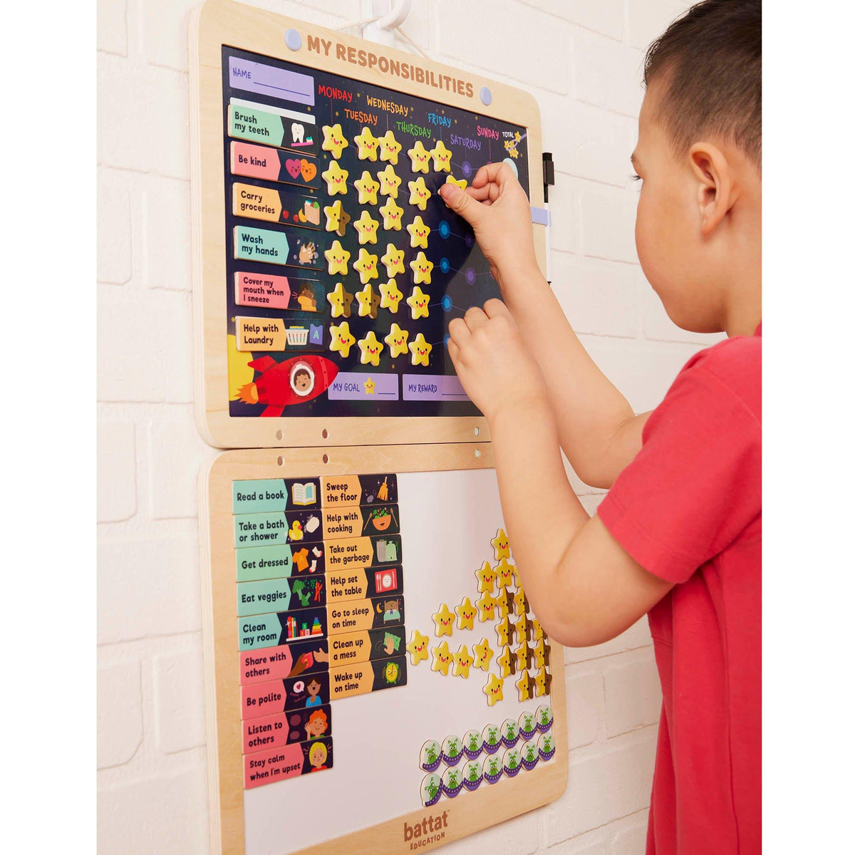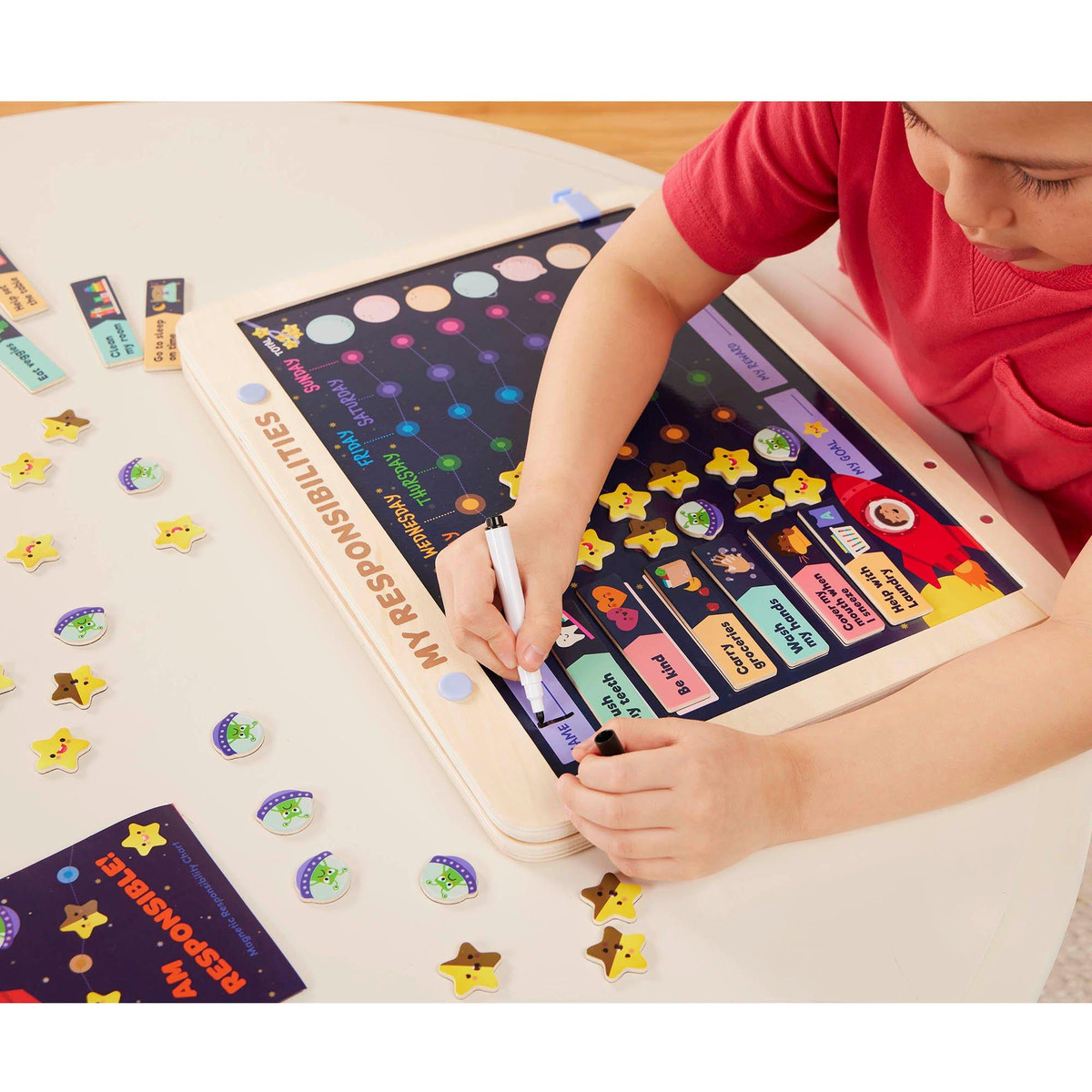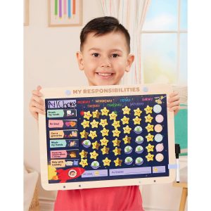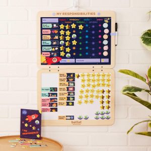 With Battat Educations I Am Responsible! little ones can take a trip through outer space and reach goals at their own pace! This space-themed magnetic responsibility chart can help your kiddo work on 3 types of responsibilities: personal, communal, and social skills. Ages 3+