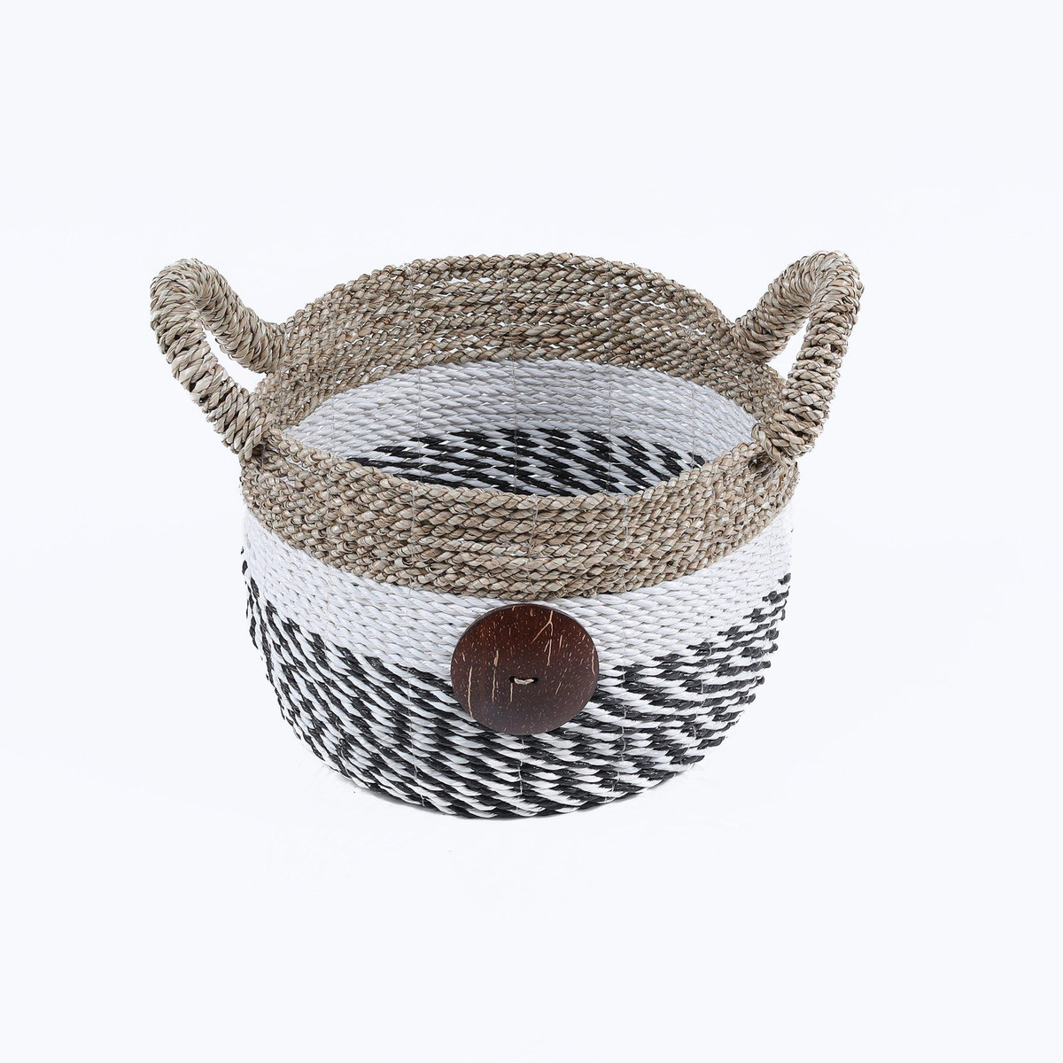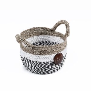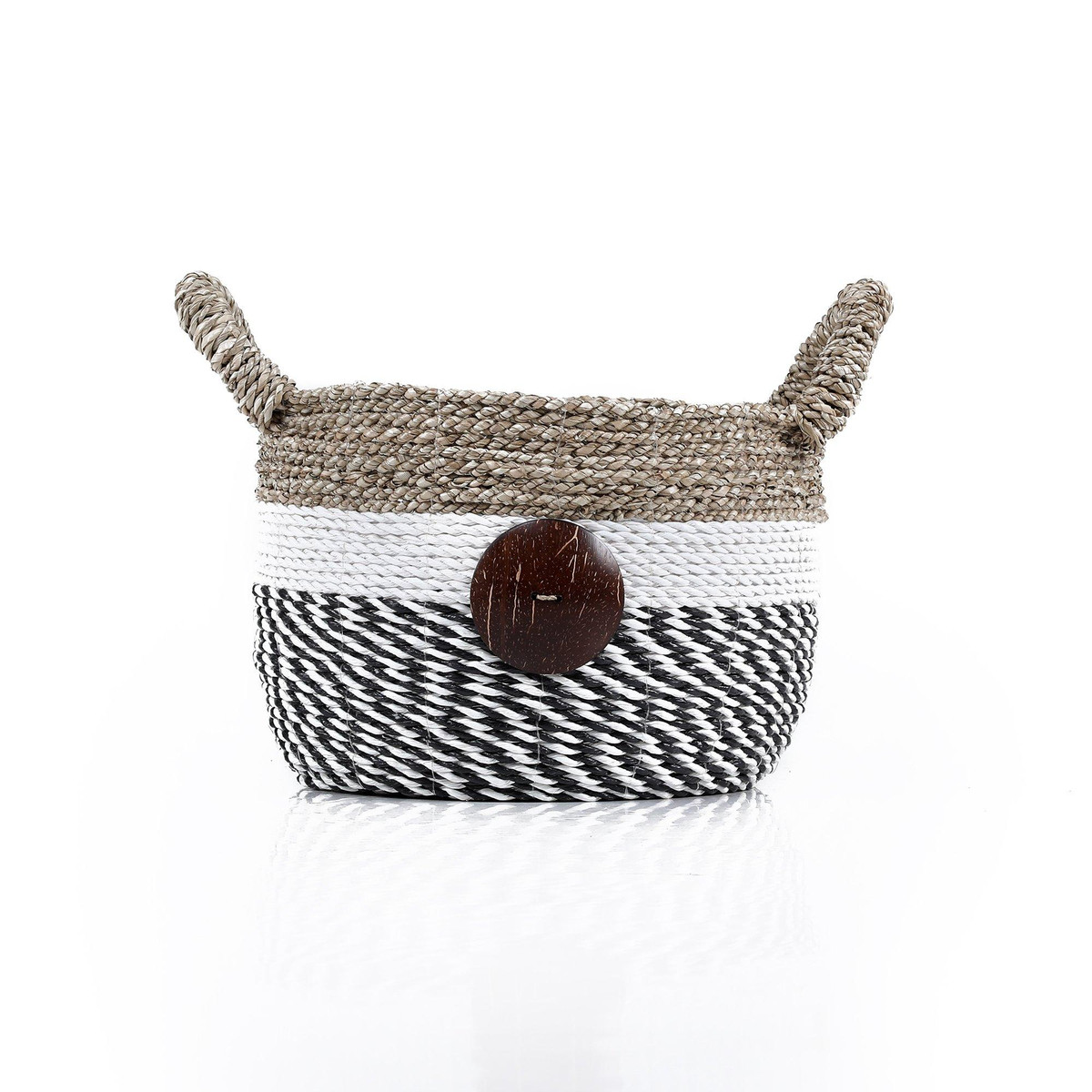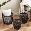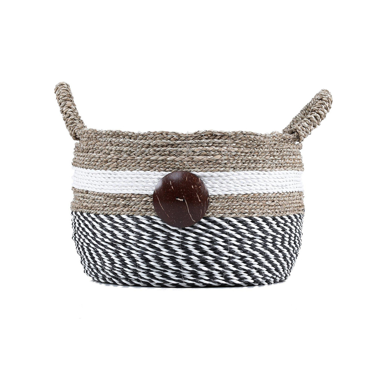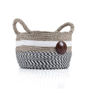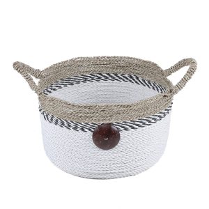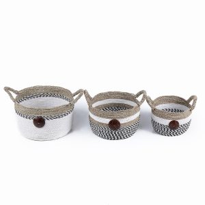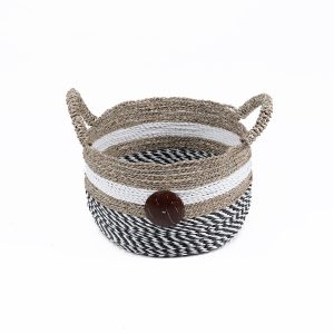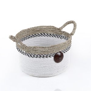 This set of three Round Raffia and Seagrass with Cocoa Buttons combine the earthy textures of raffia and seagrass with the unique charm of coconut shell button details, making them stylish and practical. Perfect for organizing any space. Their neutral tones and artisanal design blend seamlessly with any decor, from modern minimalist to cozy farmhouses. Large- 16.1 in. x 16.1 in. x 11 in., Medium – 13.4 in. x 13.4 in. x 9.4 in., Small 11 in. x 11 in. x 7.9 in.