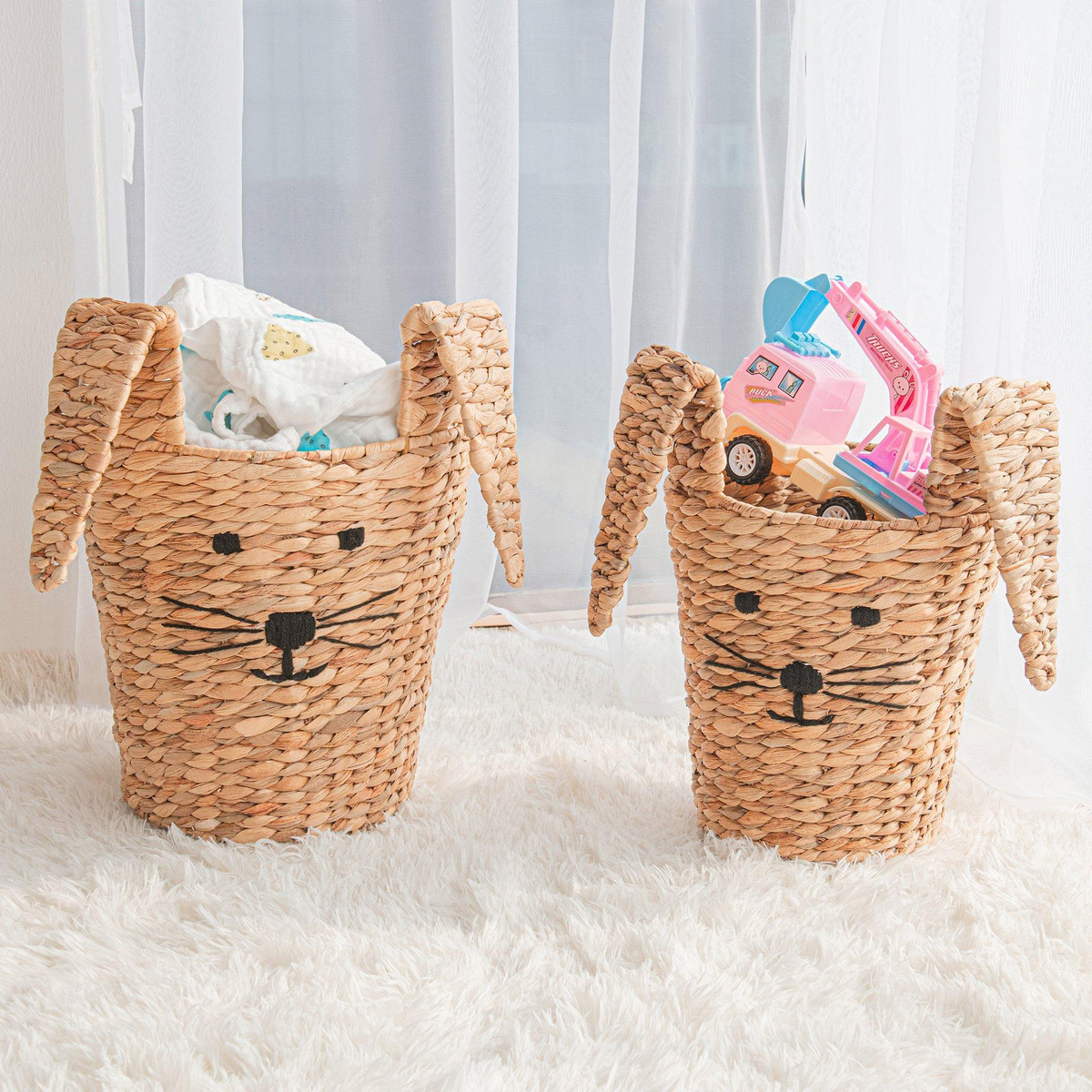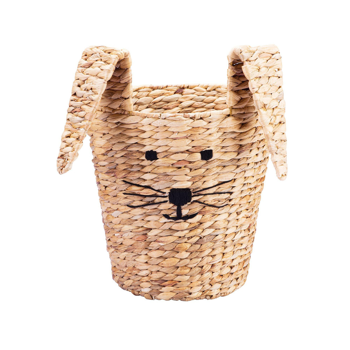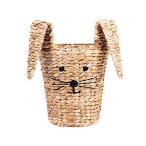 Welcome some whimsy into your home with this fun-faced Set of Two Round Bunny Baskets. The natural shade of the durable water hyacinth makes this set suitable for almost any decor. Designed with adorable bunny face accents, this set of three storage baskets offer a playful solution for keeping items throughout the home organized and out of sight. Bin – 12.2 in. x 12.2 in. x 12.2 in. Wastebasket – 9.8 in. x 9.8 in. x 9.8 in. Measures 24 in. x 14 in. x 16 in.