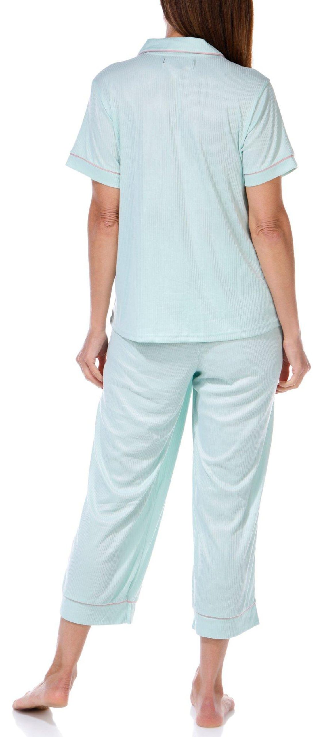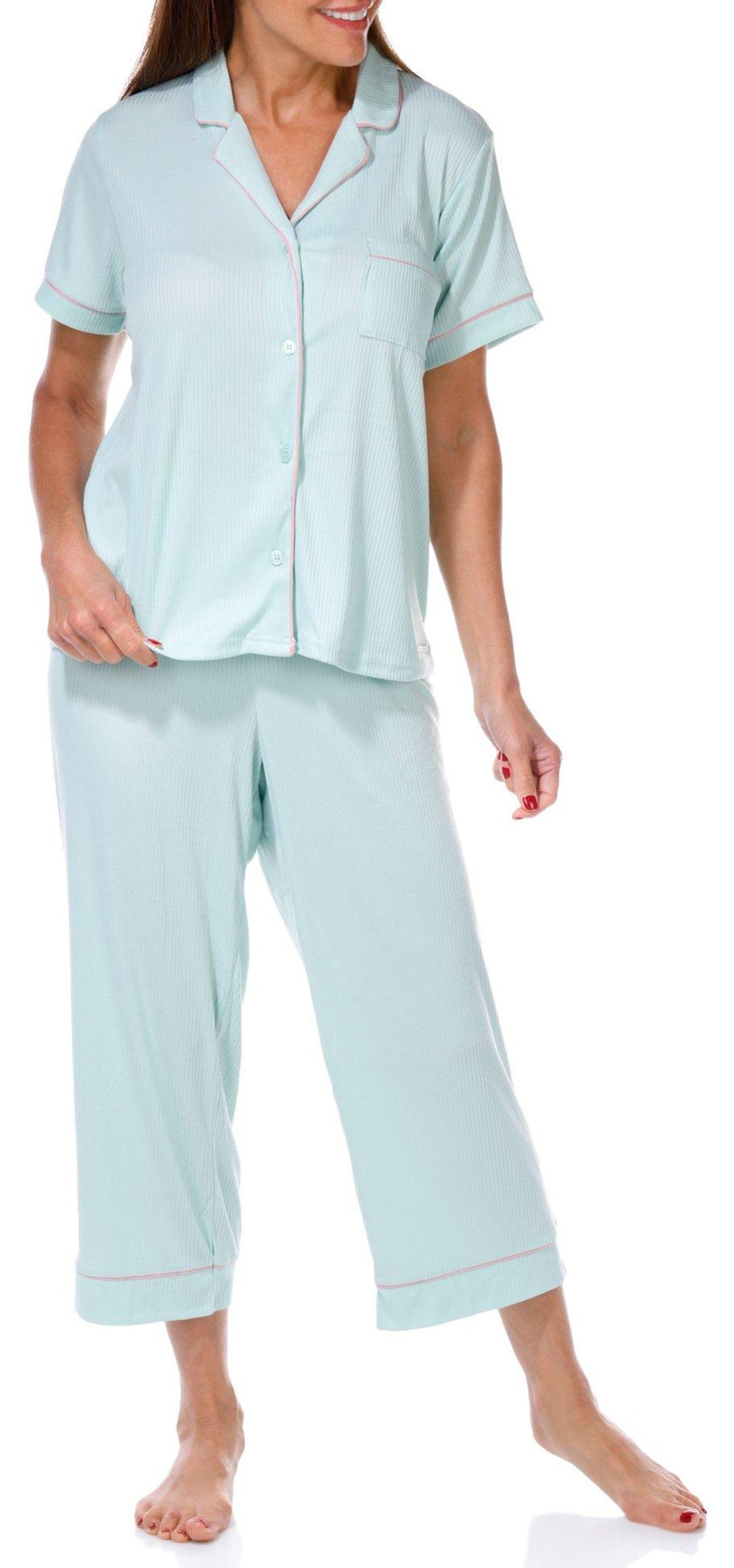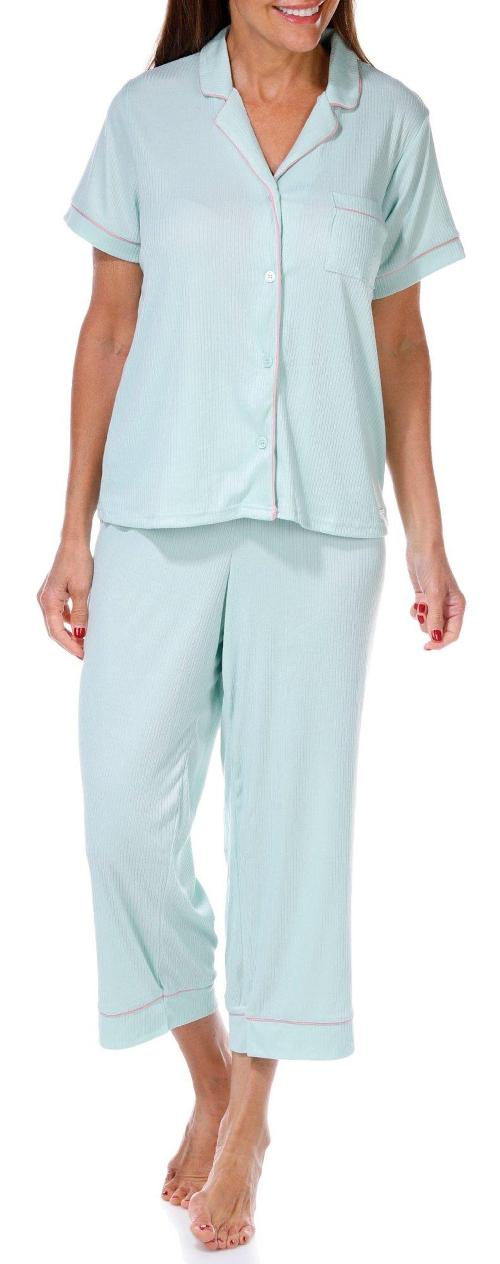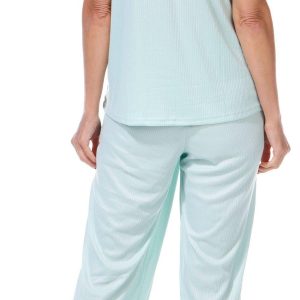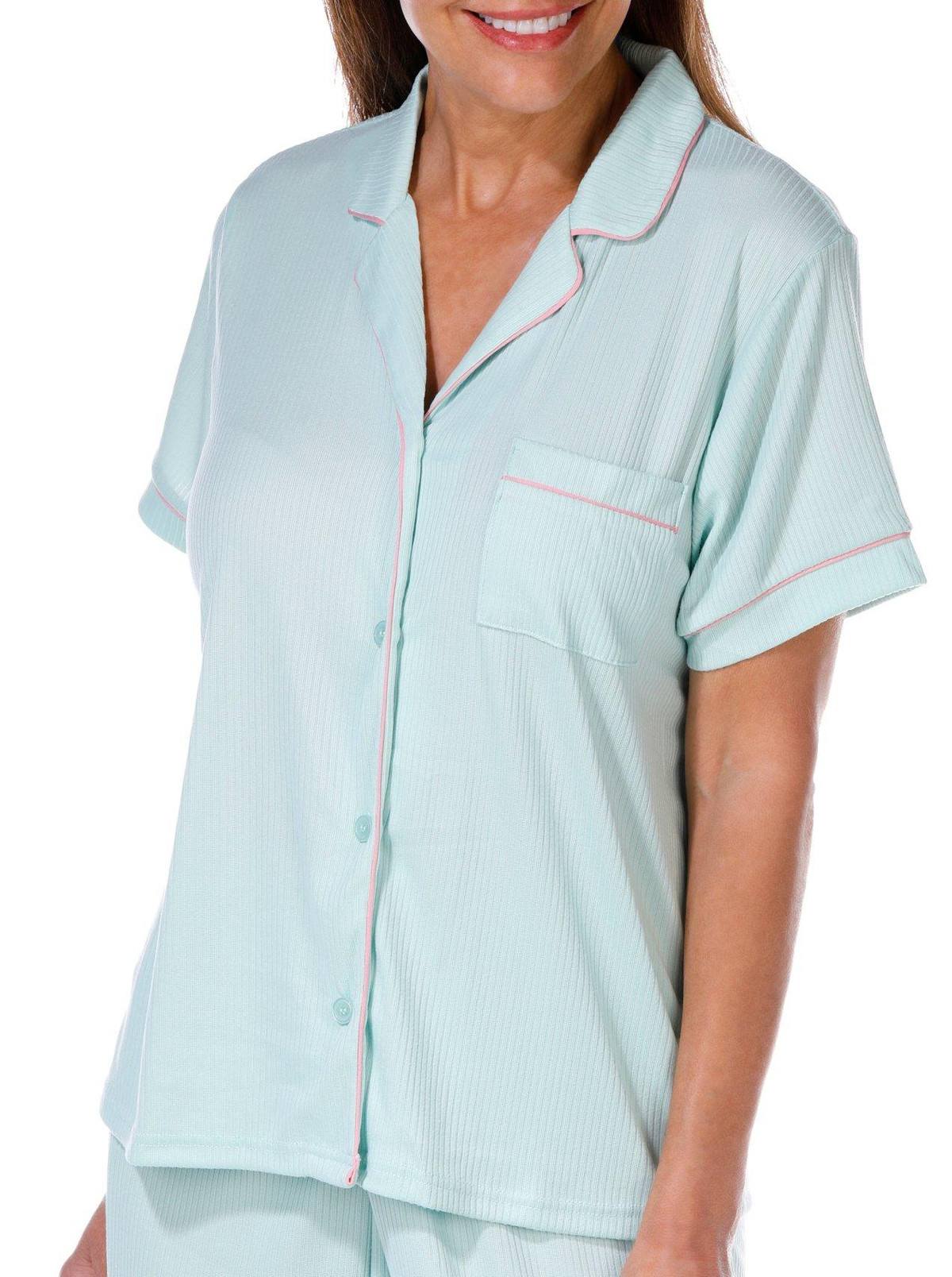Unwind in effortless style with the Womens 2-Pc Ribbed Pants Sleepwear Set. Featuring a soft, solid ribbed texture with contrast pink piping, the button-down top includes a chest pocket for a classic touch, while the matching pants offer a comfy elastic waistband for a perfect fit. Fabrication 95% polyester, 5% spandex