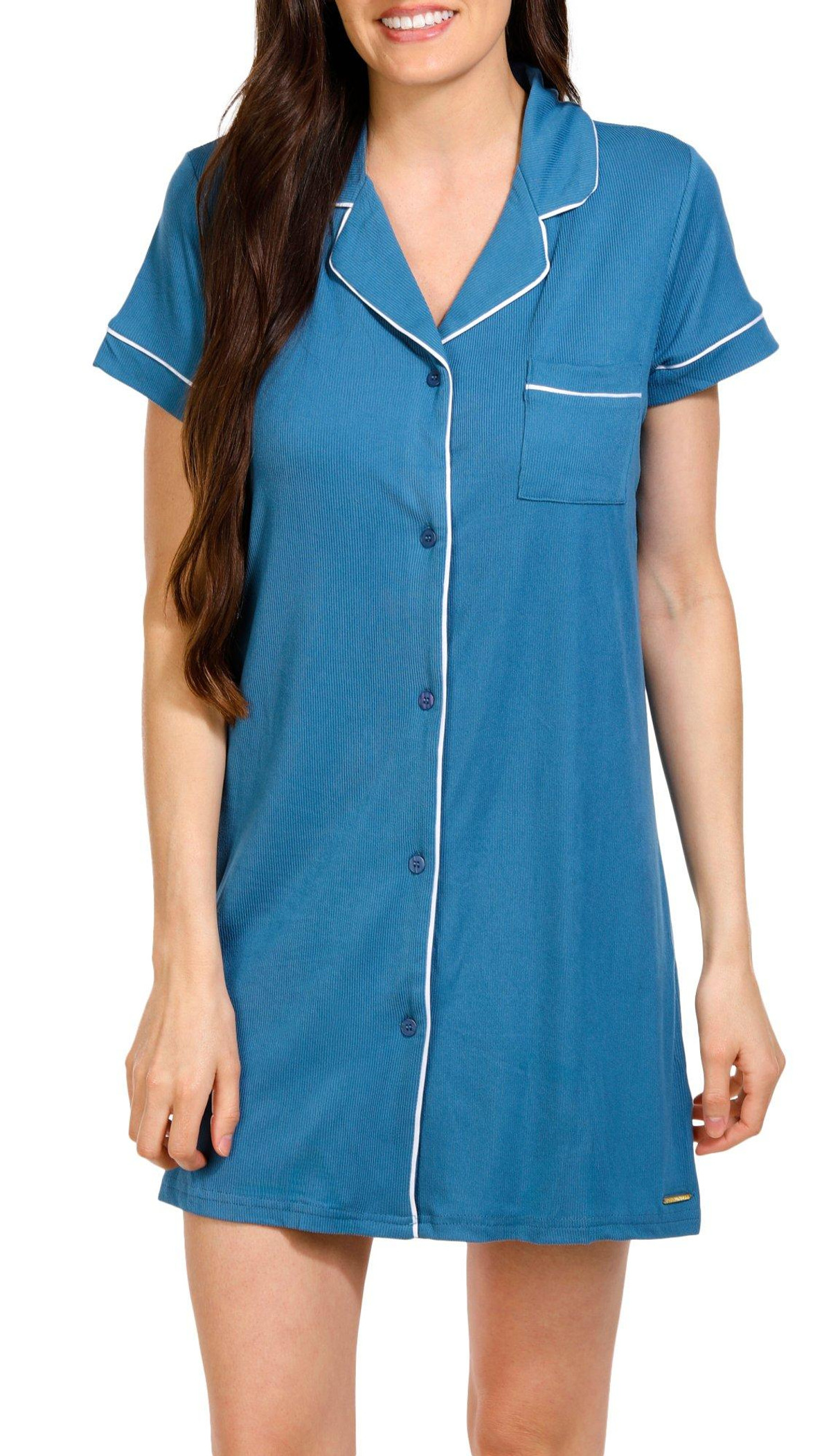Introducing our Women’s Short Sleeve Notch Collar Sleepshirt, crafted from a comfortable blend of polyester and spandex. This stylish sleepshirt features a solid color, a button-down front, a collared neckline, and a convenient chest slip pocket. Perfect for a cozy night’s sleep or lounging at home, it combines classic design with modern comfort.