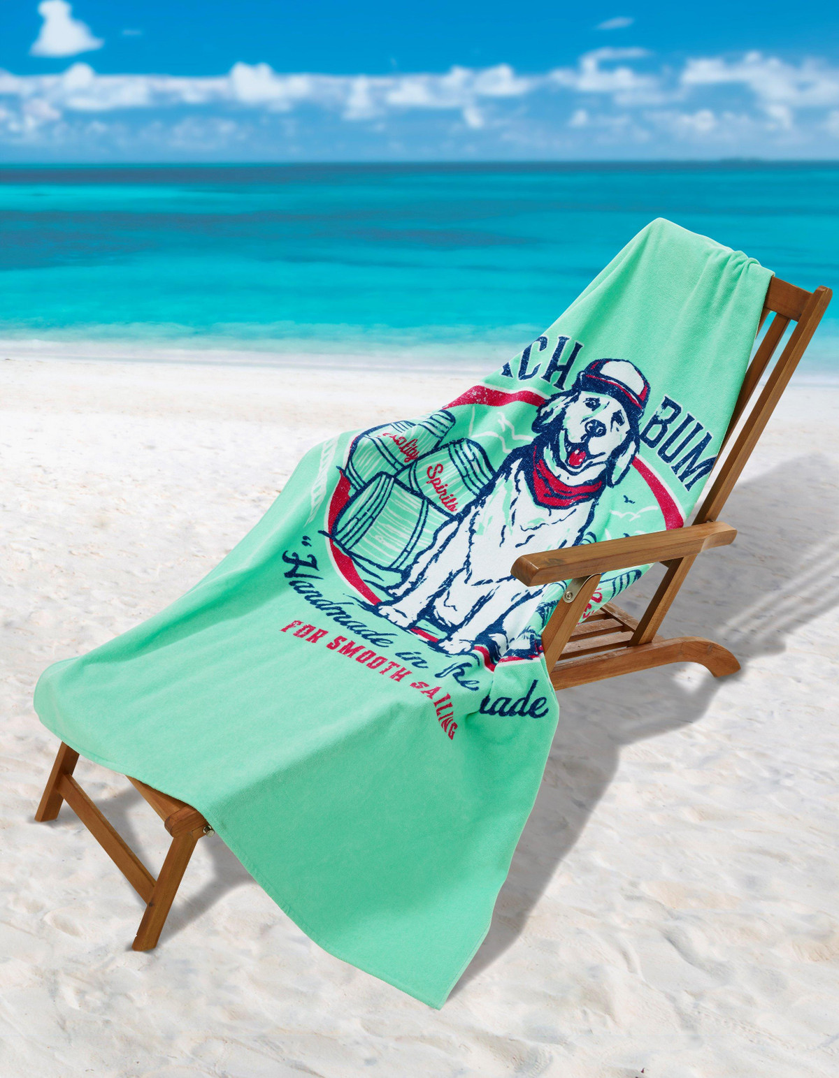 The Izod Beach Bum Beach Towel features a Golden Retriever surrounded by casks of an adult beverage with Beach Bum Rum and Handmade in the Shade printed on an oversized 40 x 70 on a mint green ground. 100% cotton sheared velour face, terry back. Perfect for the dog (and rum) lovers out there!!