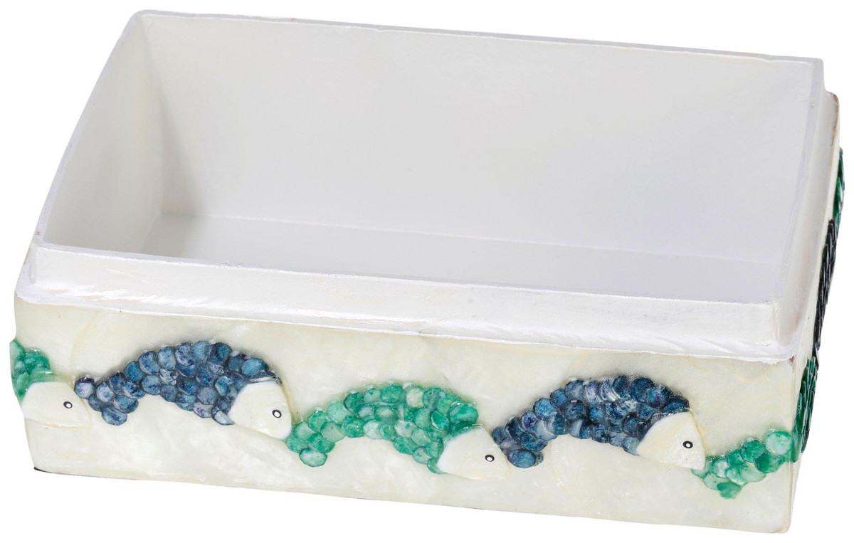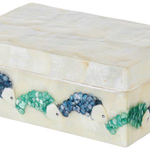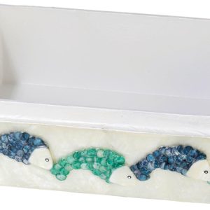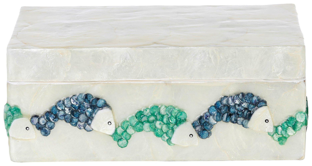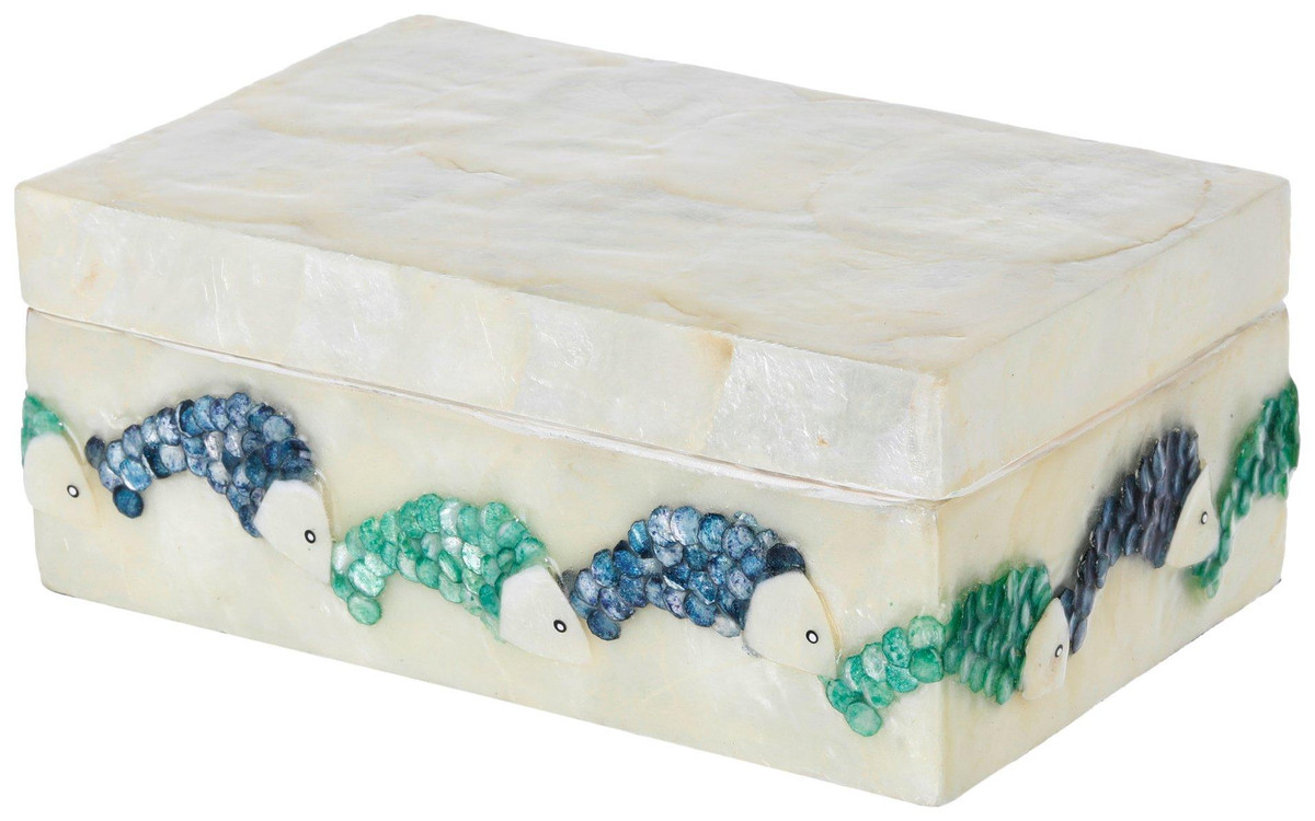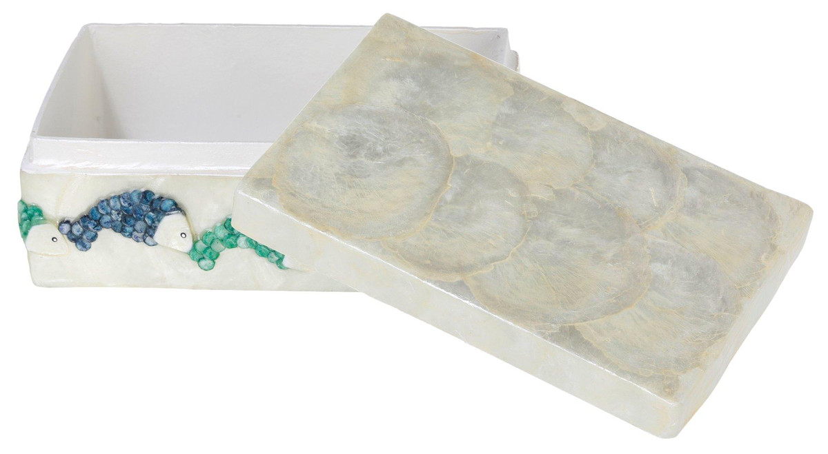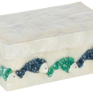 Brighten coastal spaces with the 8 in Capiz Fish Decorative Box. Surrounded by shimmering capiz shell fish in soft ocean hues, this charming box adds a seaside touch to shelves, vanities or entryway tables. Ideal for storing jewelry, keys or keepsakes, it combines function with breezy nautical style. Measures approximately 8 in x 5 in x 3 in.
