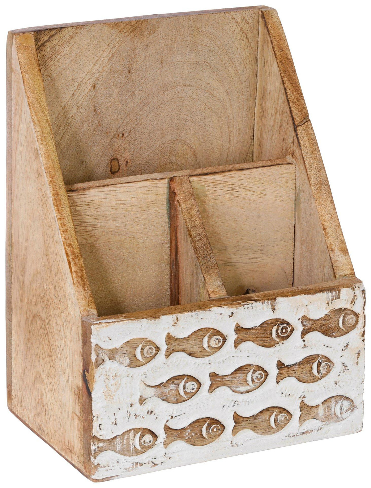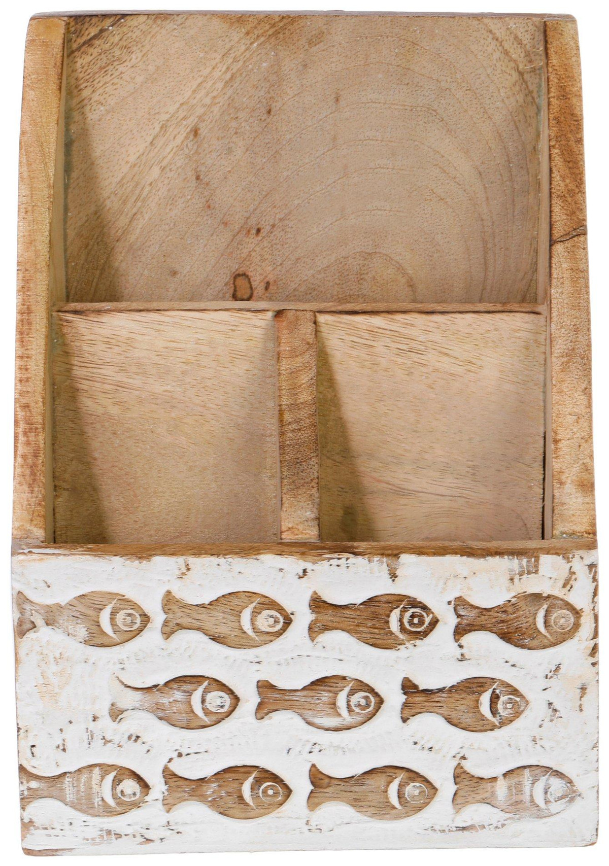 Stay organized with coastal ease using the Wood Fish Decorative Letter Holder. Featuring a whitewashed finish and carved brown fish, it offers three sectionstwo for pens or small items and one for letters. A practical accent for entryways or home offices, it brings a touch of the sea to everyday organization. Measures approximately 6 in x 4 in x 8 in.