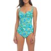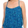 A slimming and flattering tankini top gets a playful ruffle trim neckline. Splashed with a colorful and whimsical print on soft, textured, pique fabric. Features a floating bra and removable soft cups.
