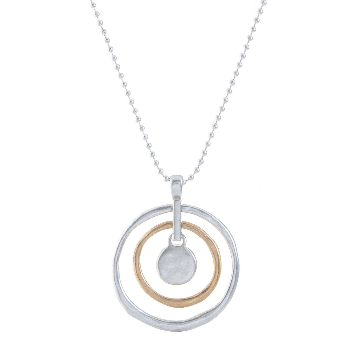 Add dimension to your style with the 2 Tone Multi Rings Pendant Necklace. Featuring layered rings in contrasting silver and gold tones, this versatile necklace brings modern sophistication to any outfit. Perfect for layering or wearing solo, its an everyday statement piece that complements both casual and dressy looks.