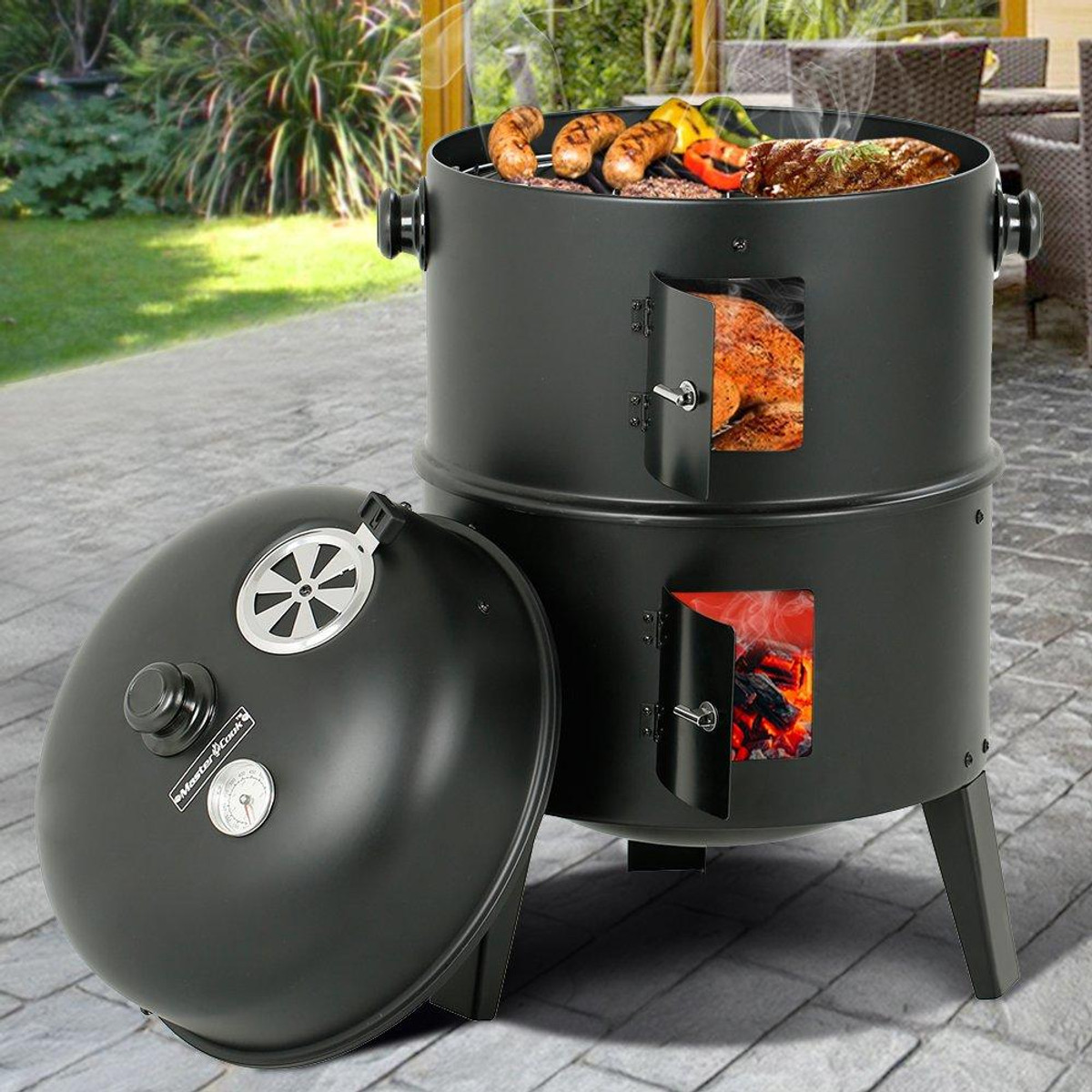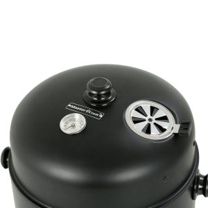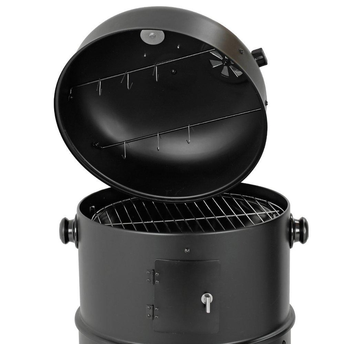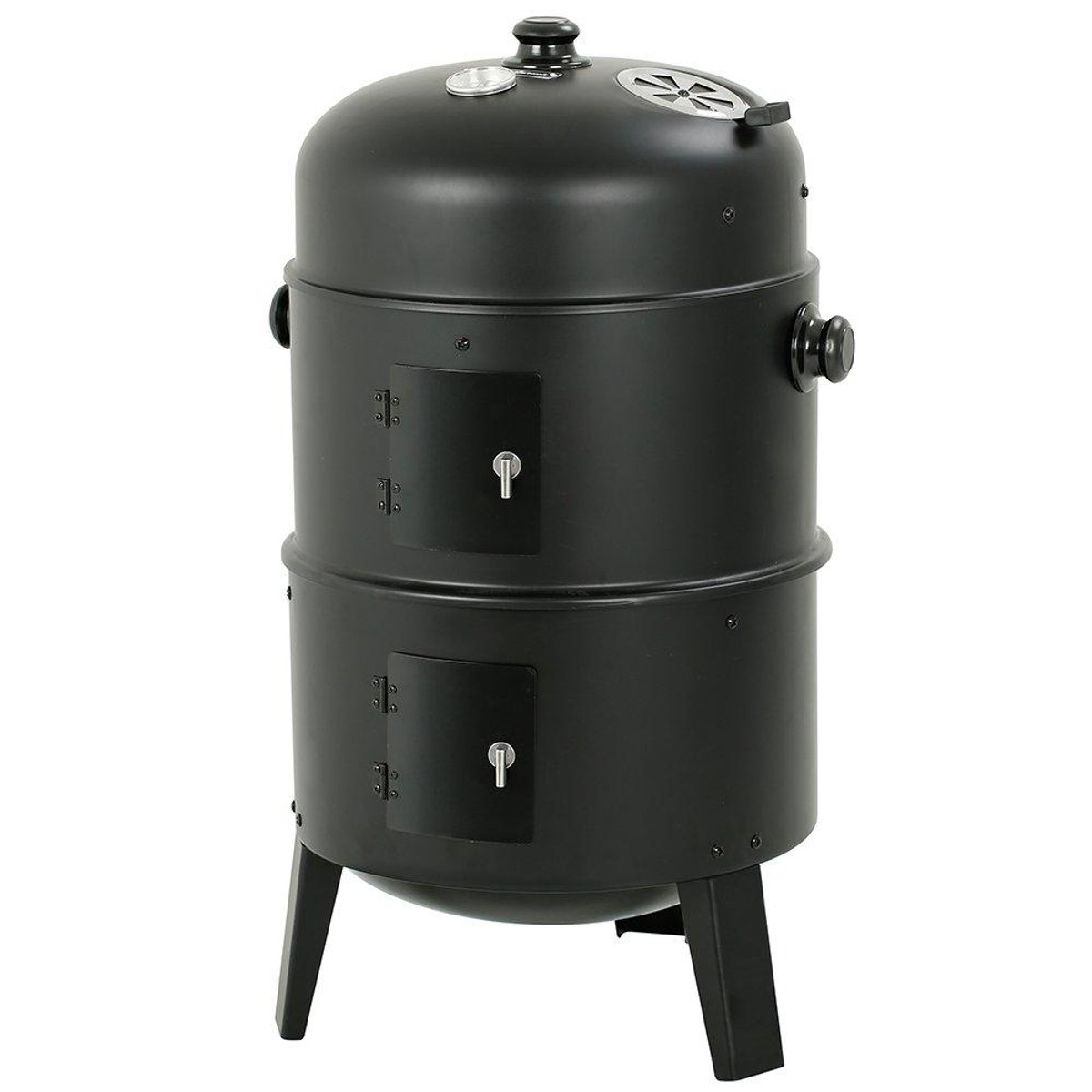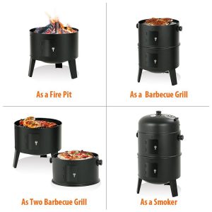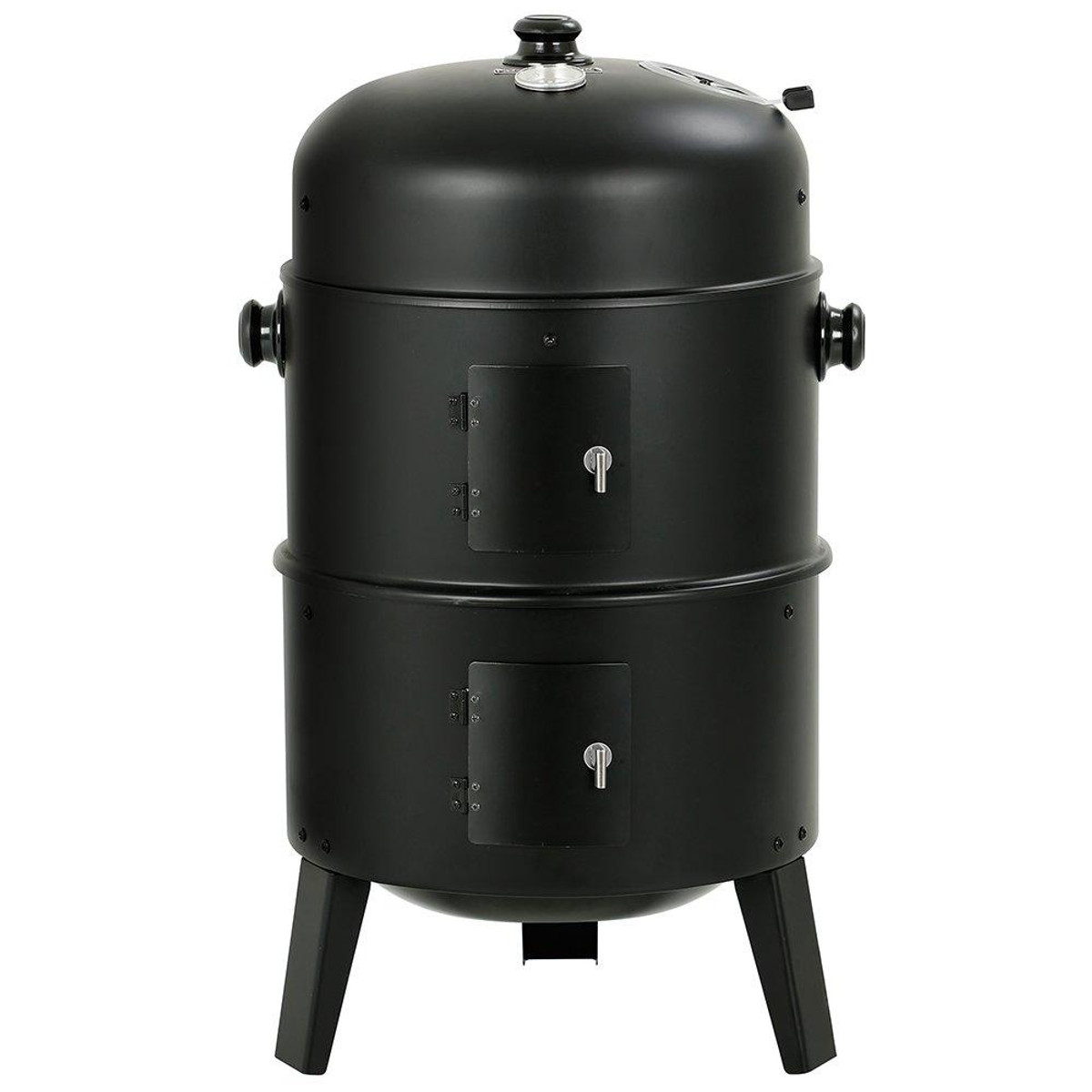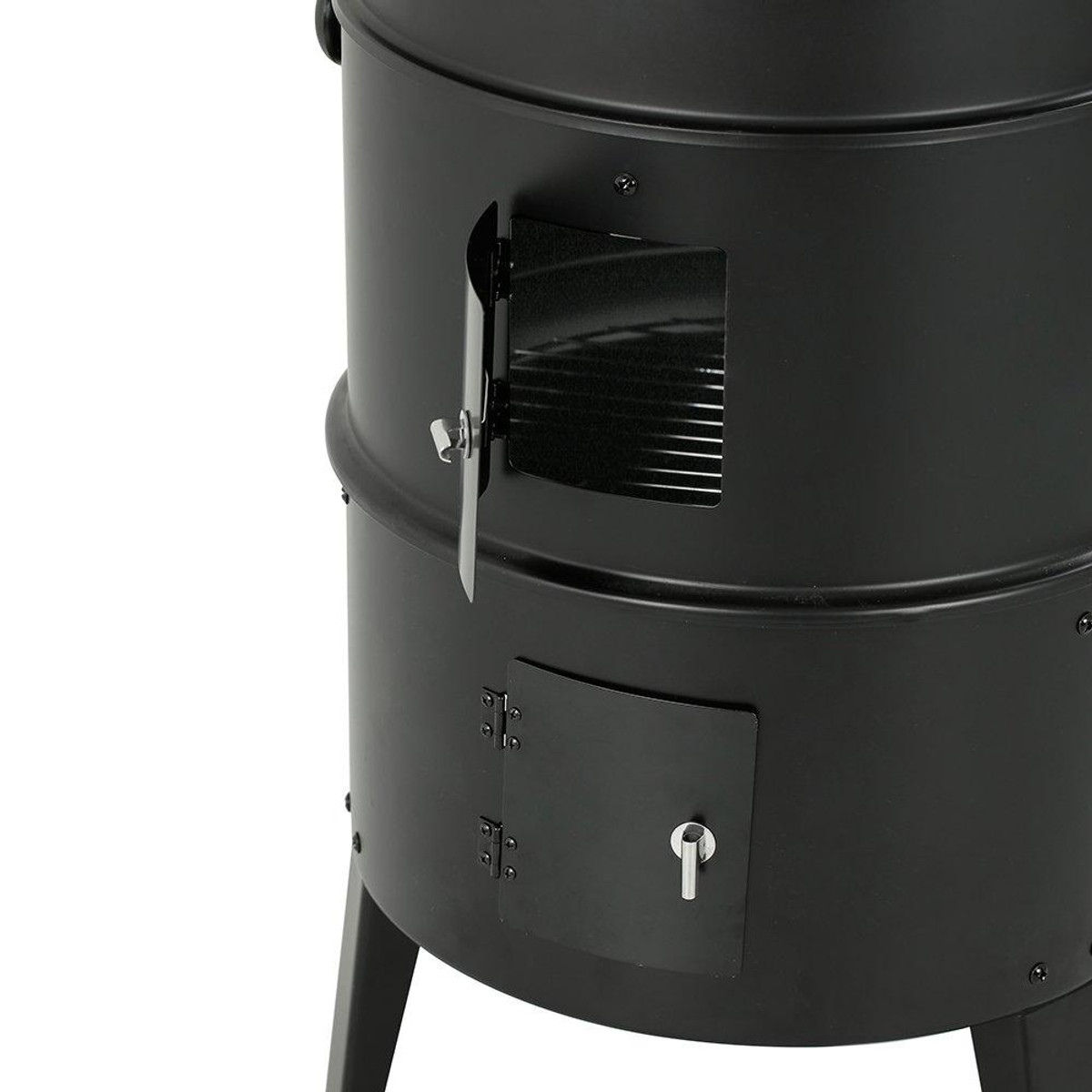 The Big Horn 16 in. Black Powder-Coated Steel Smoker Grill is a versatile outdoor cooking solution! Its unique three-part design allows it to function as a smoker, grill, or fire pit. Use the bottom third as a fire pit, add the middle segment for a charcoal grill, or complete the setup with the top for an efficient smoker. Includes two chrome cooking grates, two zinc-plated charcoal grids, and an enameled steel bottom pan for wood, charcoal, or water. Measures 18.3 in. x 15.75 in. x 29.6 in. H.