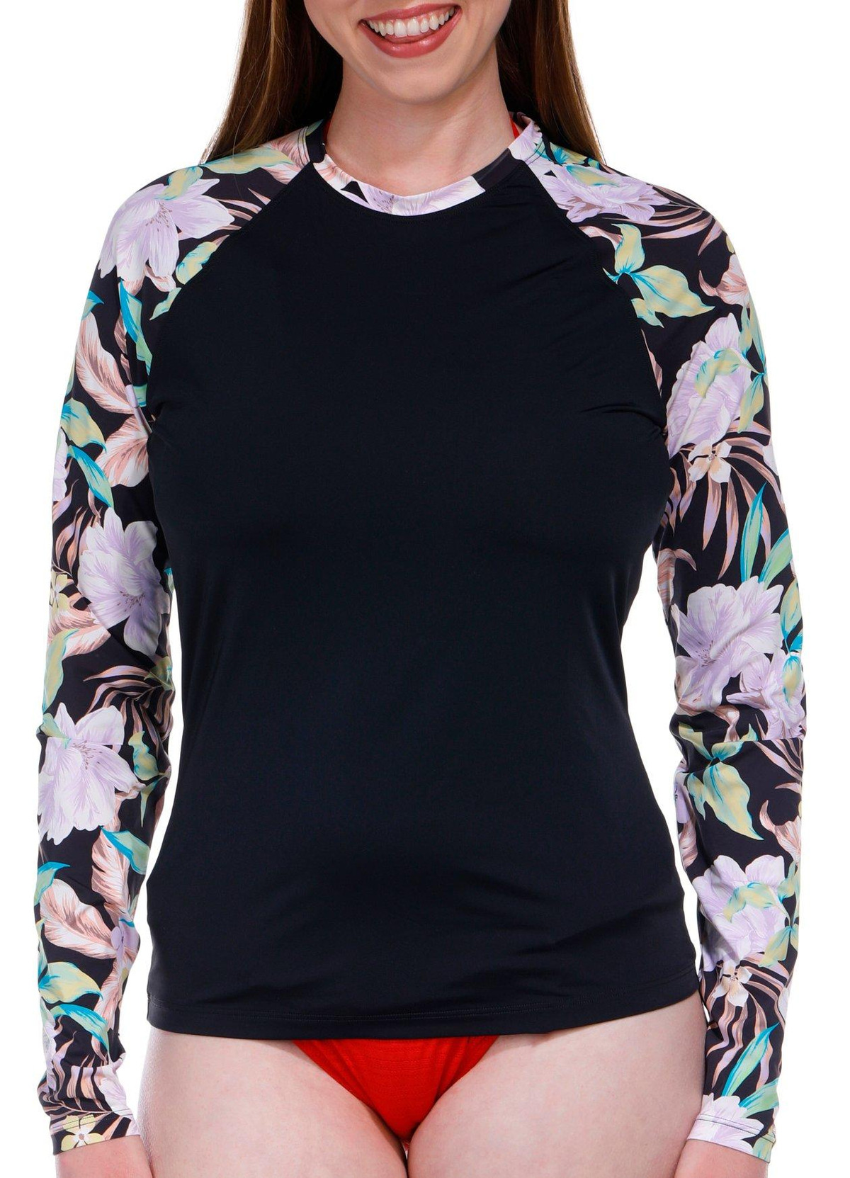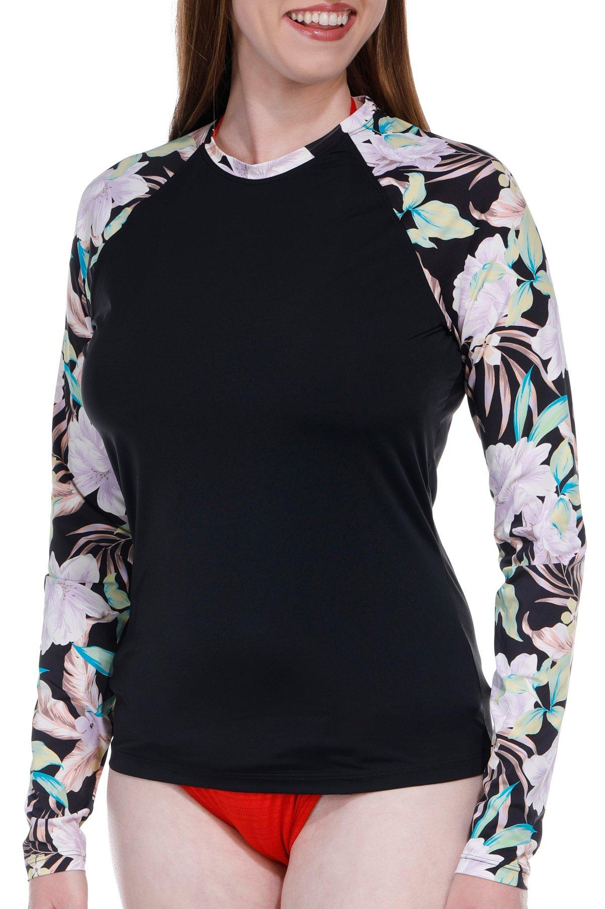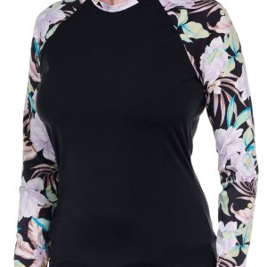 Stay protected and stylish with the Long Sleeve Shadow Tropic Rash Guard. Designed with built-in sun protection, this rash guard ensures you stay safe during your beach or poolside activities. Its long sleeves provide extra coverage, while the tropical print adds a vibrant touch to your swimwear collection. Perfect for any water adventure, this piece combines functionality and fashion seamlessly. Fabrication is 78% recycled nylon, 22% elastane.
