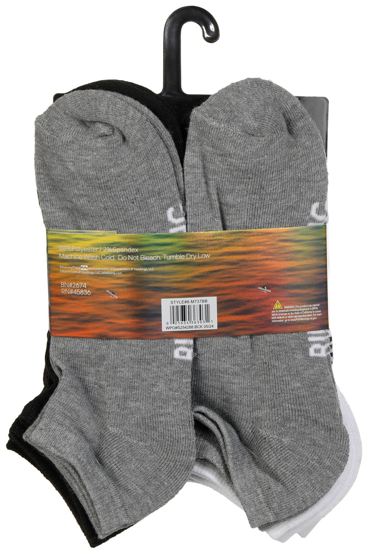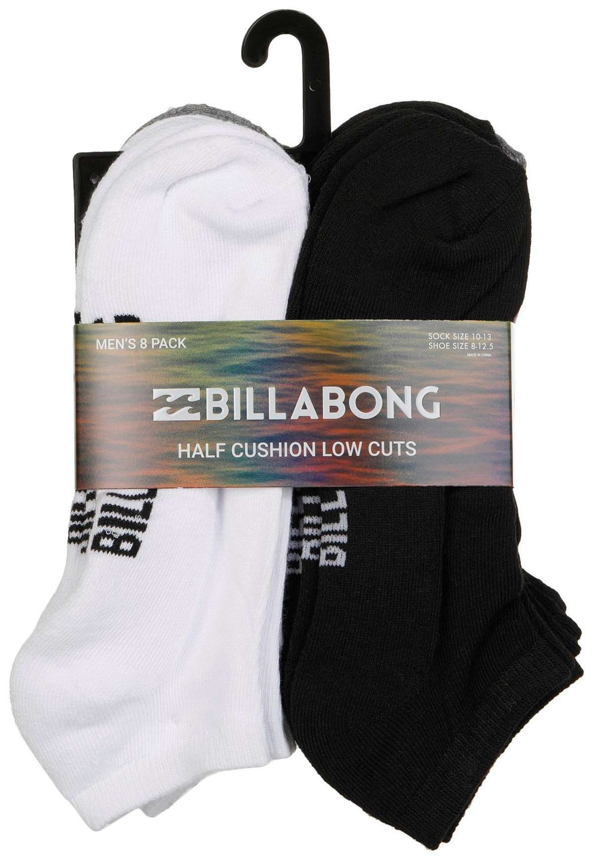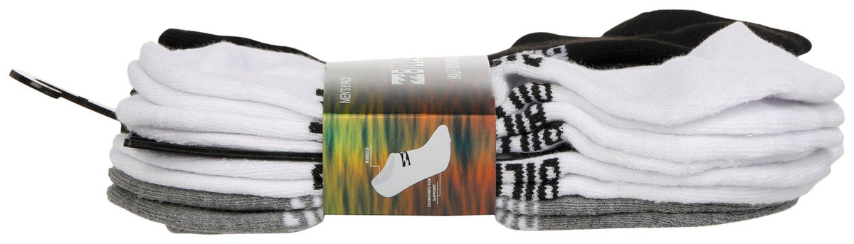 These mens half cushioned low cut socks feature solid white color on an ultra-soft poly blend fabrication, sweat wicking, and cushioned soles. Contains 8 pairs of socks, black, white & gray and logo print. Fits sock size 10-13. Fabrication 98% polyester, 2% spandex.