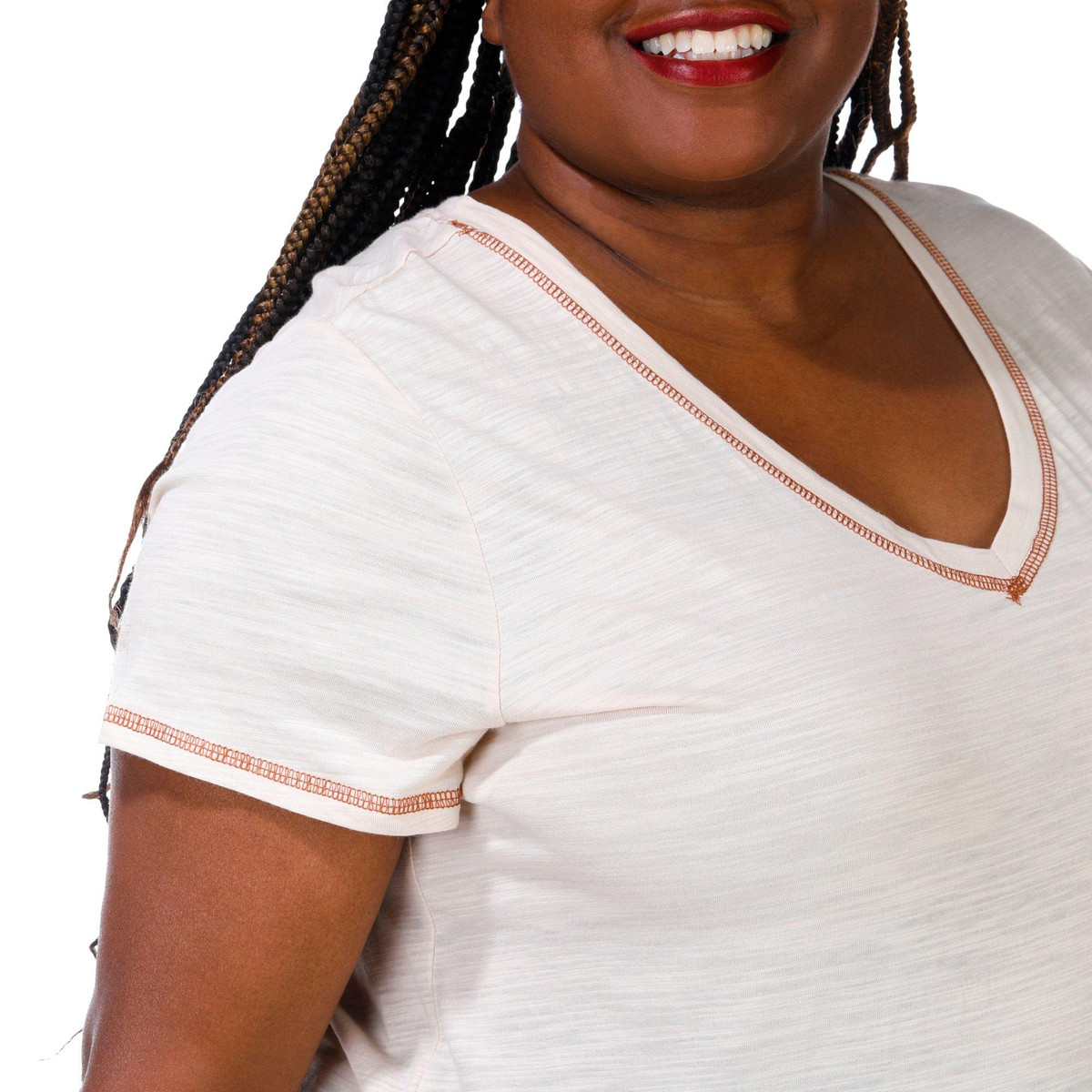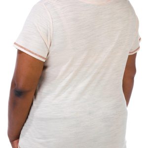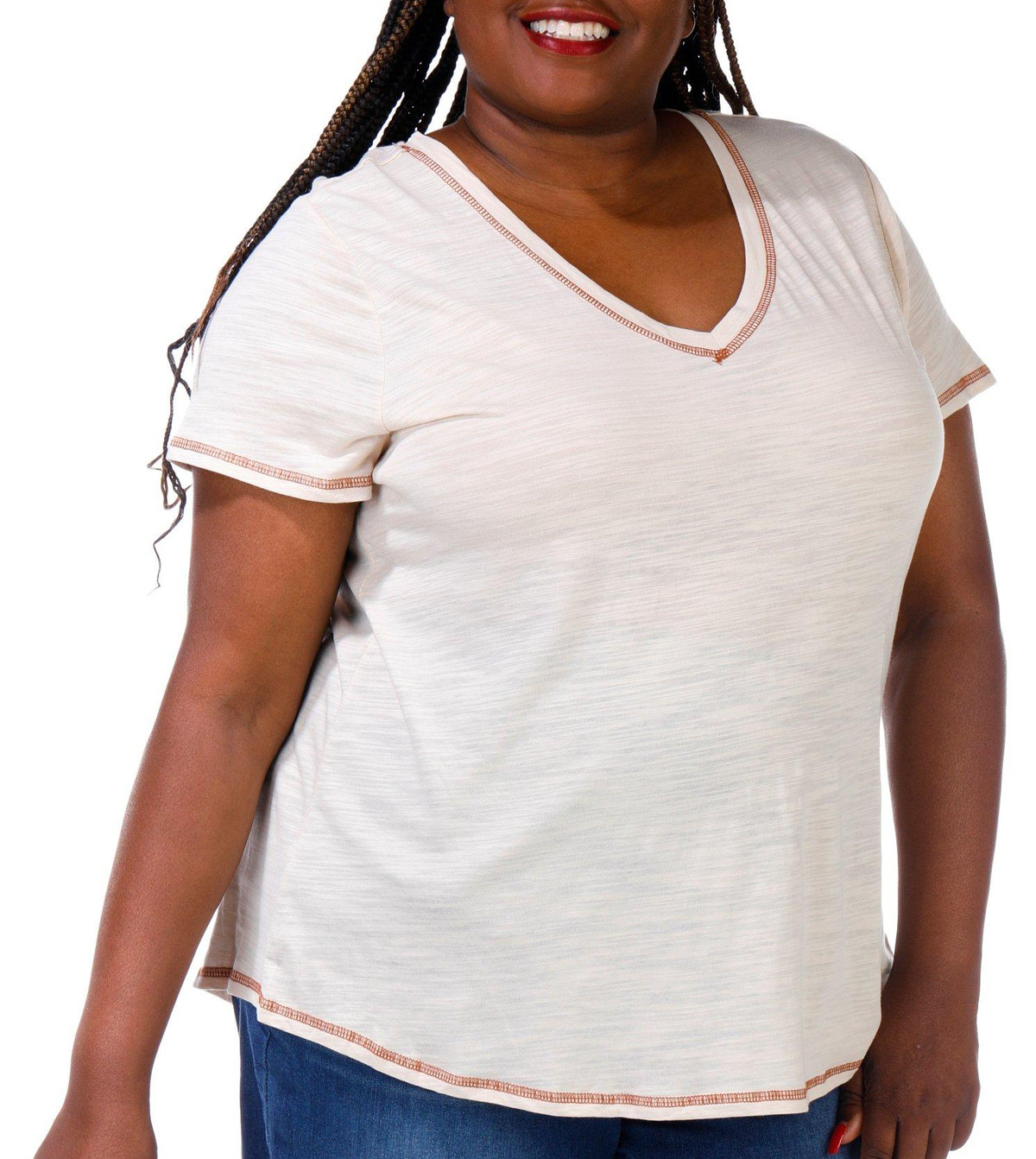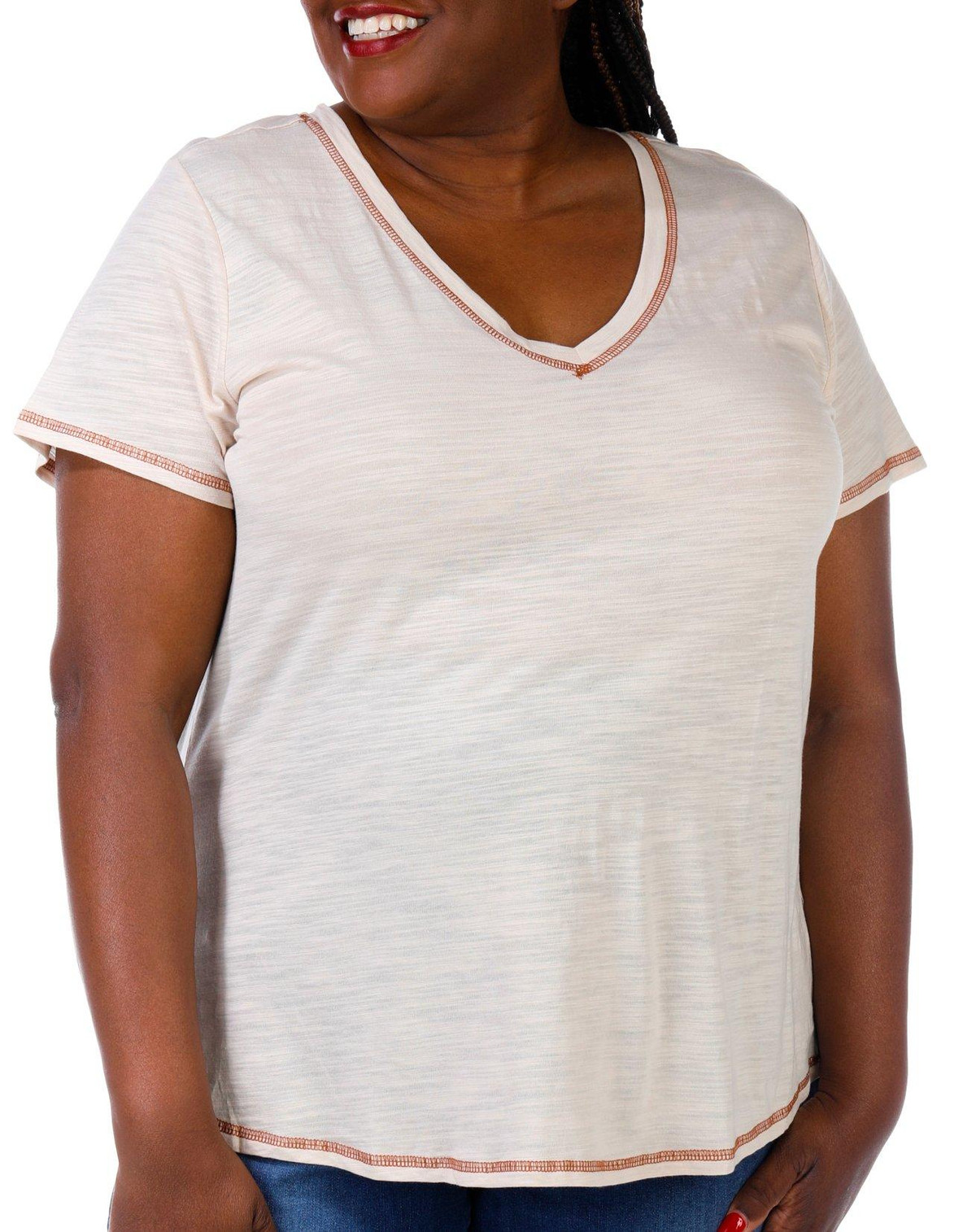 This short sleeve top features a solid color design on lightweight knit fabric, a V-neckline, embroidered seam details, and classic styling. The top length measures approximately 28 in. Fabrication 60% cotton, 40% modal.