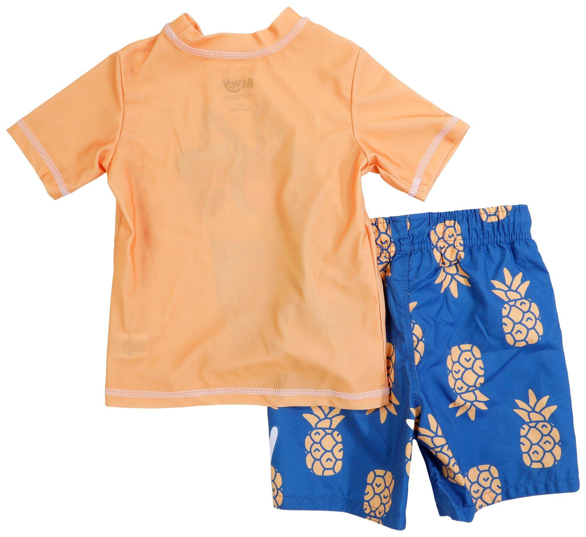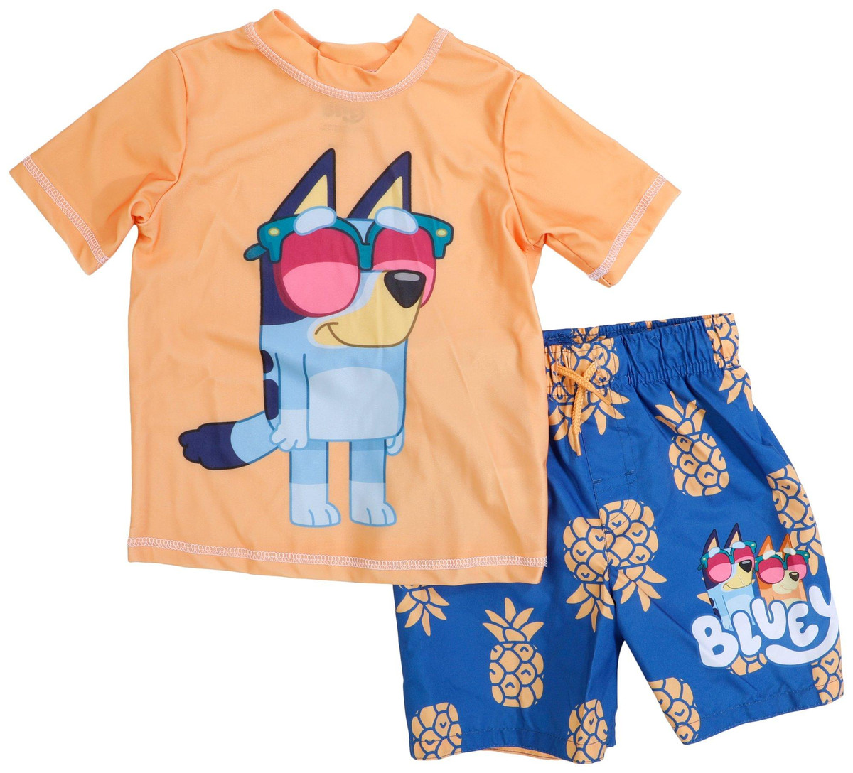 Get your toddler boy ready for splashy adventures with this Bluey 2-piece rash guard set. It includes a short-sleeve rash guard made from stretch knit and coordinating woven trunks with a drawstring waistband. Fabric Content: 100% Polyester.