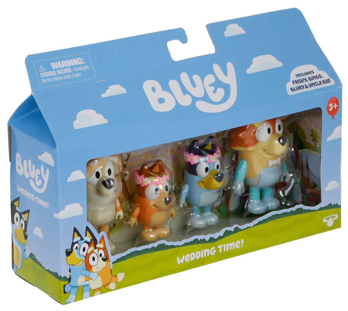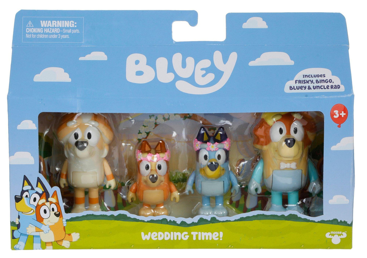 Bring home the fun and imaginative play of Bluey and her family with this adorable Wedding Time Figure 4 Pack! Uncle Rad is ready to tie the knot with Frisky, and Bluey and Bingo have joined the celebration as flower girls wearing beautiful flower crowns. ! All 2.5 – 3 figures are articulated and have moving arms and bodies. They are just the right size for pre-school hands to move and play with.