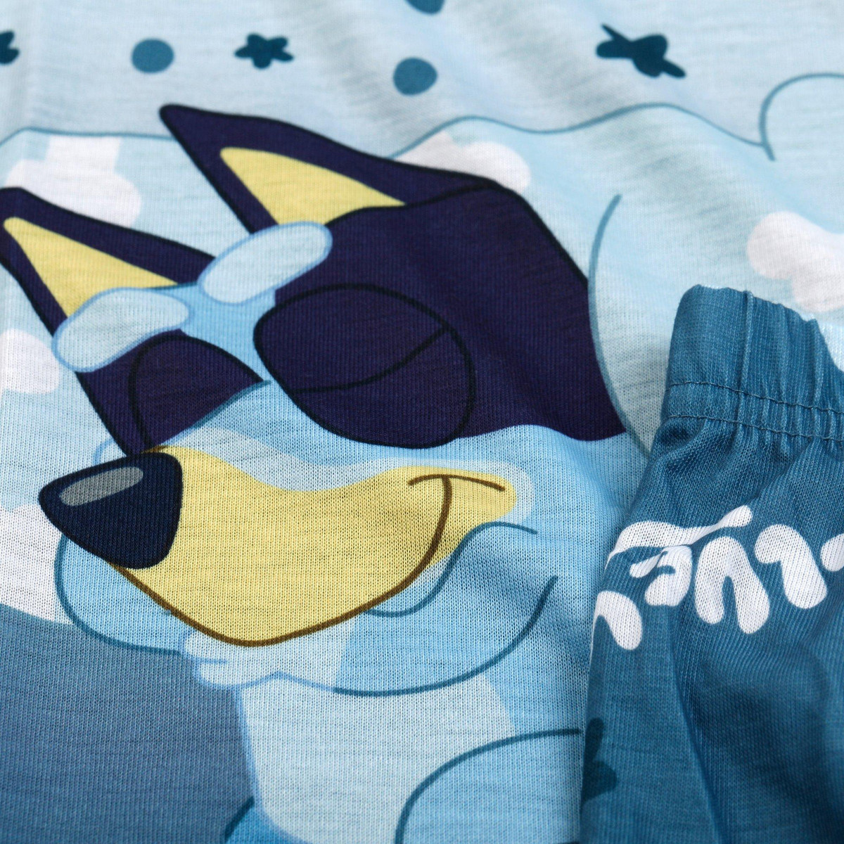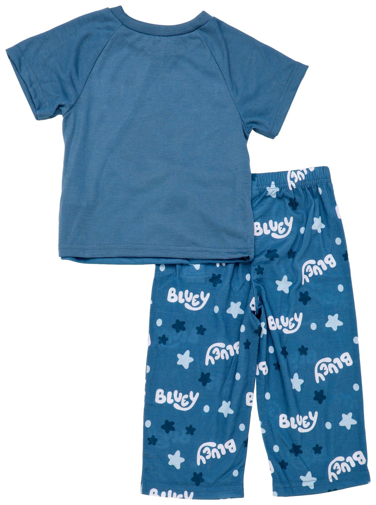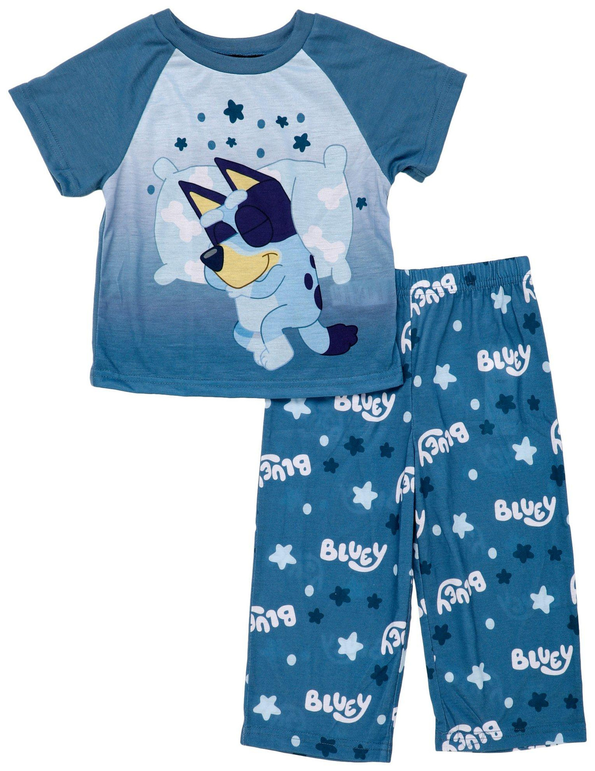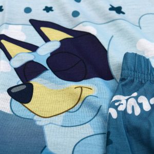Drift into dreamland with this 2 Pc Toddler Boy Pajama Set, crafted for all-night comfort and playful charm. Featuring a short sleeve sleep tee and cozy long pants, this matching set is designed with an allover Bluey print that brings your childs favorite character to bedtime. The soft, breathable fabric keeps little ones cool and comfortable through the night, while the elastic waistband ensures a secure and flexible fit. Perfect for lounging or sleeping late. Fabrication is: 100% polyester.