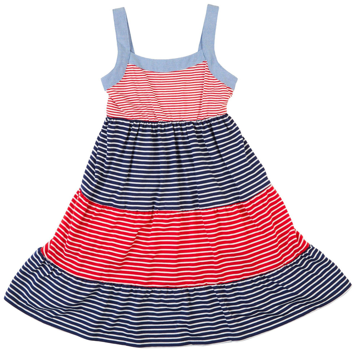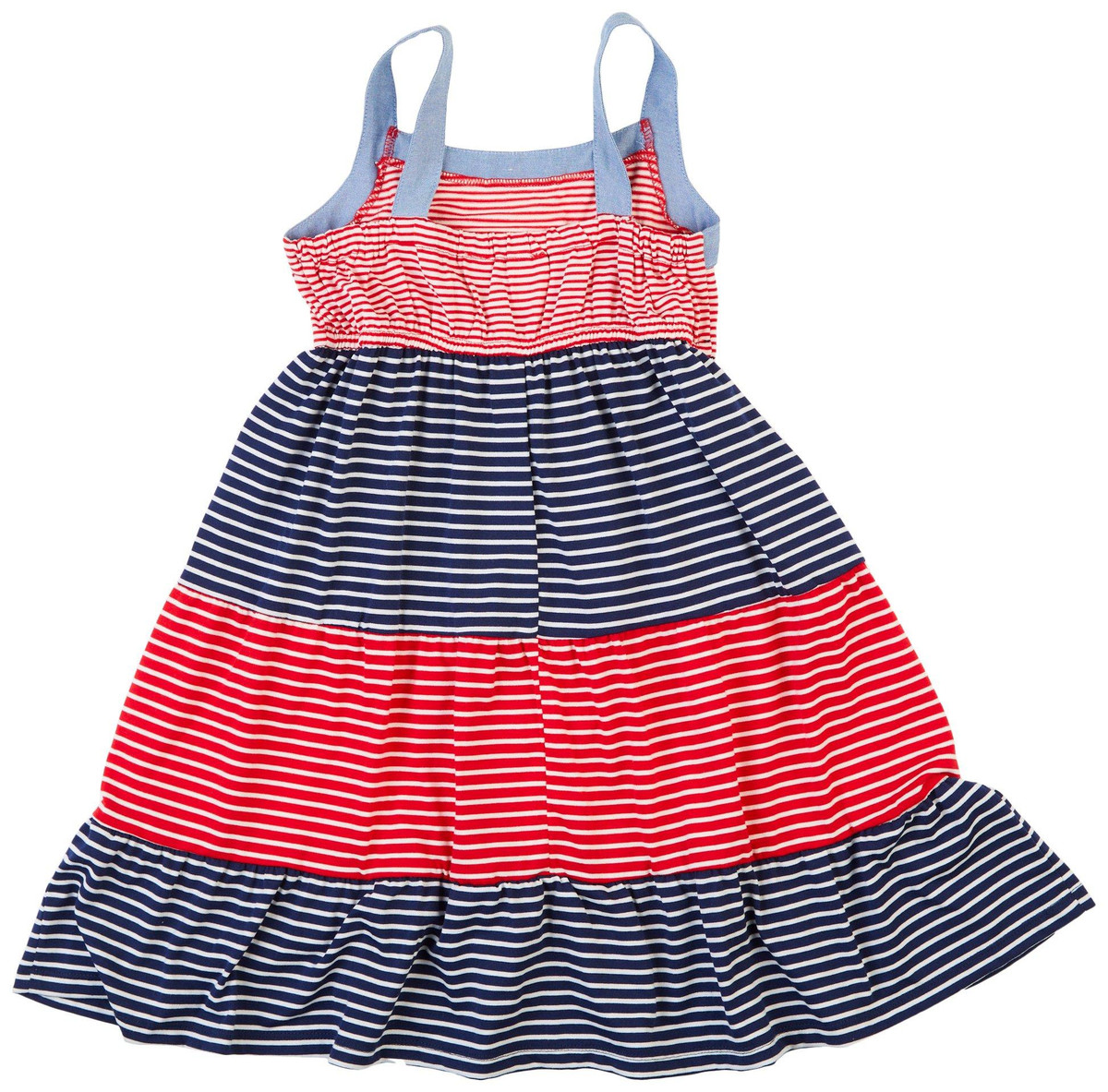 This sleeveless Bonnie Jean Little. girls dress features bold red, white, and blue horizontal stripes for a classic look. Made from 100 percent cotton with spandex for a comfortable stretch, it is perfect for everyday wear, Fourth of July celebrations, or a stylish Sunday afternoon. Lightweight and easy to wear, it keeps her looking adorable for any occasion.