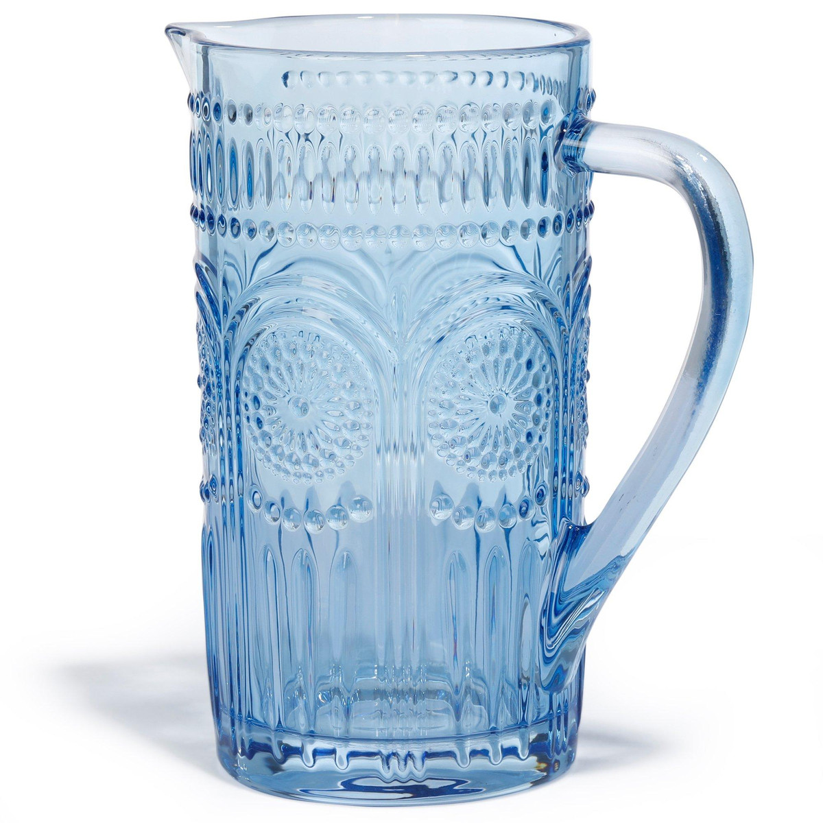 The theme of this image embodies elegance and sophistication, perfect for adding a touch of vintage charm to any table setting. The intricate patterns and vibrant sky-blue color create a beautiful and eye-catching appeal that will enhance any dining experience. – vintage charm, elegant, intricate patterns, glassware, pitcher, sophisticated, table setting, decorative, vibrant blue, eye-catching.