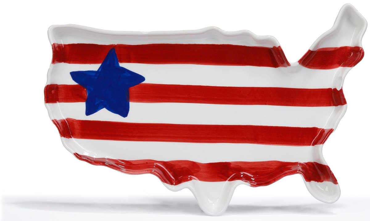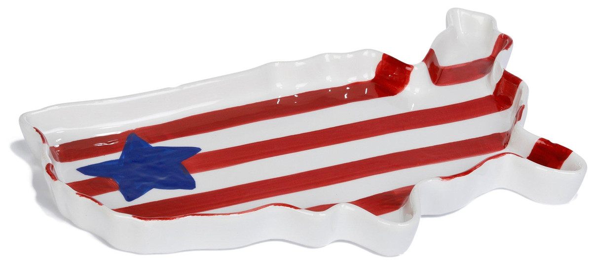 Shaped like the USA map and adorned with classic American flag elements, this plate is perfect for those looking to show off their love for country in a stylish way. Itâs perfect for any 4th of July party, Memorial Day gathering, or simply to bring a touch of Americana into everyday meals. Measures approximately 12 in x 7 in x 4 in.