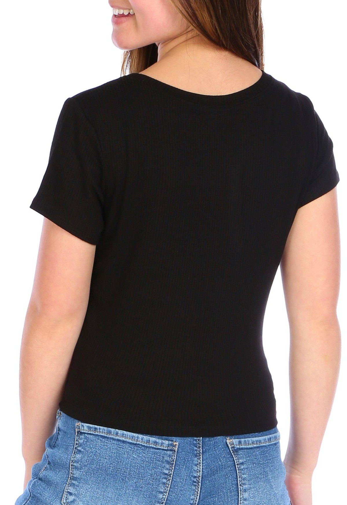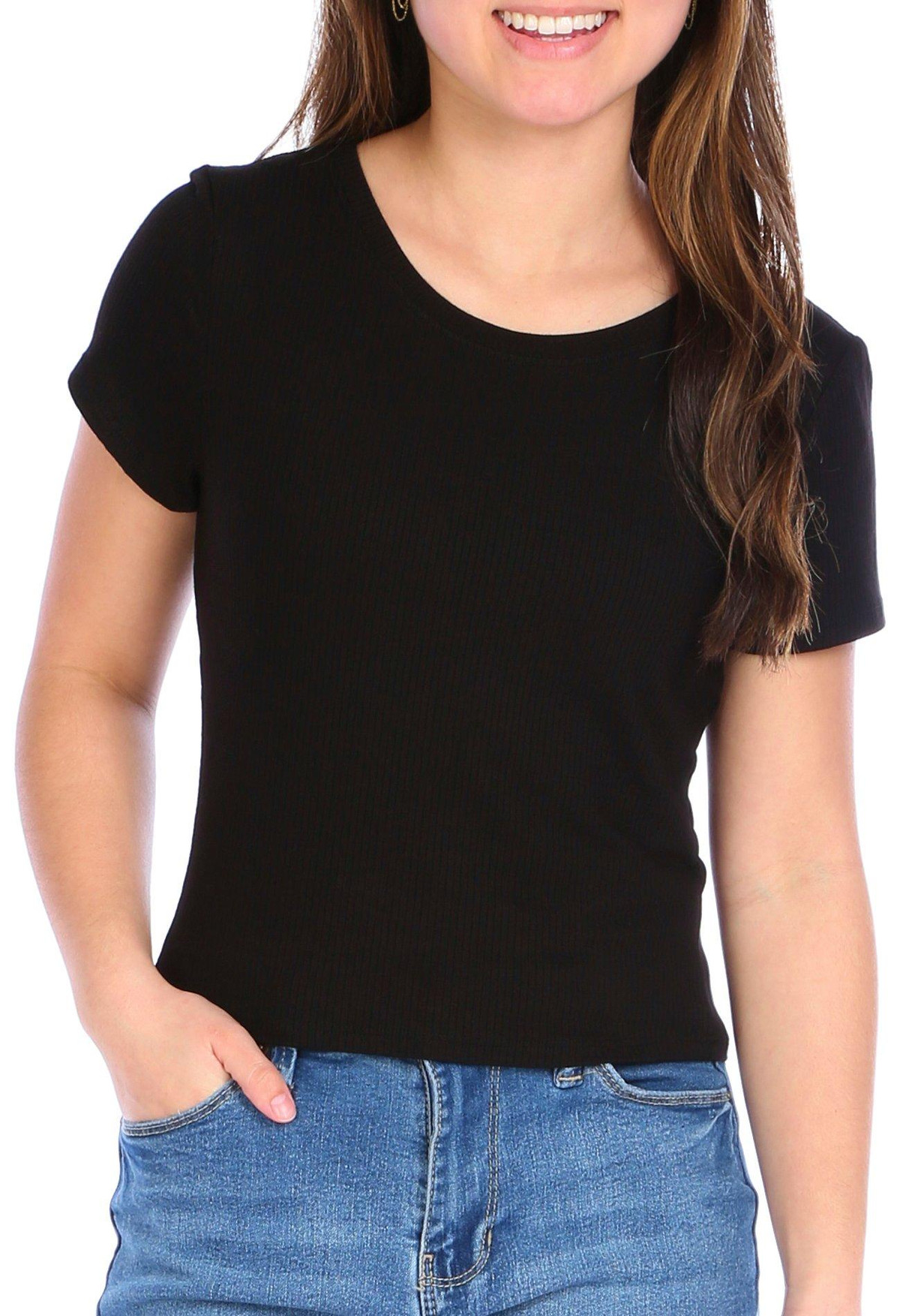 BOZZOLO offers chic casual designs in vibrant colors and stylish prints. This top features a solid color design on soft lightweight ribbed stretch knit fabric, short sleeves, a crew neckline, and crop styling. Measures approximately 17 in. The fabrication is 93% rayon and 7% spandex.
