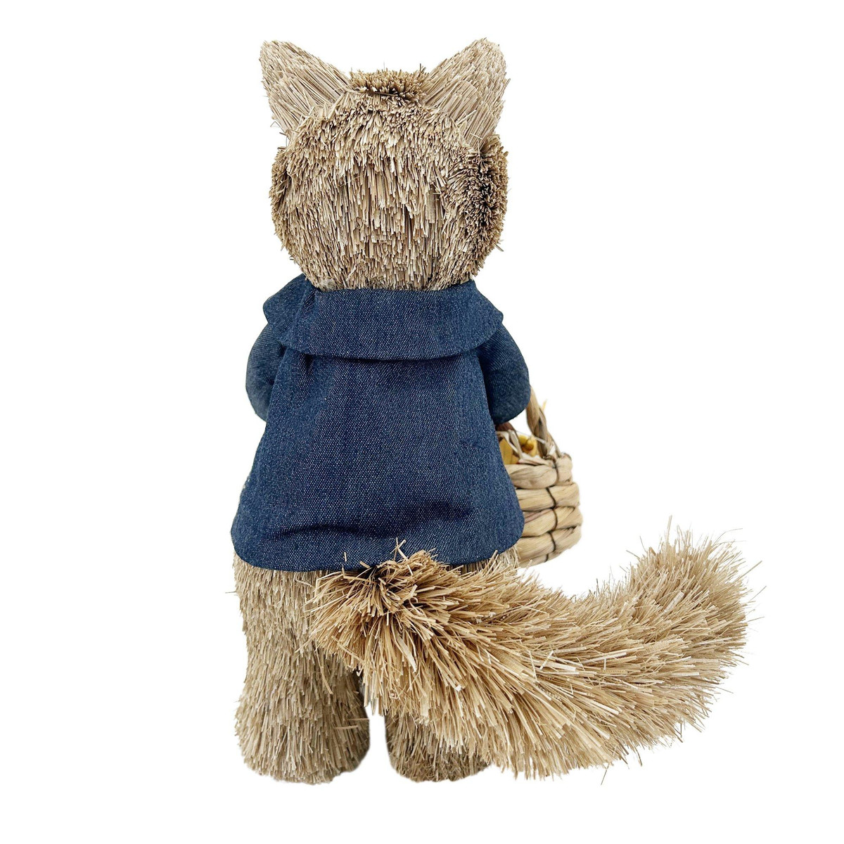 Add a playful harvest touch with this 11-inch Sisal Fox Boy With Basket. Made from a mix of sisal, styrofoam, fabric, and cornhusk, this dapper fox stands tall in a blue jacket and waistcoat, holding a woven basket filled with autumn accents. Fully assembled and measures 6.3in. x 7.1in. x 11.4in. Perfect for seasonal shelf or tabletop displays.