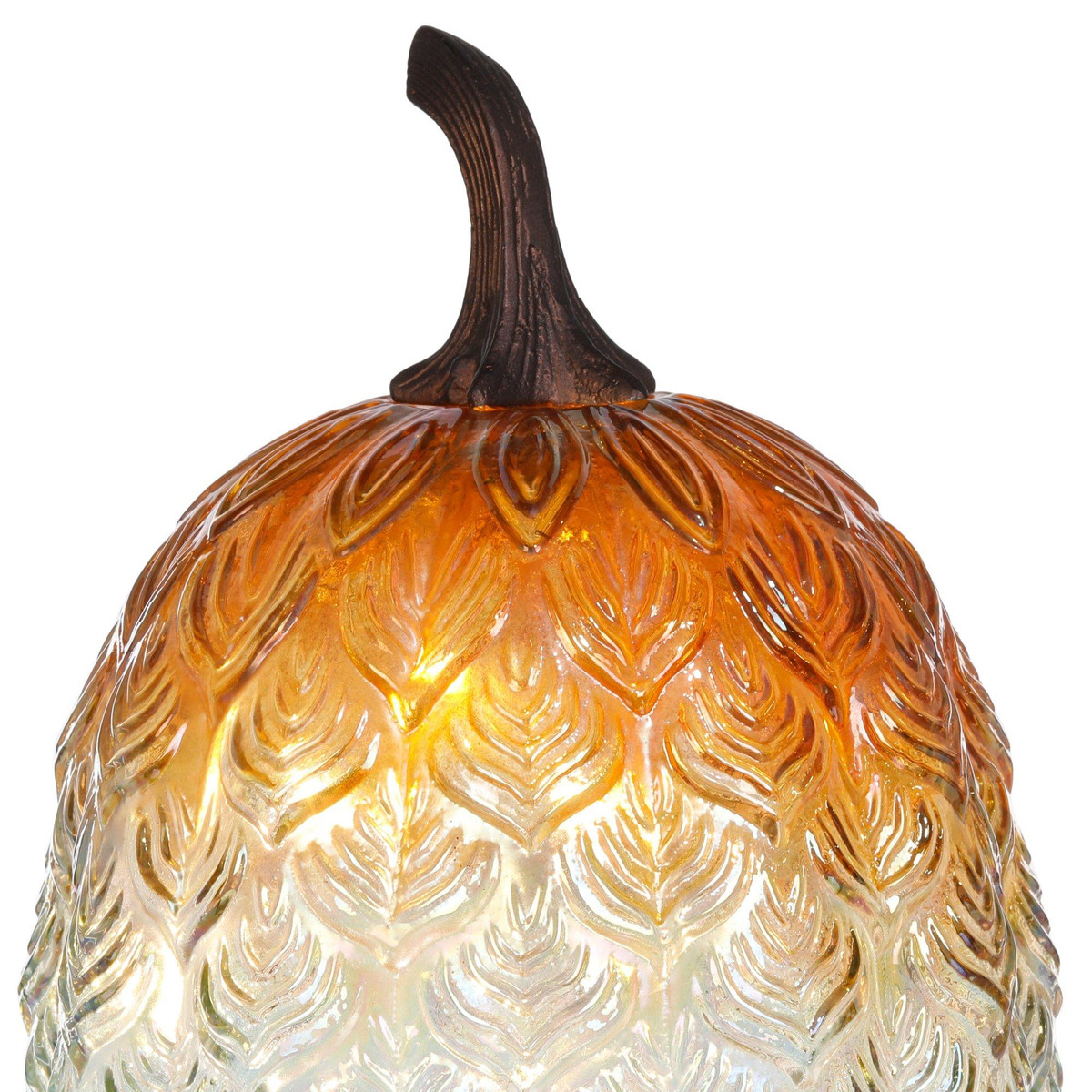 Add a warm glow to your décor with this 14 in LED Glass Pumpkin Home Accent. Featuring an embossed feather pattern, this elegant glass pumpkin is illuminated from within by LED lights for a soft, ambient effect. Ideal for autumn displays, mantel styling, or festive centerpieces. Wipe clean with a dry cloth.