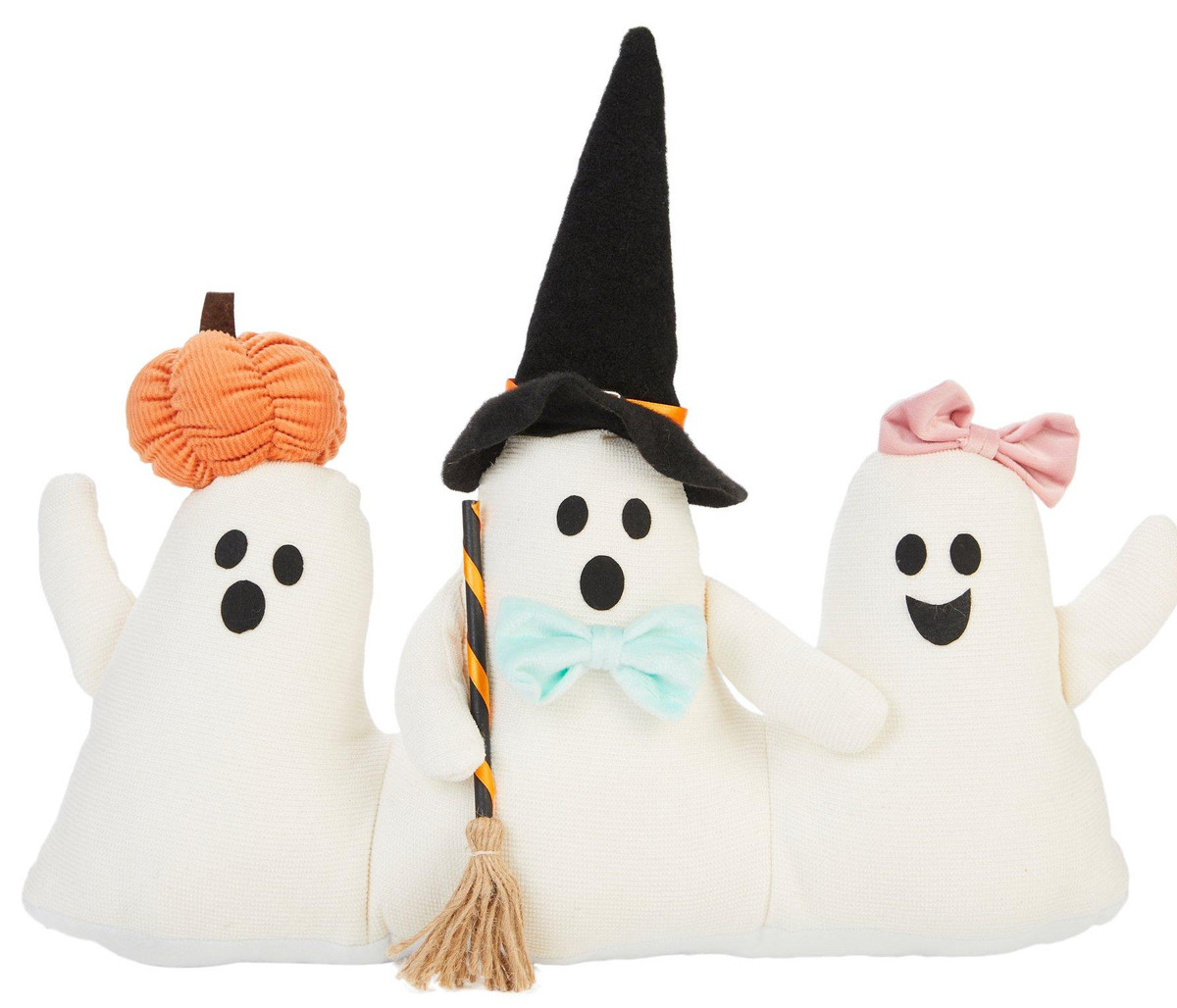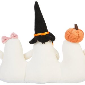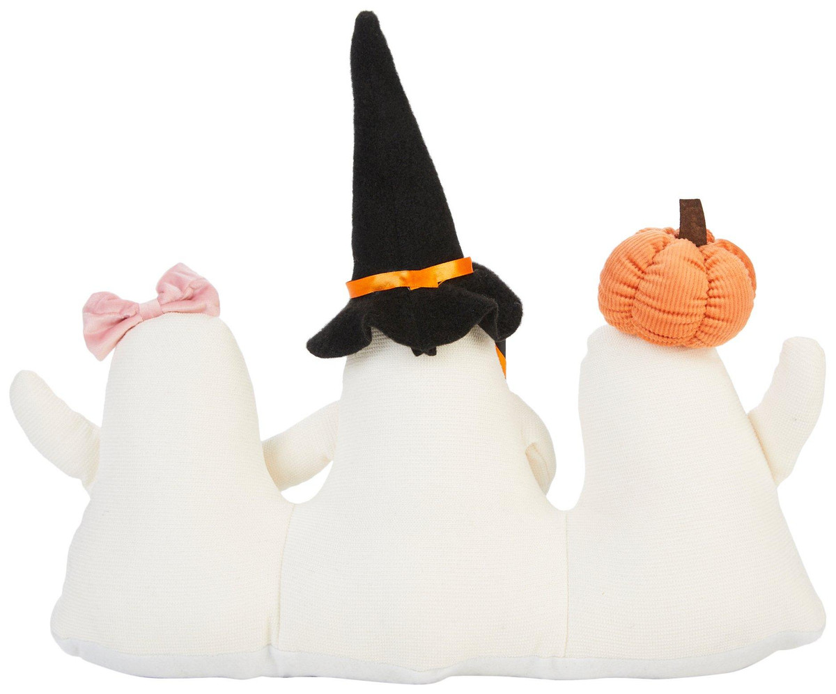 Add whimsical charm to your display with this 18 in Ghost Family Halloween Decor. This freestanding figure features a cheerful trio of ghosts with festive accents, crafted for visual impact in entryways, living rooms or tabletops. A sturdy base ensures easy placement on flat surfaces. Ideal for indoor seasonal decorating. Wipe clean with a soft cloth. Measures approximately 18 in x 15 in x 4 in.