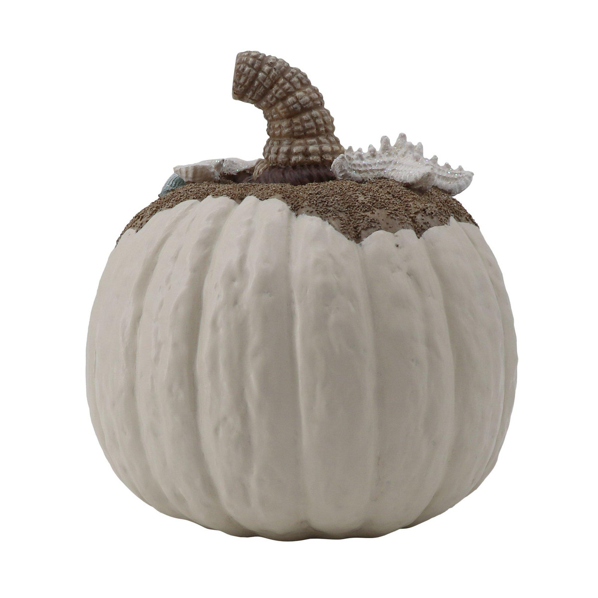 Bring seaside serenity to your fall décor with this 8-Inch Shell Pumpkin. Made of 100% polyresin, this white pumpkin features a textured sand-like top, a coiled shell stem, and is beautifully adorned with seashells, blue starfish, and coastal creatures. A perfect harvest coastal blessing. Measures 7.4in. x 7.4in. x 7.8in.