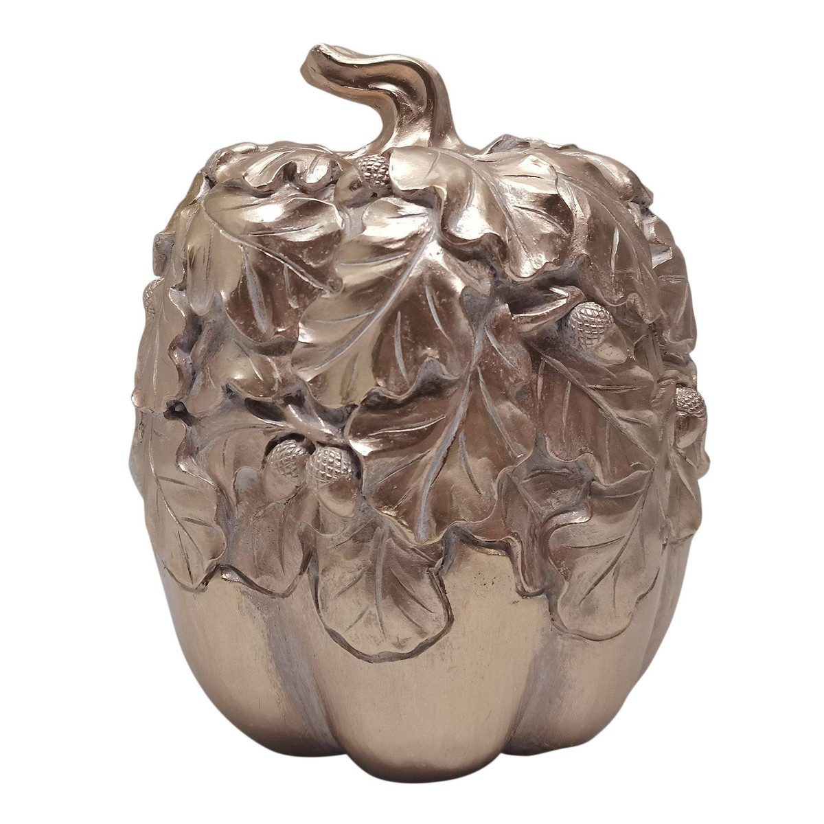 Elevate your fall décor with this elegant metallic-finished pumpkin,eaturing intricate leaf detailing and a stem-like handle. Handcrafted from polyresin and calcium carbonate, its perfect as a fall decorative accent. Measures: 7.9in. x 7.6in. x 9in.