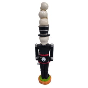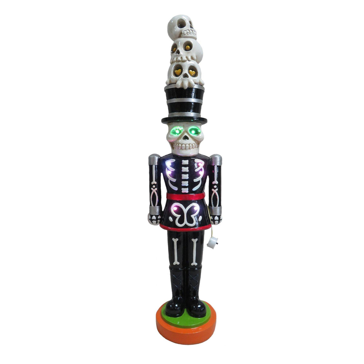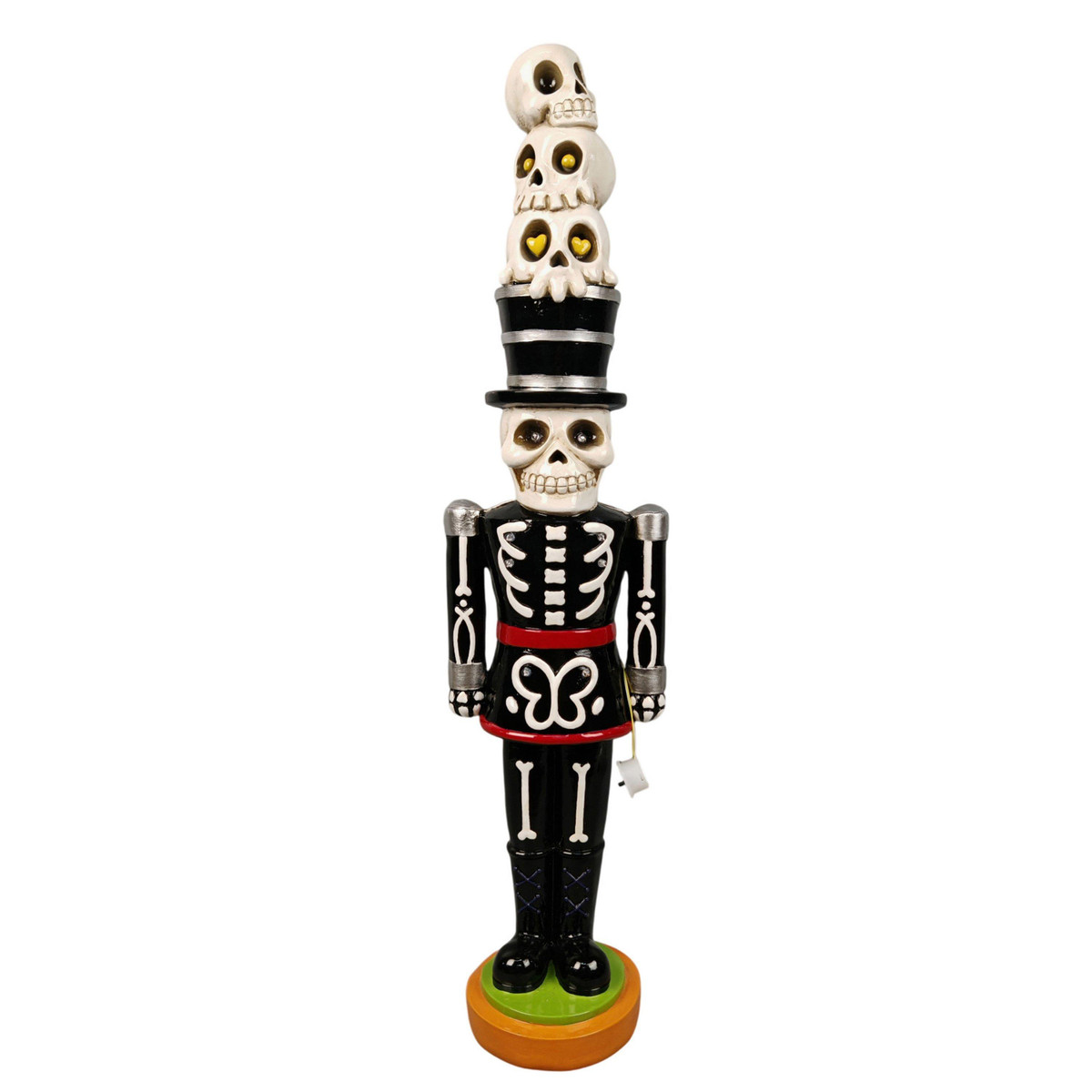 Light up your Halloween décor with this spooky twist on a classic nutcracker. Featuring a skeleton in a formal uniform with glowing blue LED eyes and accents, topped with a trio of skulls and standing on a bold orange base, it’s the perfect statement piece for haunted holiday displays. Measures: 6in. x 5in. x 27in.