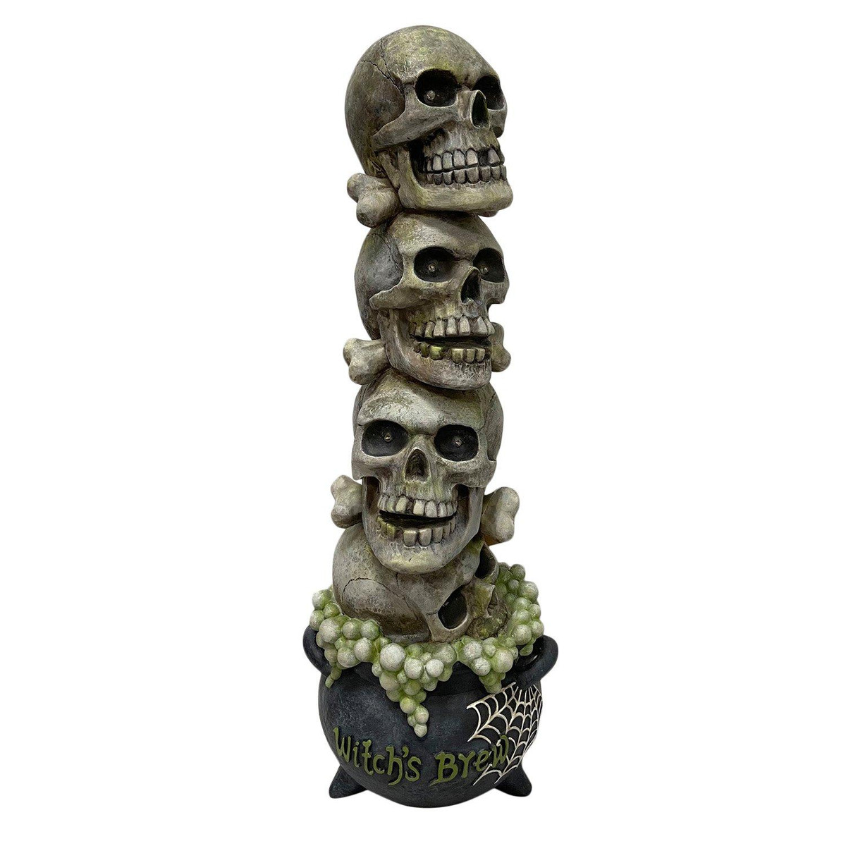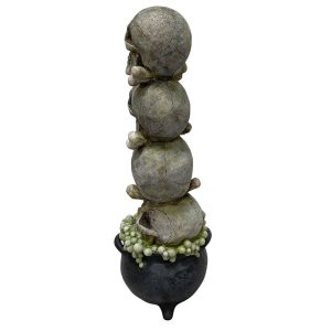 Create a spine-chilling centerpiece with this stacked skulls Halloween decoration. Four realistic skeleton heads are stacked atop a bubbling cauldron base, with the top three skulls glowing in eerie LED colorspink, blue, and green. The dark cauldron features a spiderweb design and oozes with textured, moss-like detail for extra creep factor. Crafted from durable materials and perfect for indoor displays, this lighted skull tower measures 8.875in. x 7.75in. x 24.375in.