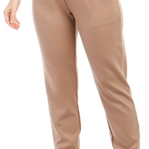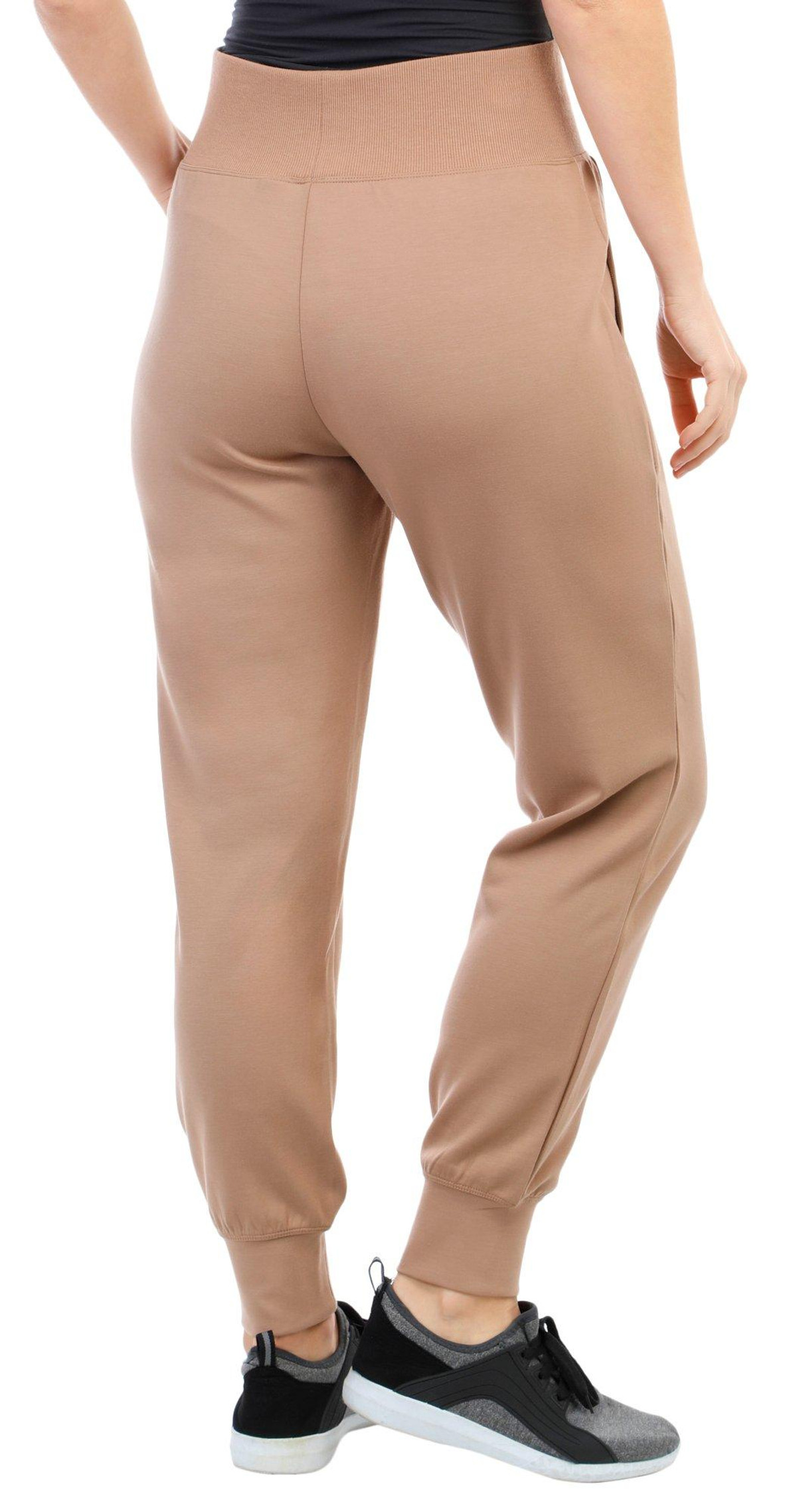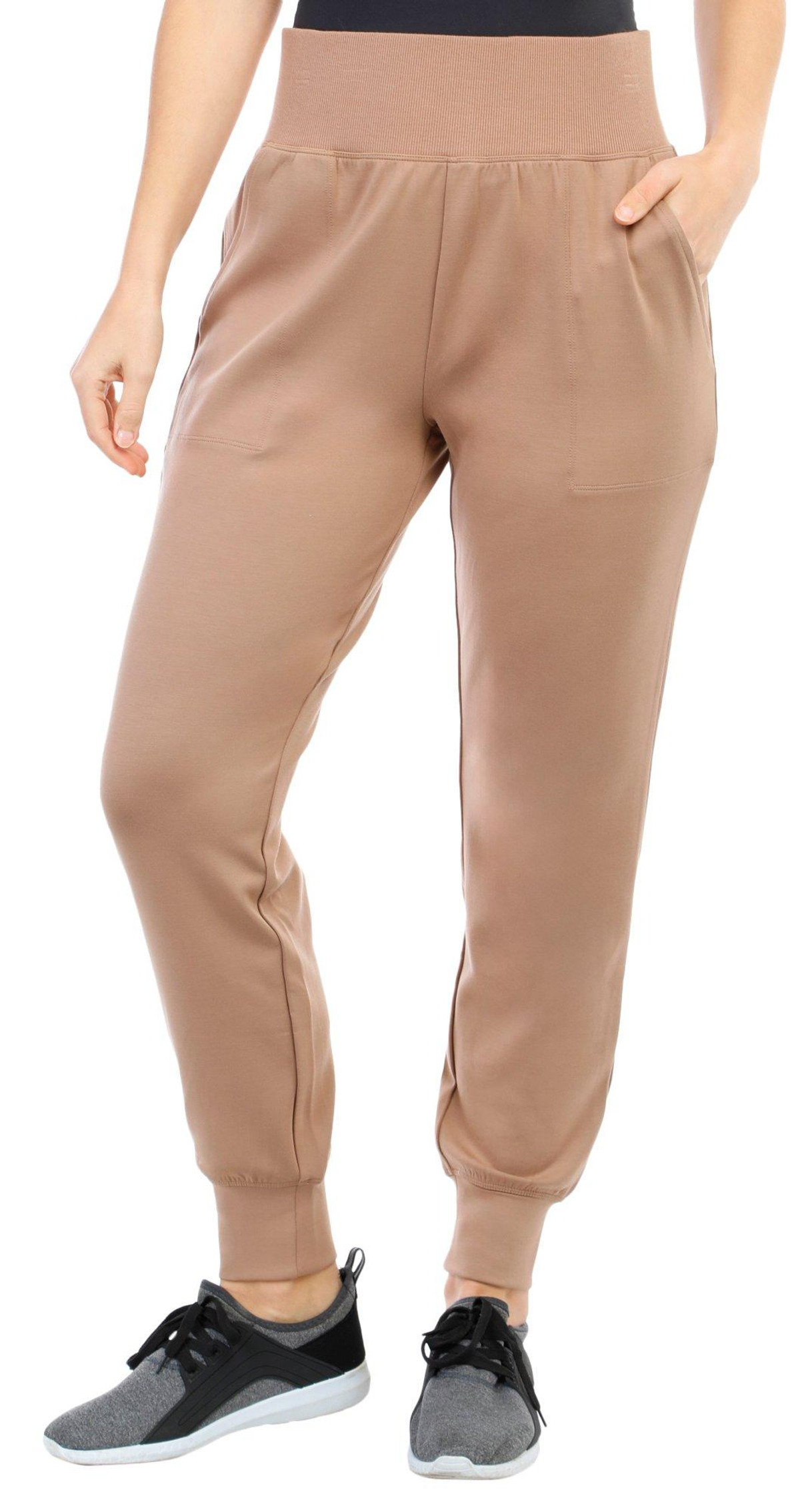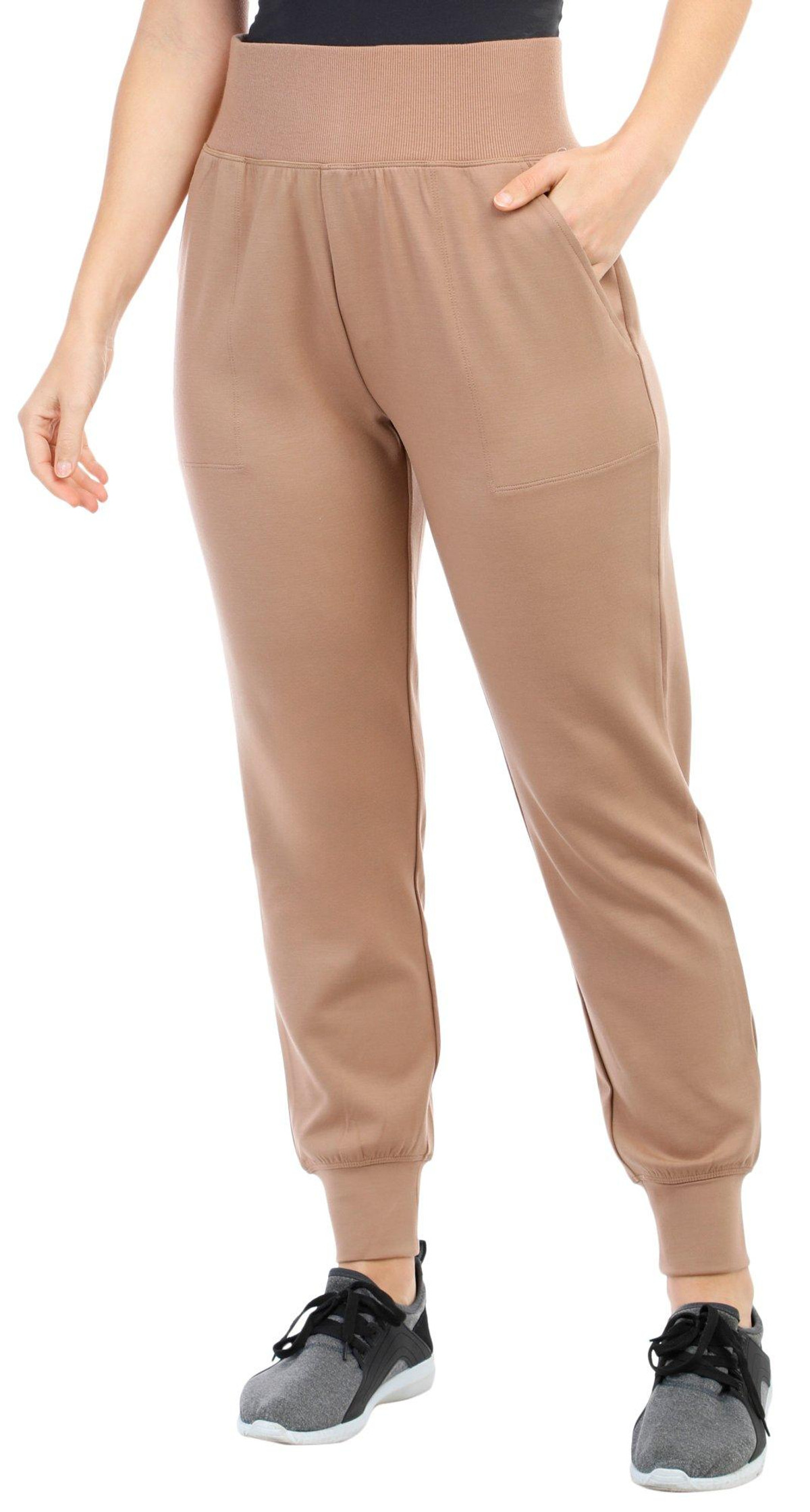 This brand offers comfortable, contemporary, and durable activewear. These ankle joggers feature a classic solid color design on soft comfortable stretch fabric, a wide elastic waistband with a drawstring, two side pockets, and stretch technology. Inseam measures approximately 30 in. Fabrication is 55% Nylon, 36% Rayon and 9% spandex.