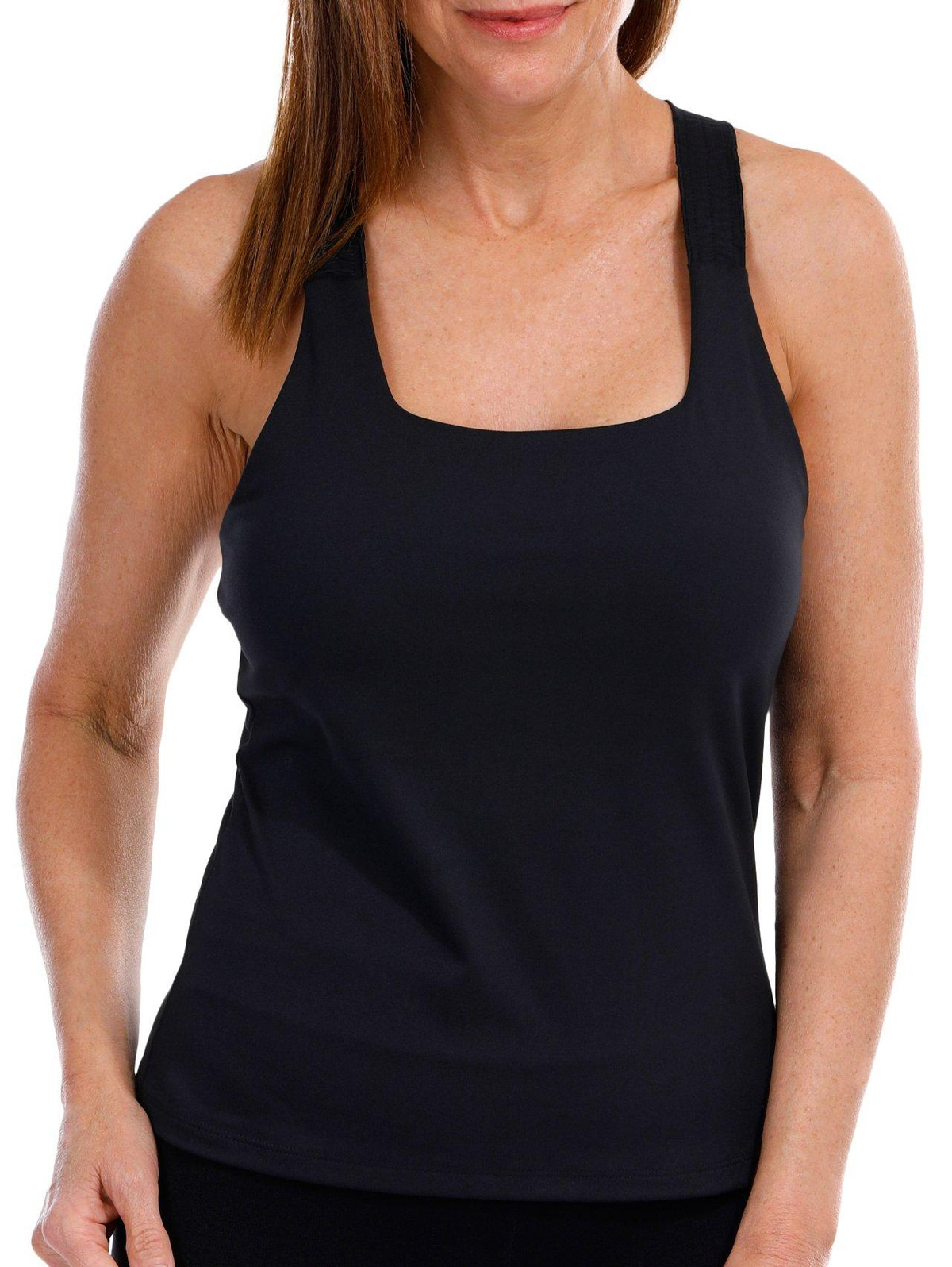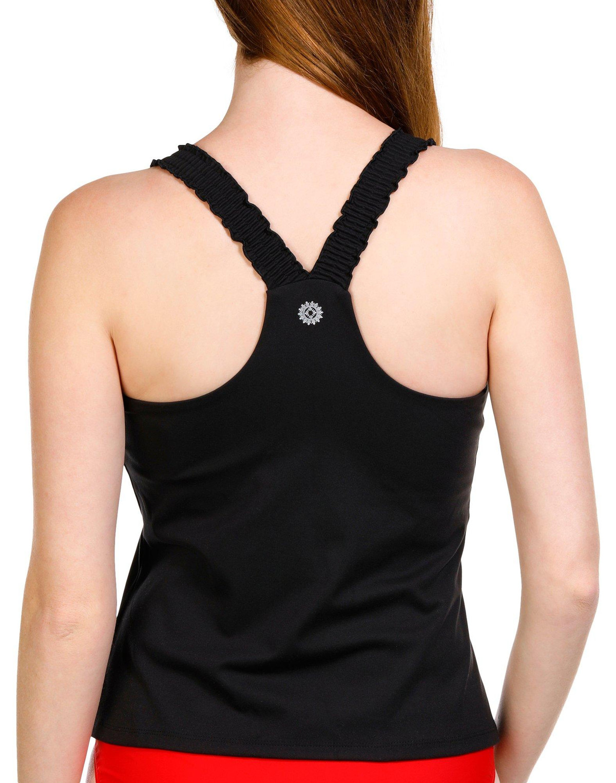 This bra tank features a solid color design on soft lightweight stretch knit and mesh fabric, scoop neckline, ruffled shoulder straps, racerback styling, form fitting fit, and removable soft cups. The top length measures approximately 21 in. Fabrication is 81% polyester and 19% spandex.