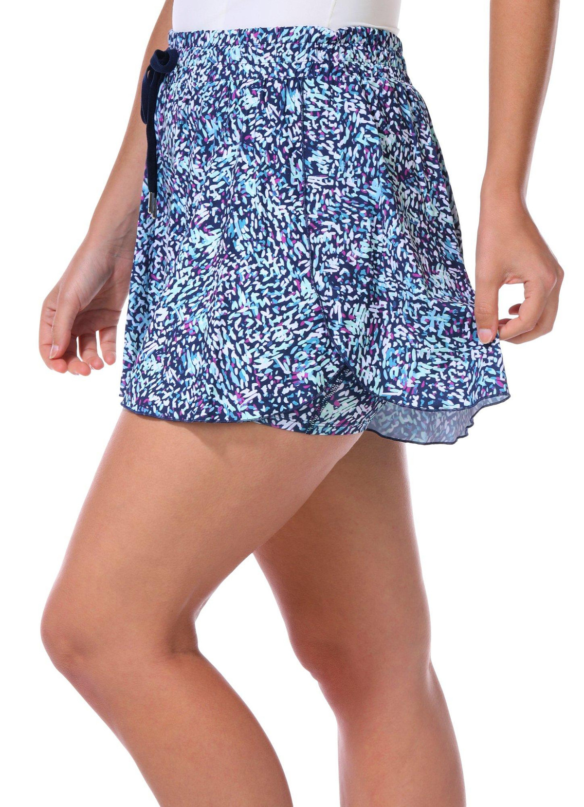 With a playful print pattern and fly away style sides, this skort brings comfort and flair to warm weather looks. The drawstring waist offers a customizable fit, making it perfect for casual days, beach outings, or strolls in the sun. Fabrication is 92% recycled polyester, 8% spandex.