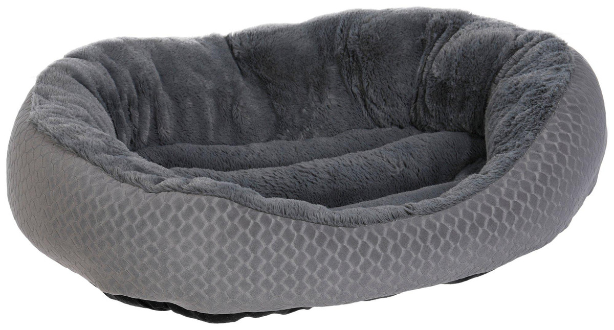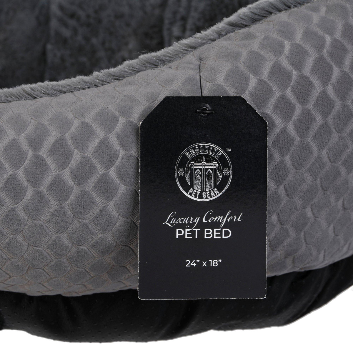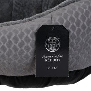 Treat your pet to cozy comfort with this Luxury Comfort Pet Bed, featuring an embossed geometric pattern on solid color fabric and soft faux rabbit fur. The plush, resilient cushion fill supports your pets body, while the breathable design promotes airflow. Durable and easy to maintain being machine washable, its the perfect blend of comfort, style and convenience for everyday lounging. Measures 24 in x 18 in.