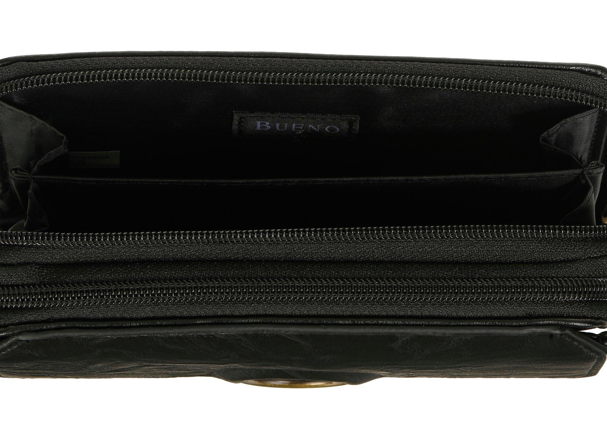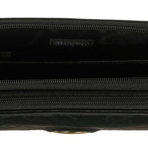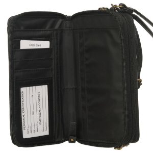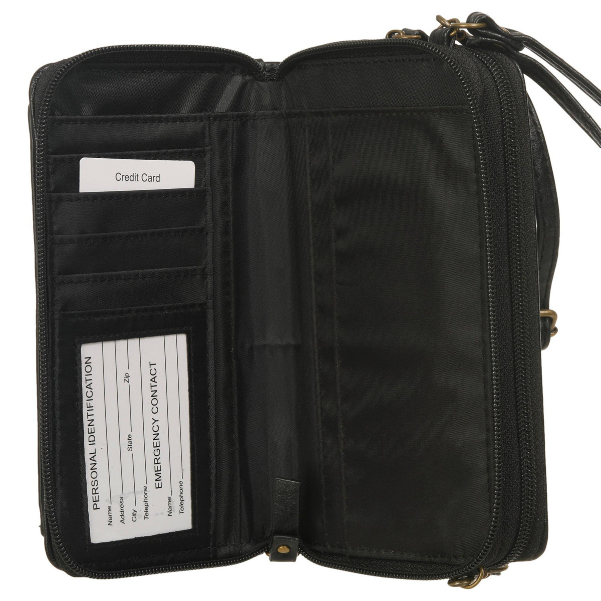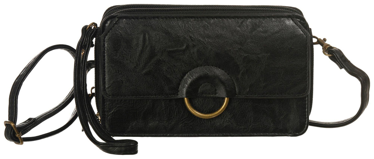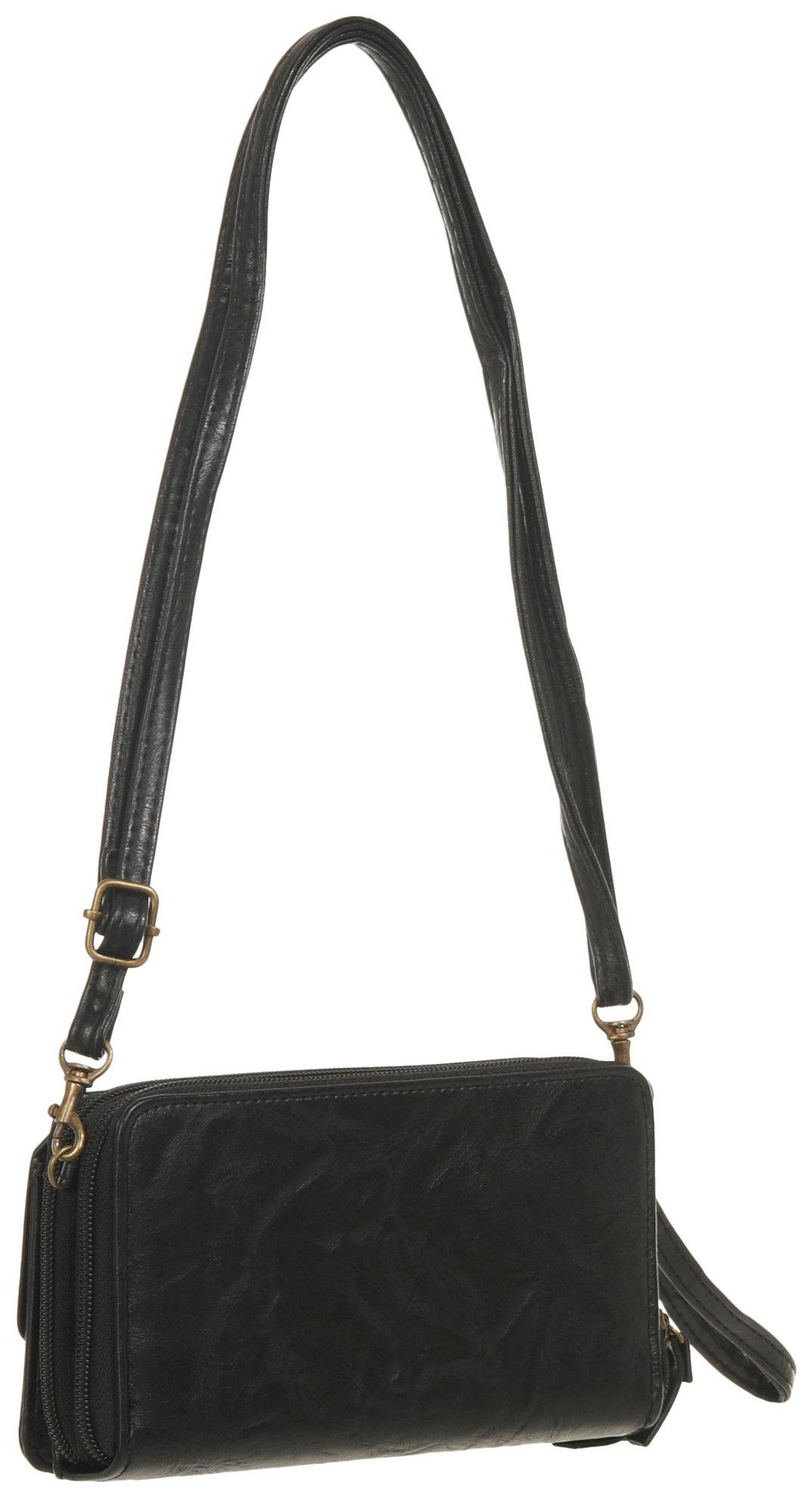 This Wilshire Ring Crossbody Bag features a durable, wrinkled texture, vegan leather fabrication, a front flap snap pocket with ring detail, an adjustable removable crossbody strap, a removable wristlet strap, and dual zip-around closures. The lined interior includes eighteen card slots, one window id slot, one zip compartment, five slip pockets, and one currency compartment. Measures approximately 8 in. L x 2 in. W x 5 in. H. Strap drop measures approximately 24 in.