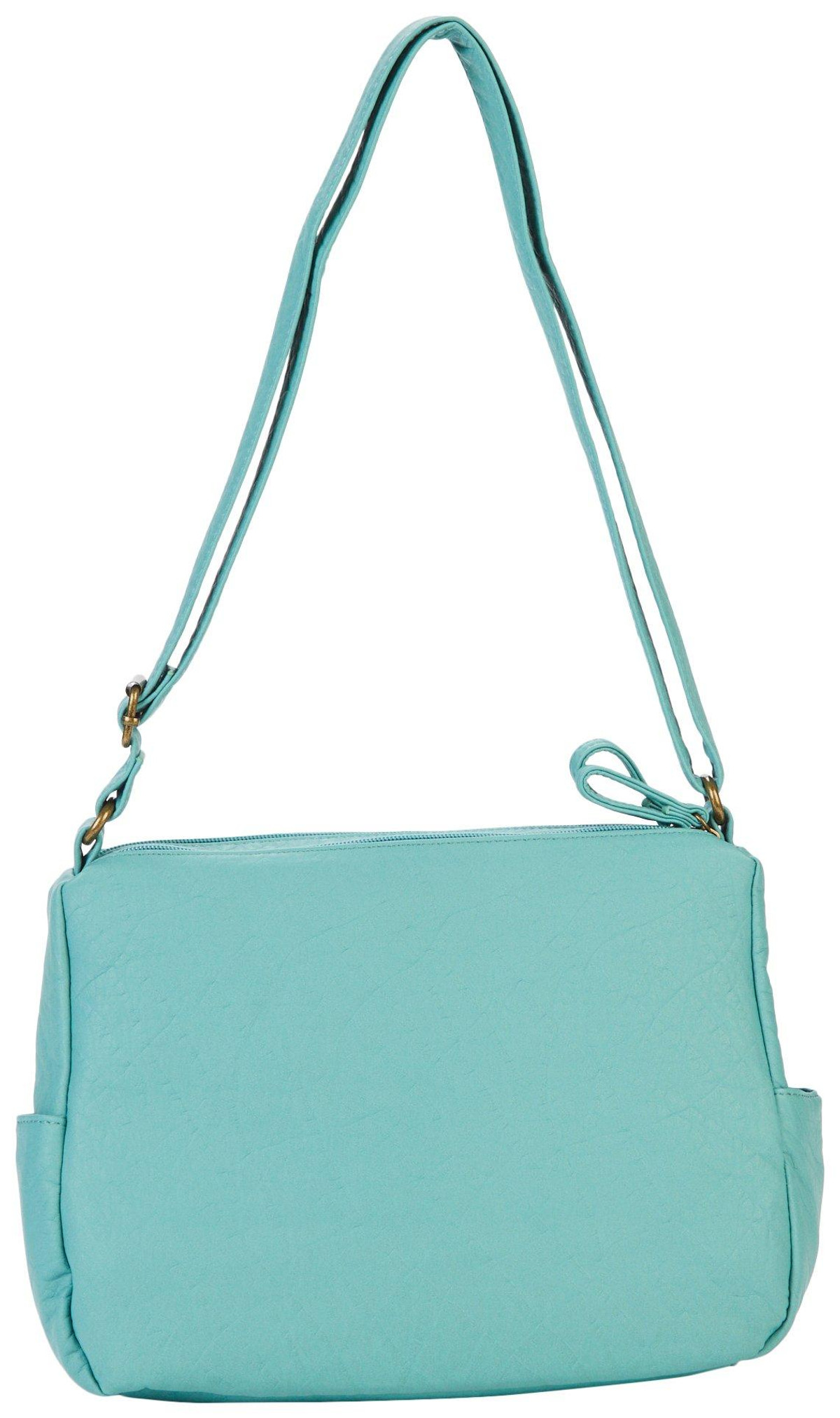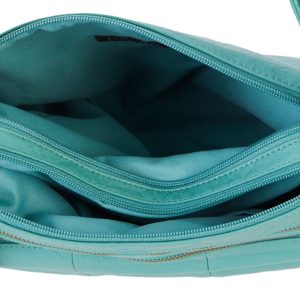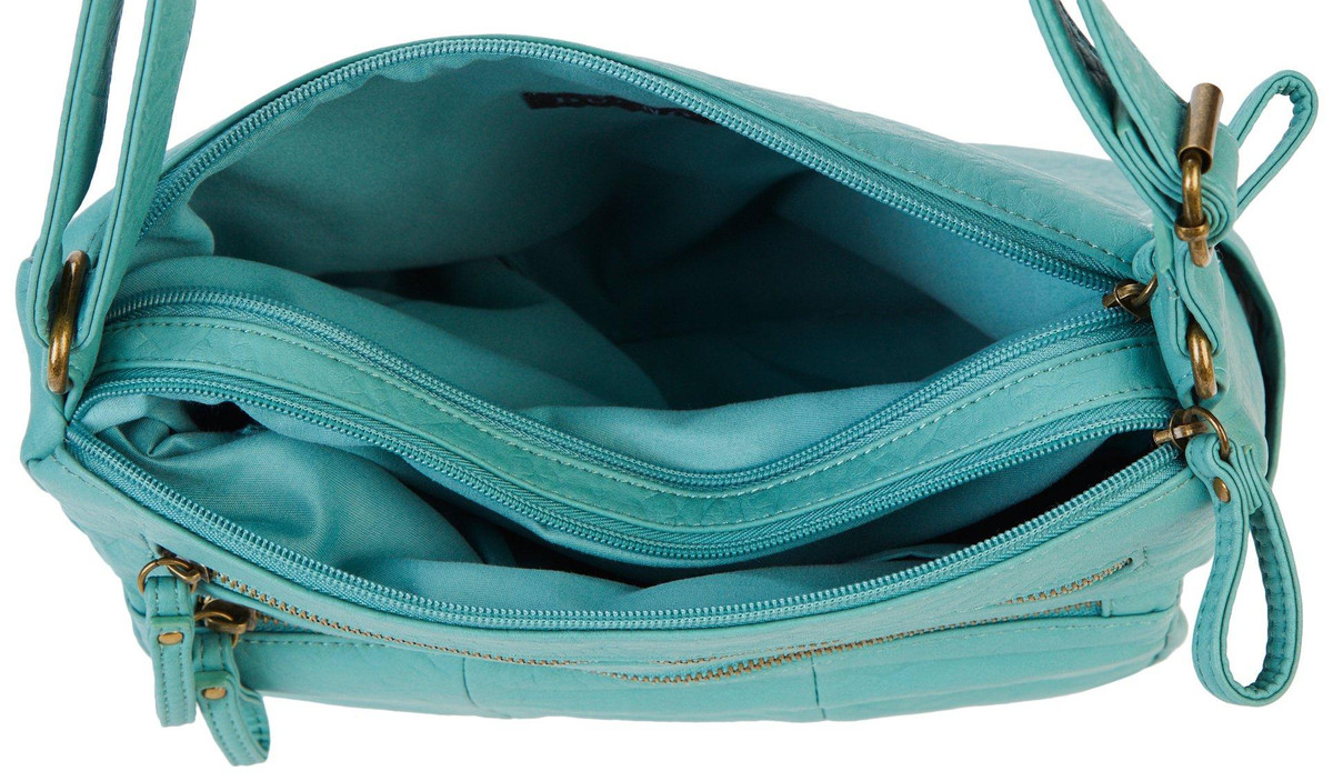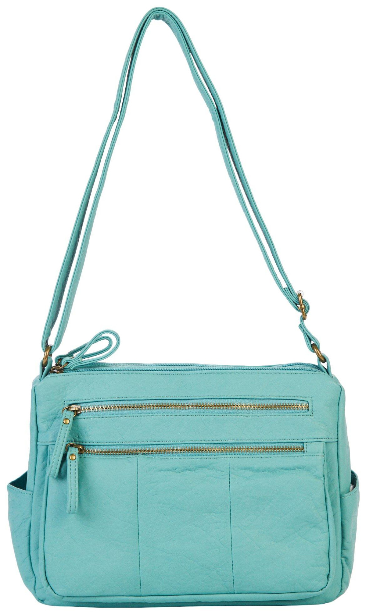 This crossbody purse is approximately 12 wide 8.5 high and 5.5 deep with two main compartments and two zippered pockets on the same side. It includes an adjustable strap and two slip pockets on each end for quick access. Designed for daily use this bag offers smart organization and a stylish compact shape perfect for travel errands or everyday wear.