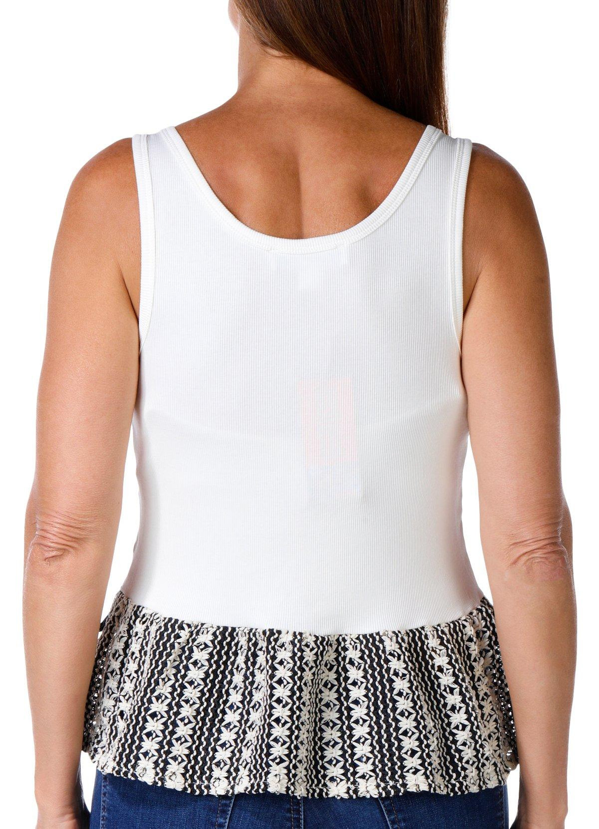 Turn heads this summer with this bold and breezy tank top, featuring a flattering scoop neck and a playful peplum bottom. The black and white striped pattern adds a modern edge, while the crochet ruffled flare brings in a touch of handcrafted charm. Lightweight and versatile, its perfect for warm daysand easy to dress up with statement jewelry or a sleek jacket for a night out. Style meets comfort in one standout piece.