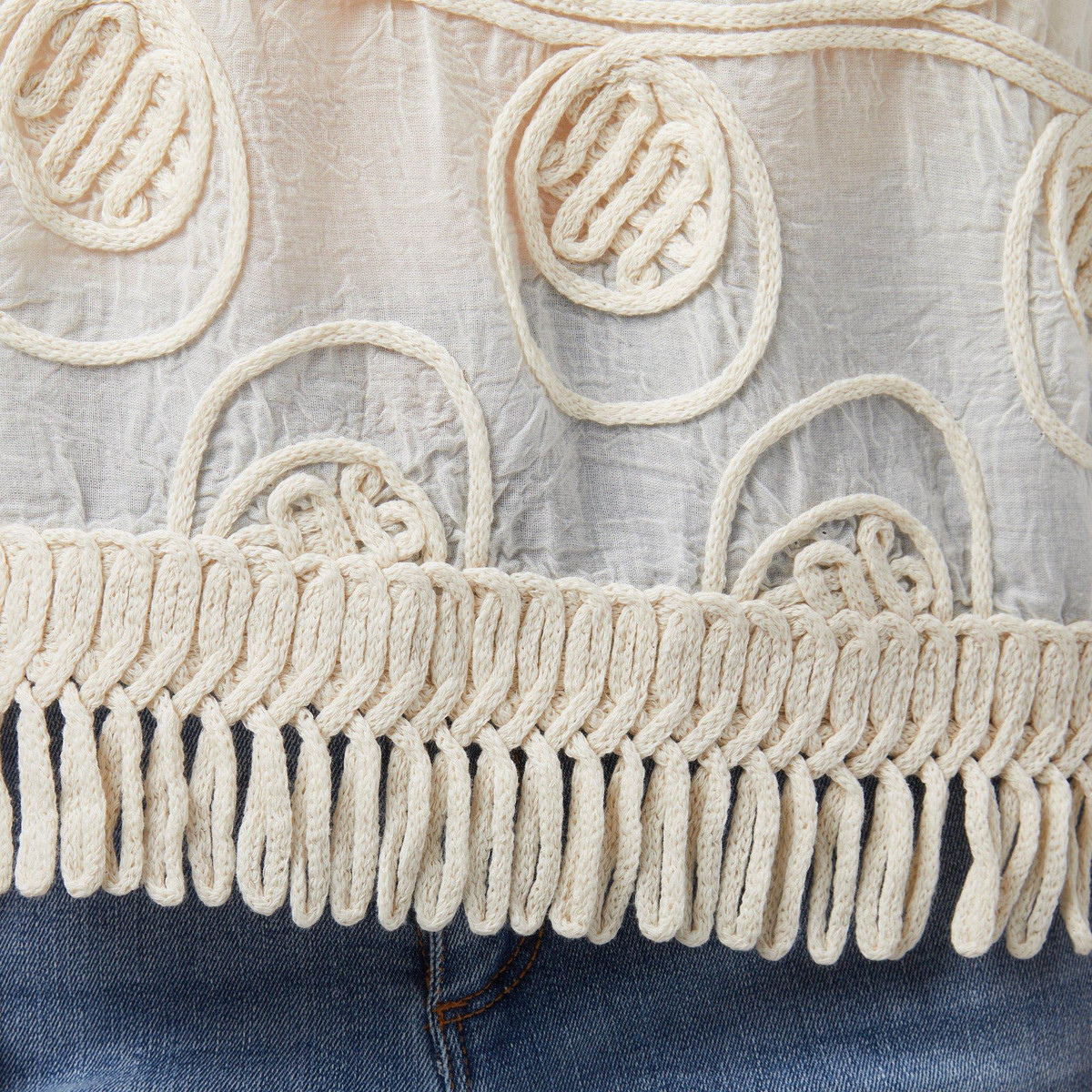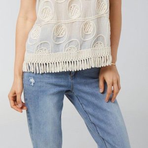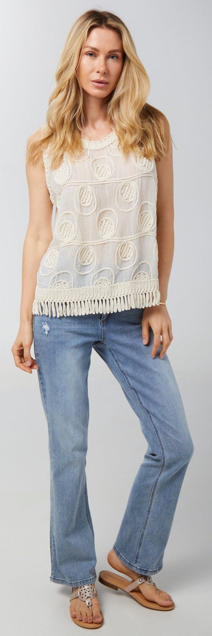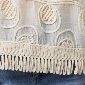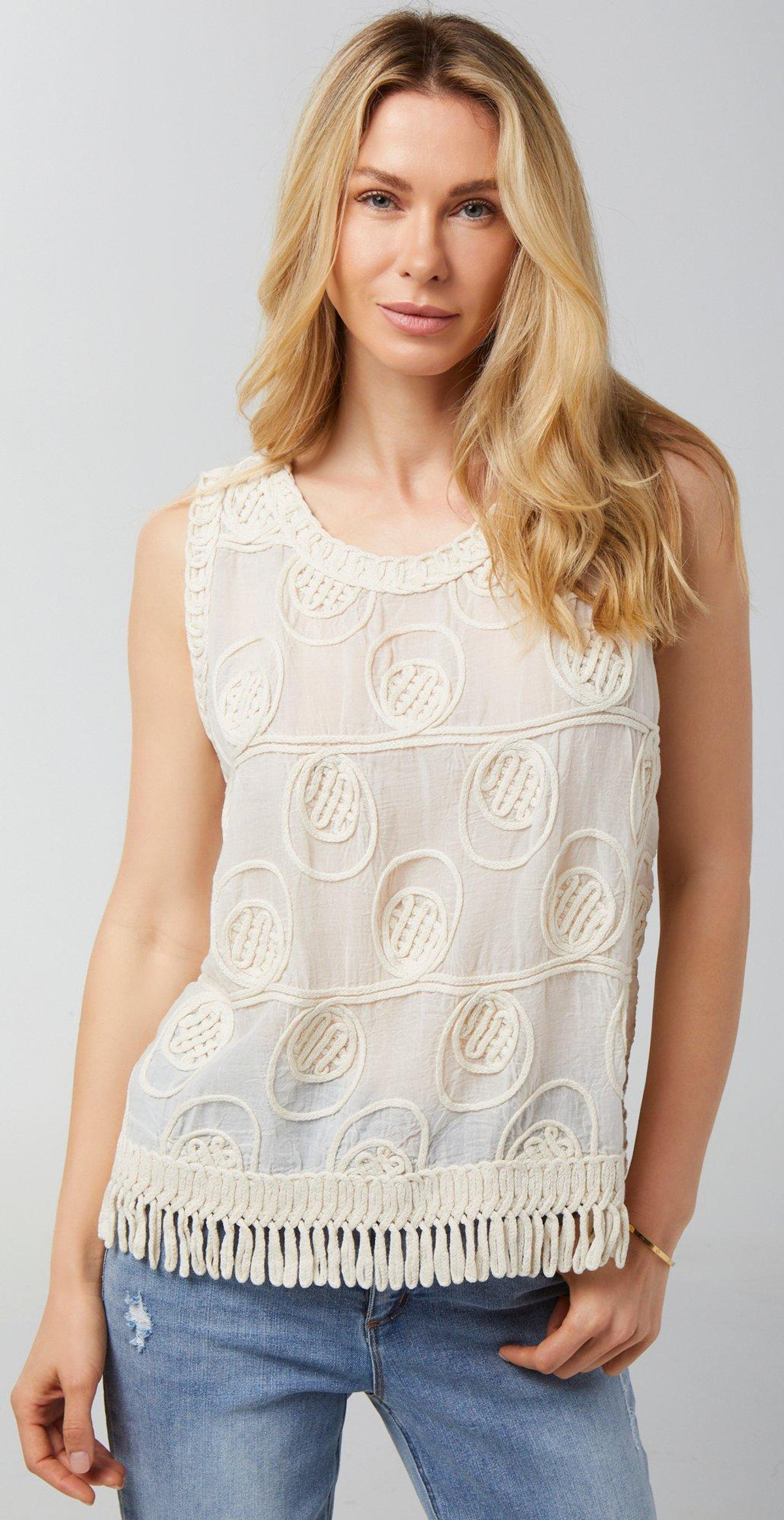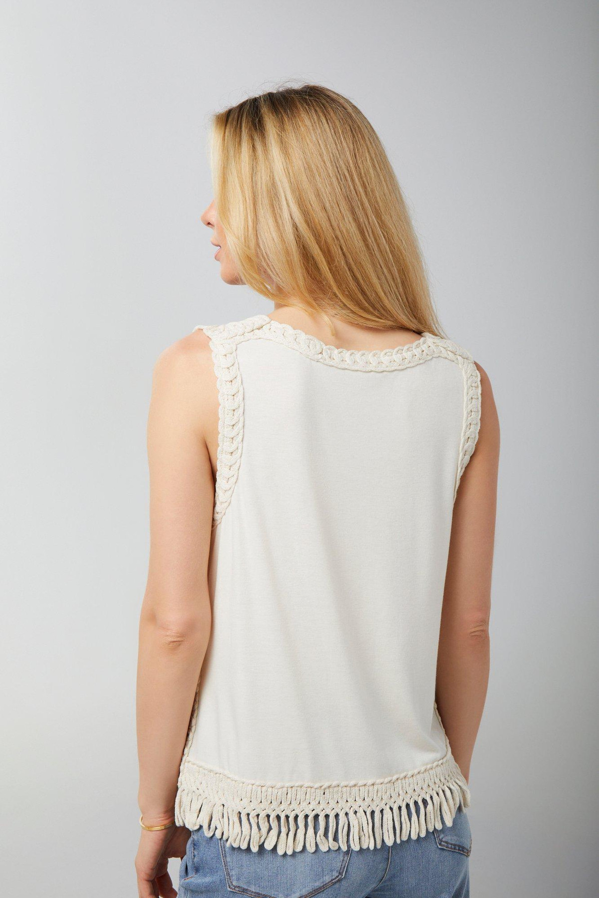 Channel laid-back charm in this Sleeveless Top, featuring a soft cotton base with a beautifully detailed crochet overlay and playful fringe accents. Fully lined for comfort, it blends texture and movement for a look thats effortlessly cool and endlessly versatile, perfect for sunny days and festival vibes. Top length measures approximately 24 in.