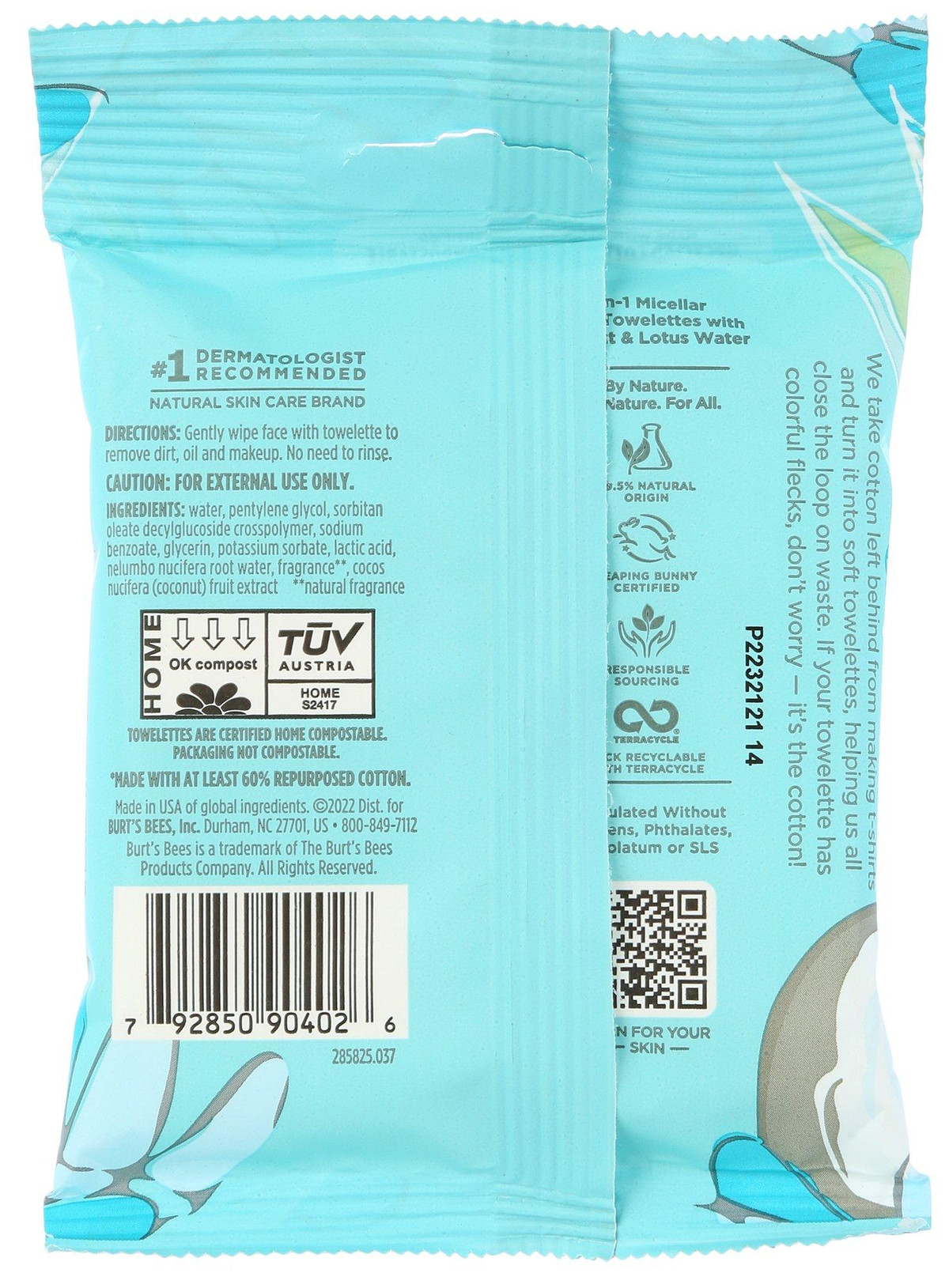 These Coconut & Lotus Water Makeup Removal Towelettes remove makeup, cleanse, and hydrate skin without harsh rubbing or rinsing. Made with upcycled cotton, home compostable, suitable for all skin types. Includes 10 pre-moistened towelettes 6.9 in. x 6.2 in..