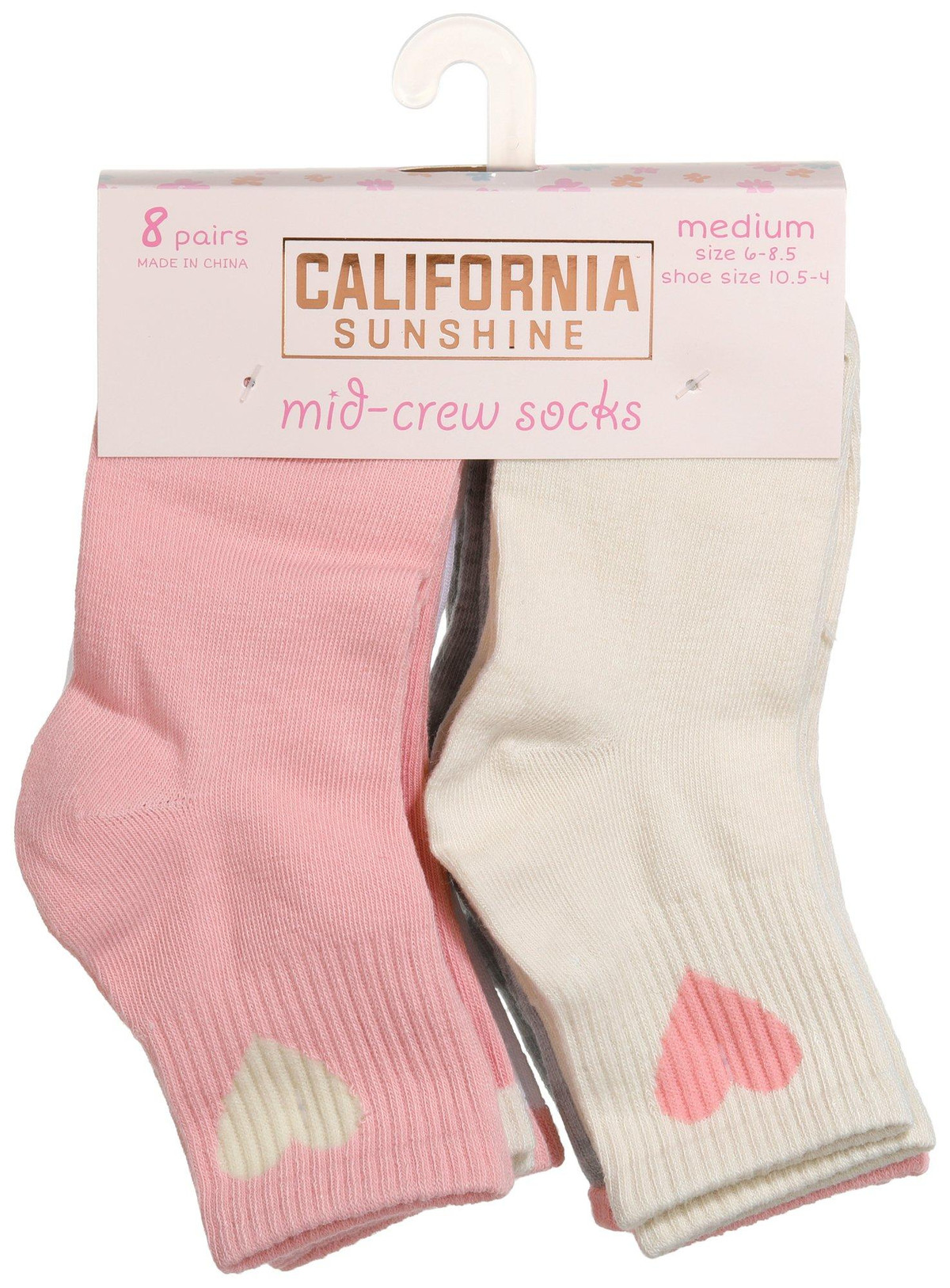 Keep your feet cozy and stylish with the Girls 8 Pk Mid Crew Socks. Made from a soft blend of polyester and spandex, these socks offer comfort and durability. Featuring an adorable heart design, they add a fun touch to any outfit. Perfectly sized to fit girls’ shoe sizes 10.5T-4Y, these mid-crew socks are ideal for everyday wear. Enjoy the perfect combination of style and comfort with this cute and practical sock set.