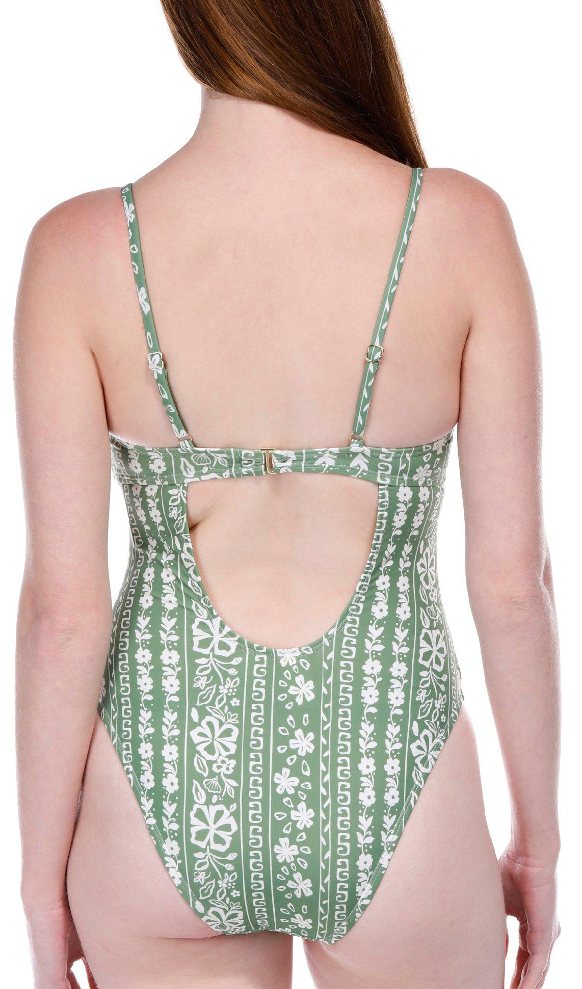 This one piece swimsuit features a chic lace front design, perfect for lounging by the pool or a day at the beach. Fabrication is 82% nylon, 18% spandex.
