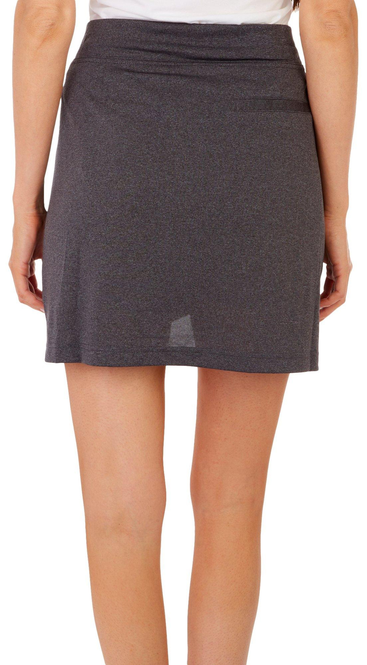 This pro-spin skort features a heathered color design on lightweight stretch fabric, an elastic waistband with mesh detail for breathability, two front pockets, one back pocket, and a built-in short. The inseam measures approximately 4 in. Length of skort approximately 16 in. Fabrication 100% polyester.