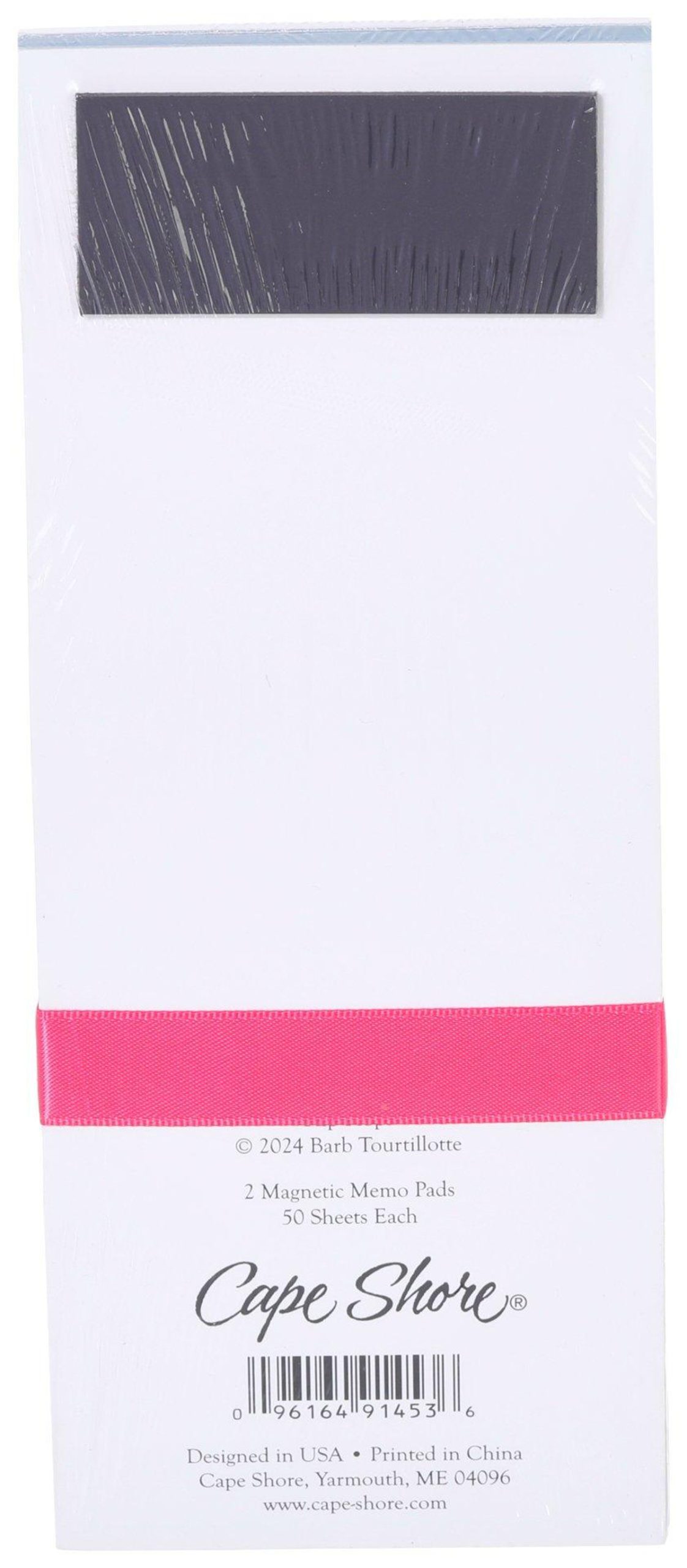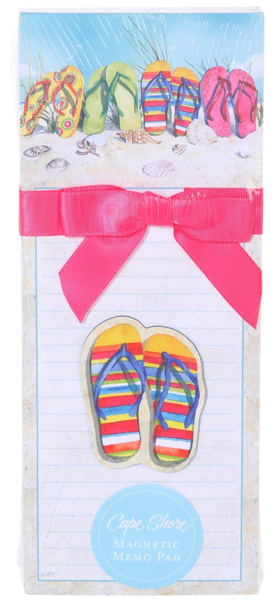 This 2 pack of magnetic memo pads features colorful flip flops on the beach for a fun, coastal touch. Each pad includes a matching flip flop magnet, perfect for holding notes or photos. With magnetic backing, these memo pads stay easily accessible on any metal surface. Measures approximately 8.5 in x 3.5 in.