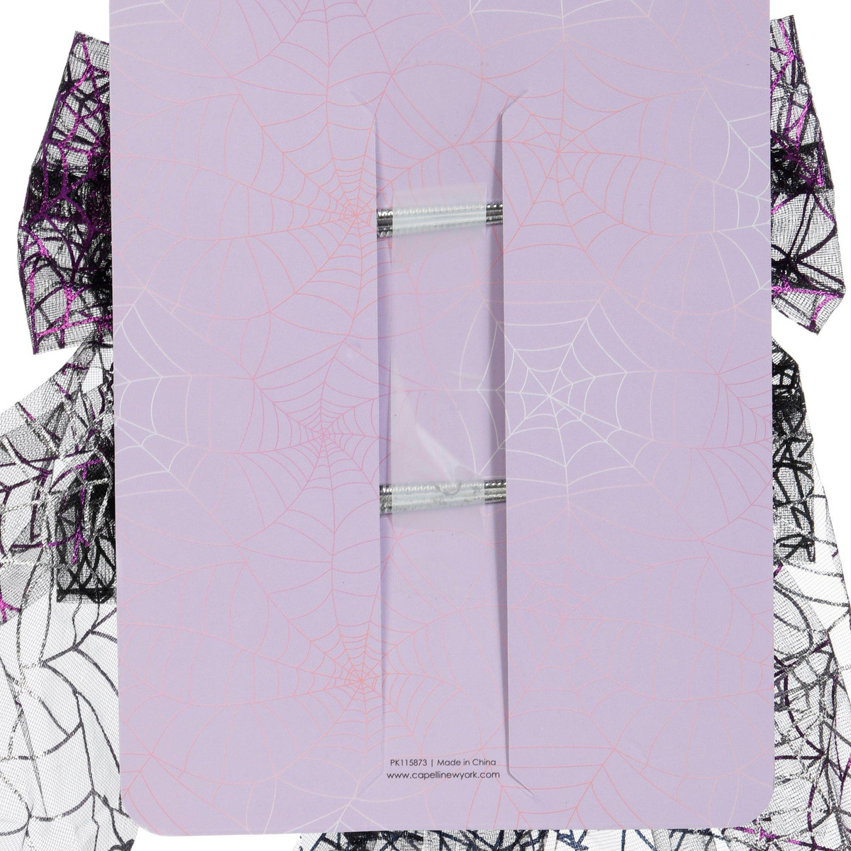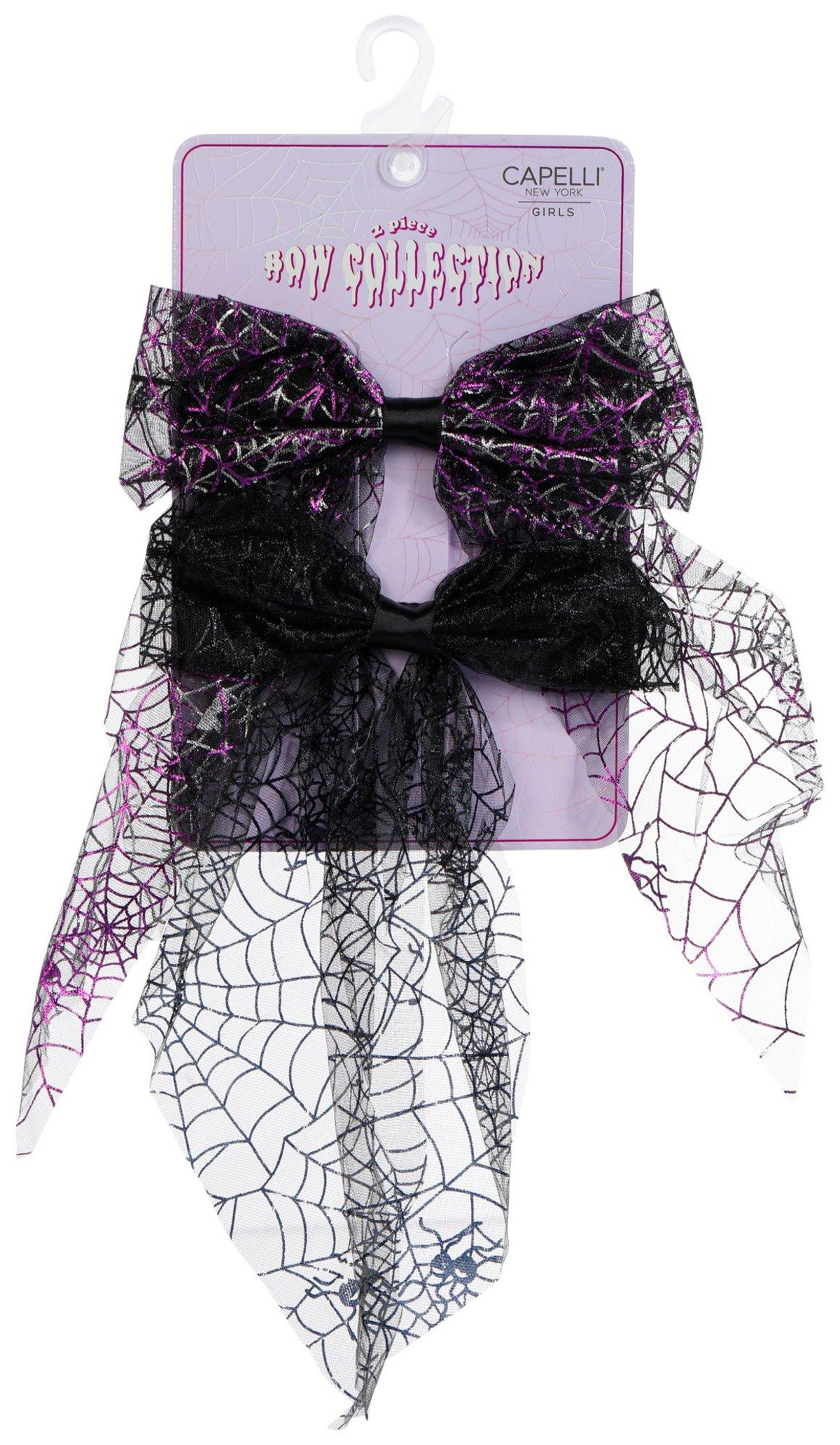 Add festive flair to hairstyles with this 2 pc Halloween Hair Bow Set, featuring one black lace bow and one black with cobweb print in metallic colors. Made from tulle material and secured on metal clips for easy styling. Perfect for costumes, parties, or seasonal wear.